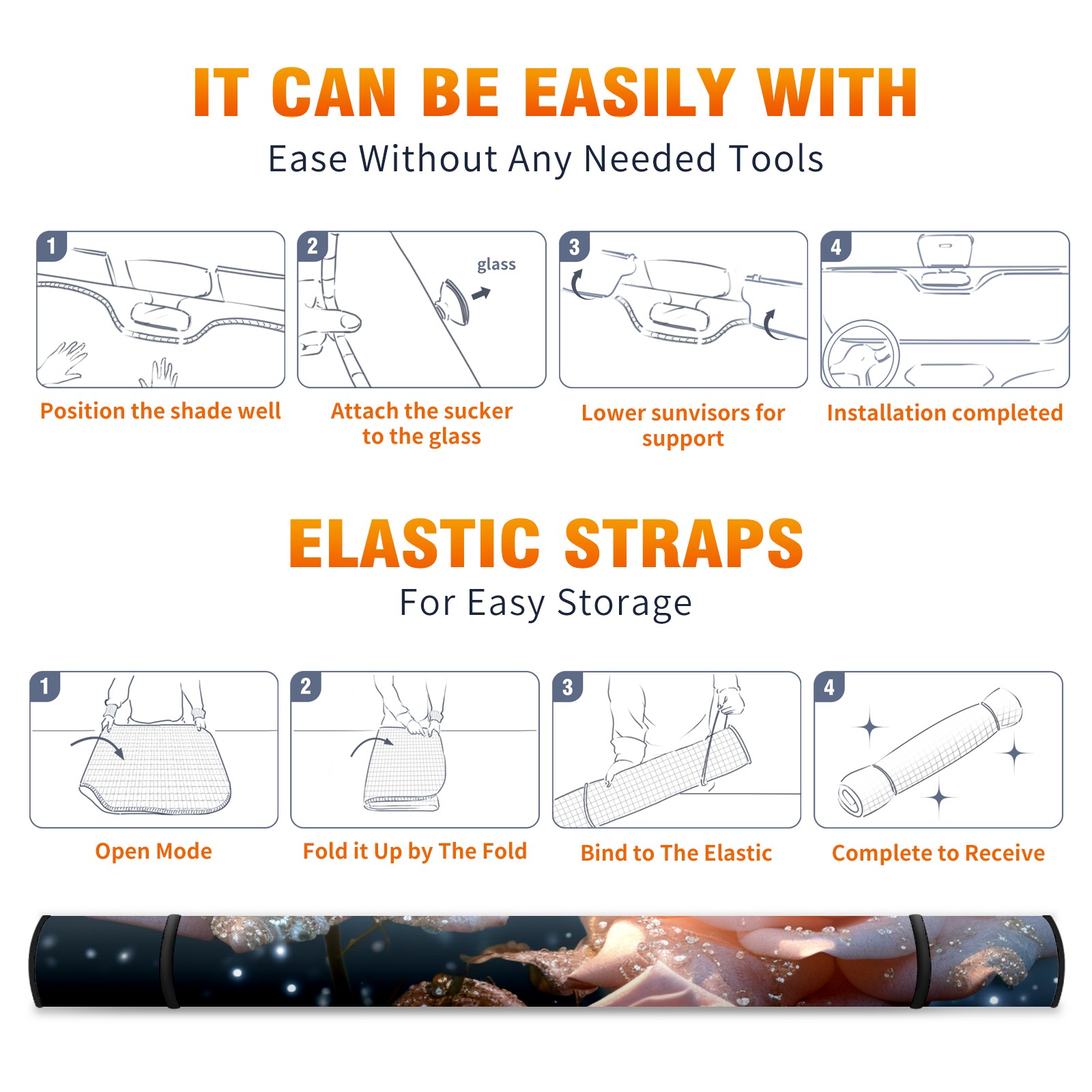 <b>ZXIVGOQFR Foldable Premium Car Windshield Sunshade is your great solution to reduce your car’s interior temperature dramatically! This is definitely a must-have item for your summer travel! </b> <br> ●<b>Size: 63"L x 33.5"W </b> <br></b> ●<b>Blocking Uv Rays & Heat Insulation<br></b> Our vehicle sunshade provides effective UV, sun, and summer heat protection .Maintains dashboards by preventing fading and cracking <br> ●<b>Easy-To-Store Folding Design Makes Storage Convenient <br></b> ZXIVGOQFR car sunshades come with removable suction cups and elastic bands that you can install easily and quickly, and the removable suction cups will not leave any marks on your windows when removed. Within seconds, windshield visor can be installed and removed. When not in use,the front windshield can be easily and effectively placed on the door pocket or the dashboard, which is beautiful and does not take up space in the car.<br> <br> <b>PUT UP A 'PROTECTIVE UMBRELLA' FOR YOUR BELOVED CAR!</b>