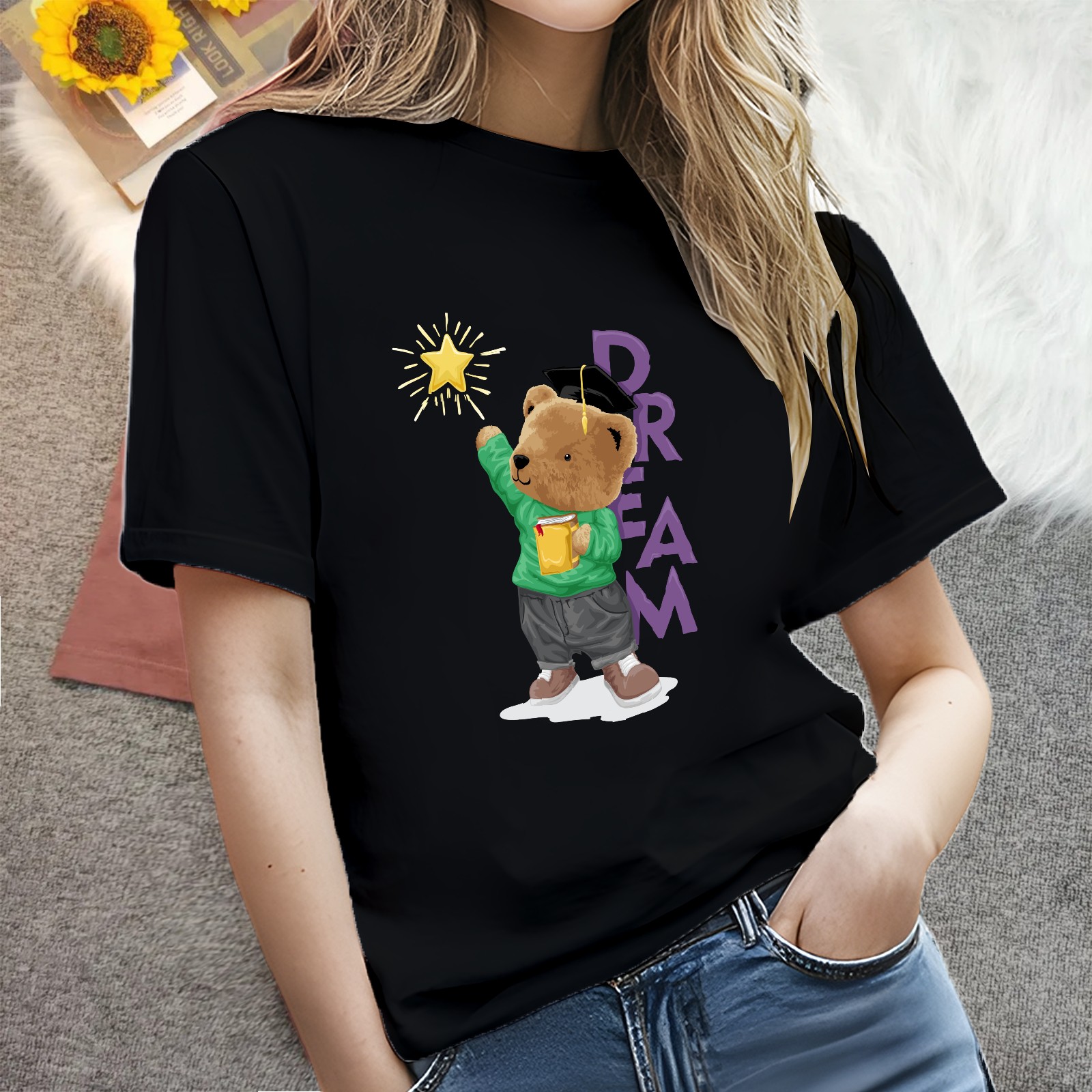 Ladies Pream Casual Versatile Short Sleeve T-shirt Fashion Round Neck T-shirt for Outdoor Daily Wear Suitable As a Holiday Gift for Her