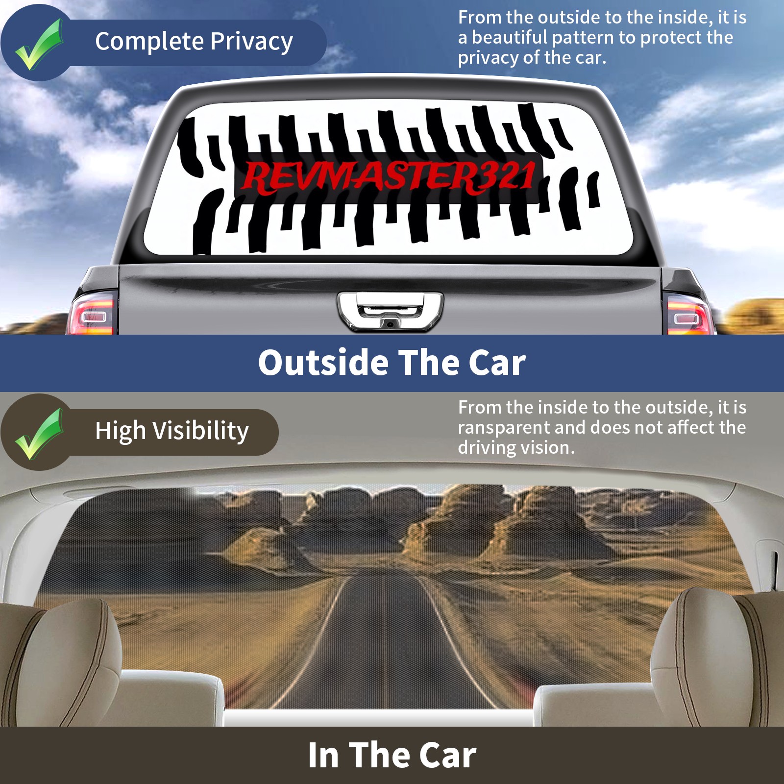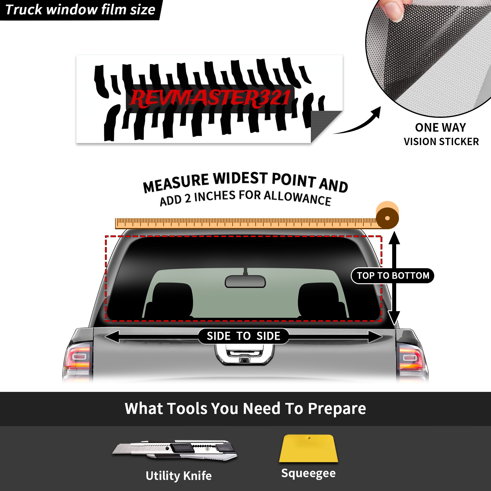 <p><strong>Truck Rear Window Graphics Decals Pickup Trucks Back Window Film Perforated Vinyl Wrap Stickers Decorations for Car Truck Back Window</strong></p> <p><strong><br></strong></p> <p><strong>Features :</strong></p> <p>- High quality perforated vinyl window film.</p> <p>- Installed on the outside of the rear window, see through from the inside.</p> <p>- Clear printing.</p> <p>- The truck back window graphics stickers fits most truck and makes your vehicle unique.&nbsp;</p> <p><br></p> <p><strong>【Installation Instructions】</strong></p> <p><strong>1. CLEAN SURFACE -</strong> Clean the back window and make sure the surface clean.</p> <p><strong>2. STICK THE DECALS -</strong> Tear off the paper on the back and stick the decal on the window.</p> <p><strong>3. SCRAPE OFF AIR BUBBLES -</strong> Use a squeegee or other card to scrape off the excess air bubbles.</p> <p><strong>4. TRIM THE EXCESS -</strong> Use a knife to cut off the excess stickers of the window, finally complete.</p> <p><br></p> <p>1. Measure the window size before purchasing, back window graphics decal for truck can be cut to your desired size.</p> <p>2.The graphics decals for truck back window is a great gift for birthdays, Halloween, and Christmas for friends and family.</p>