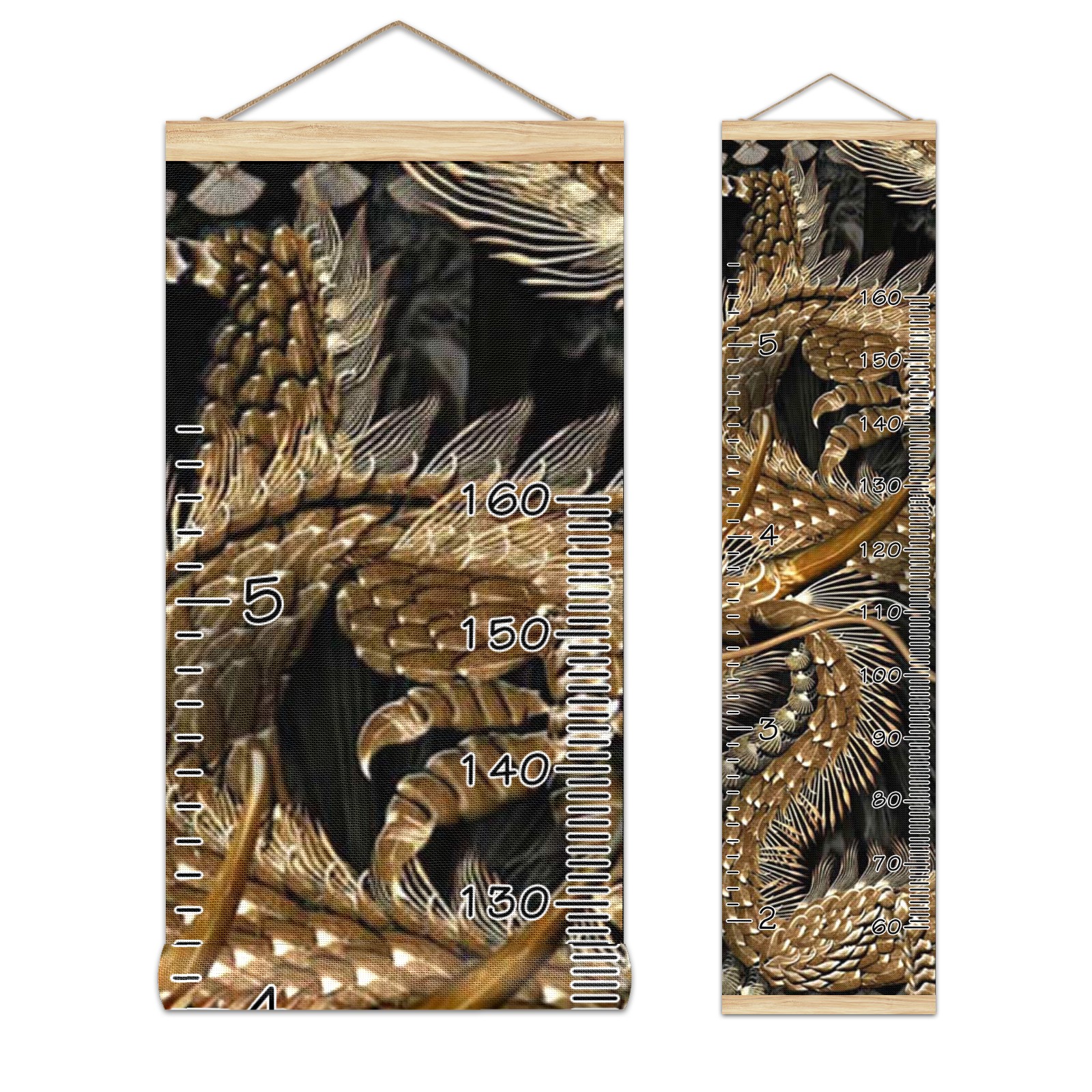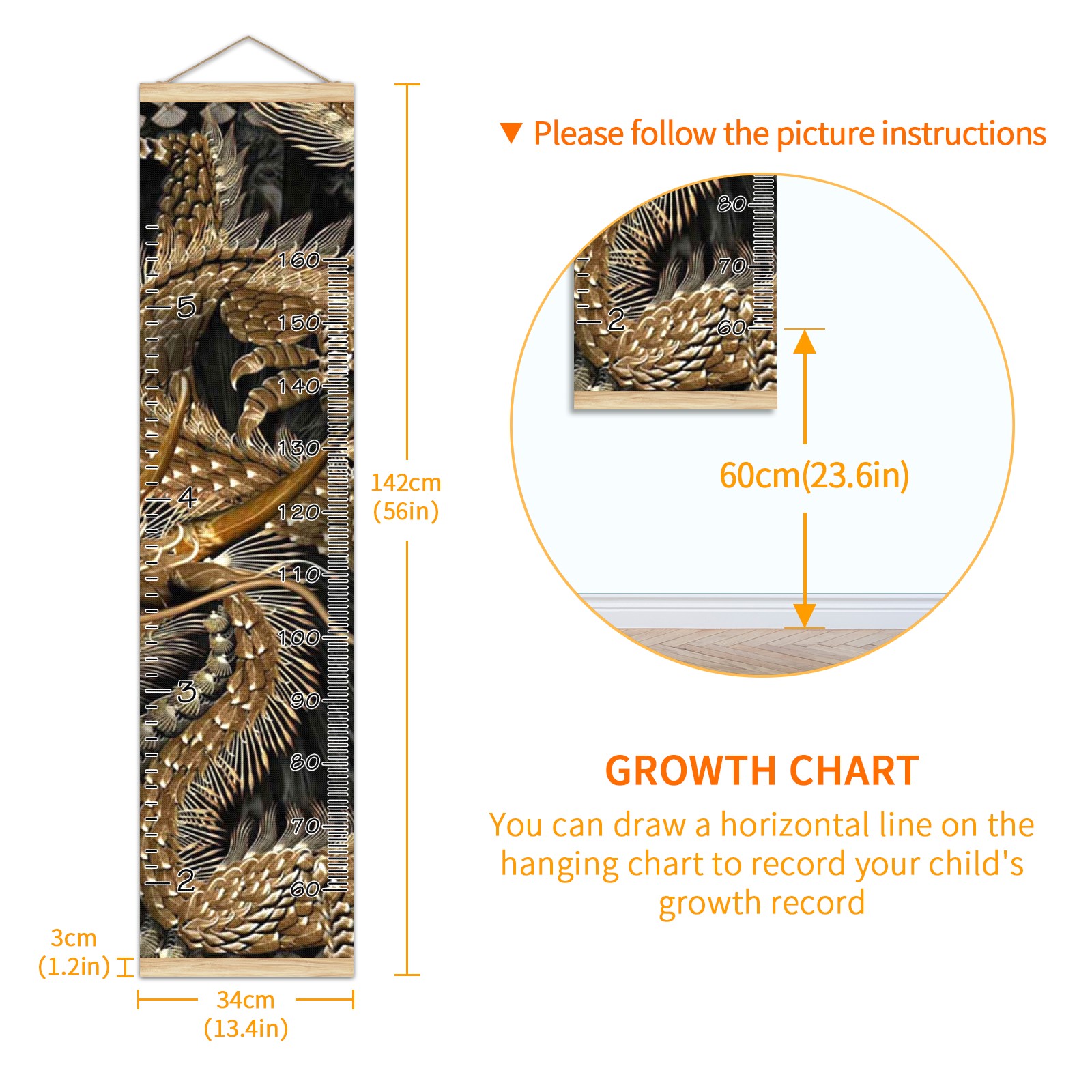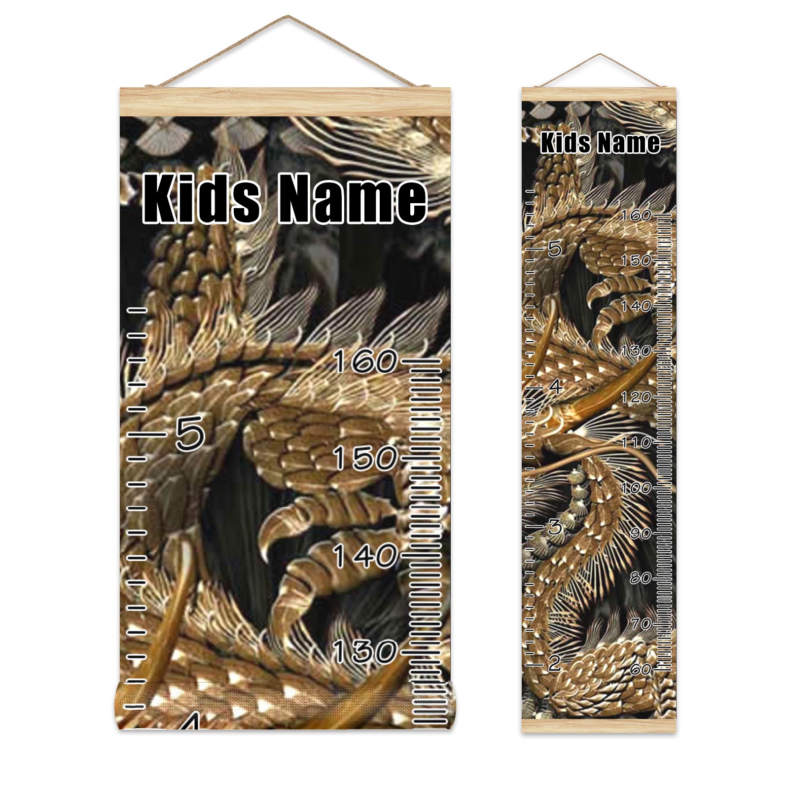 Personalized Kids Name Growth Chart Ruler for Wall Wood Frame Canvas Height Measure Chart 13.4x56 in Hanging Growth Chart Taditional Chinese Golden Dragon Boys Girls Room Decor