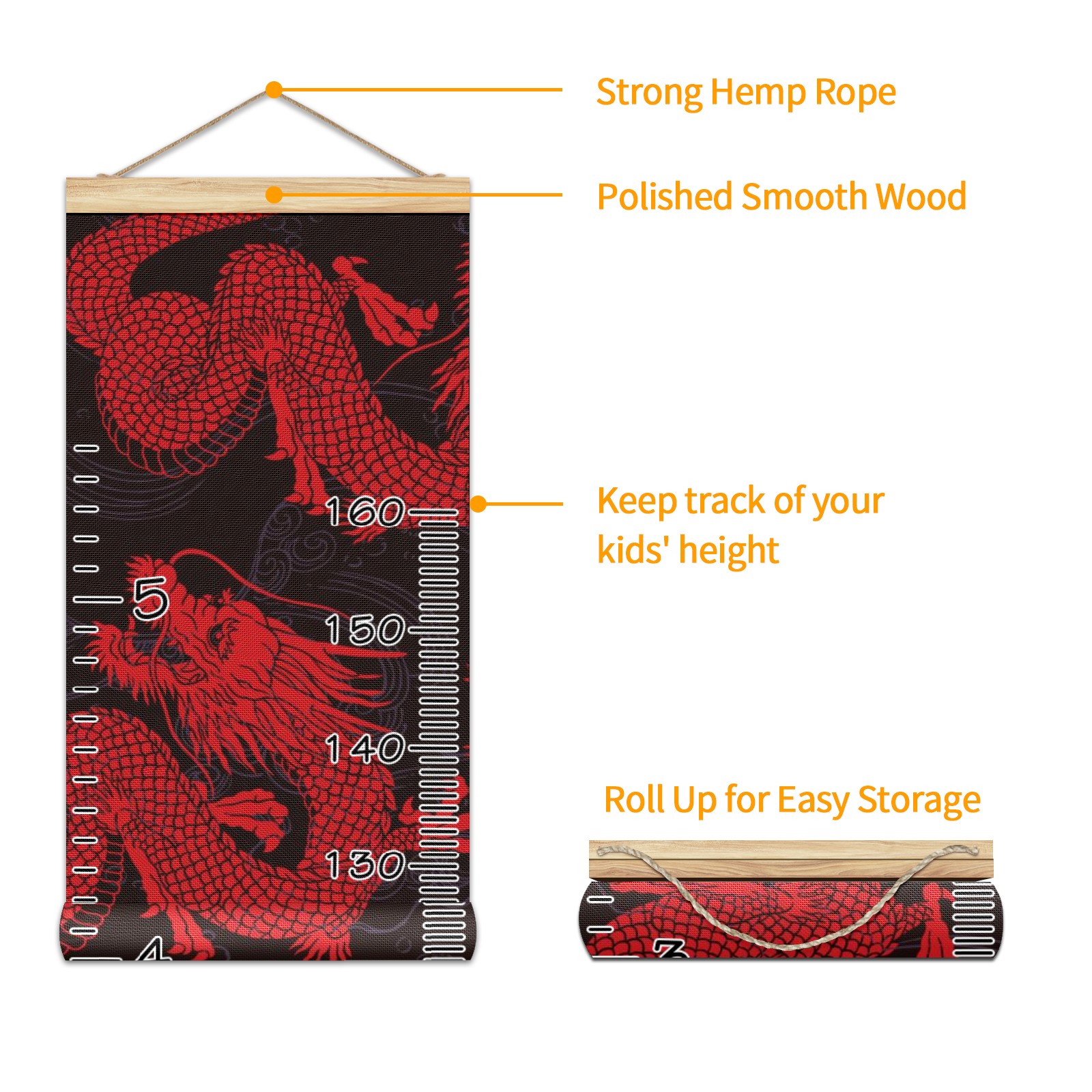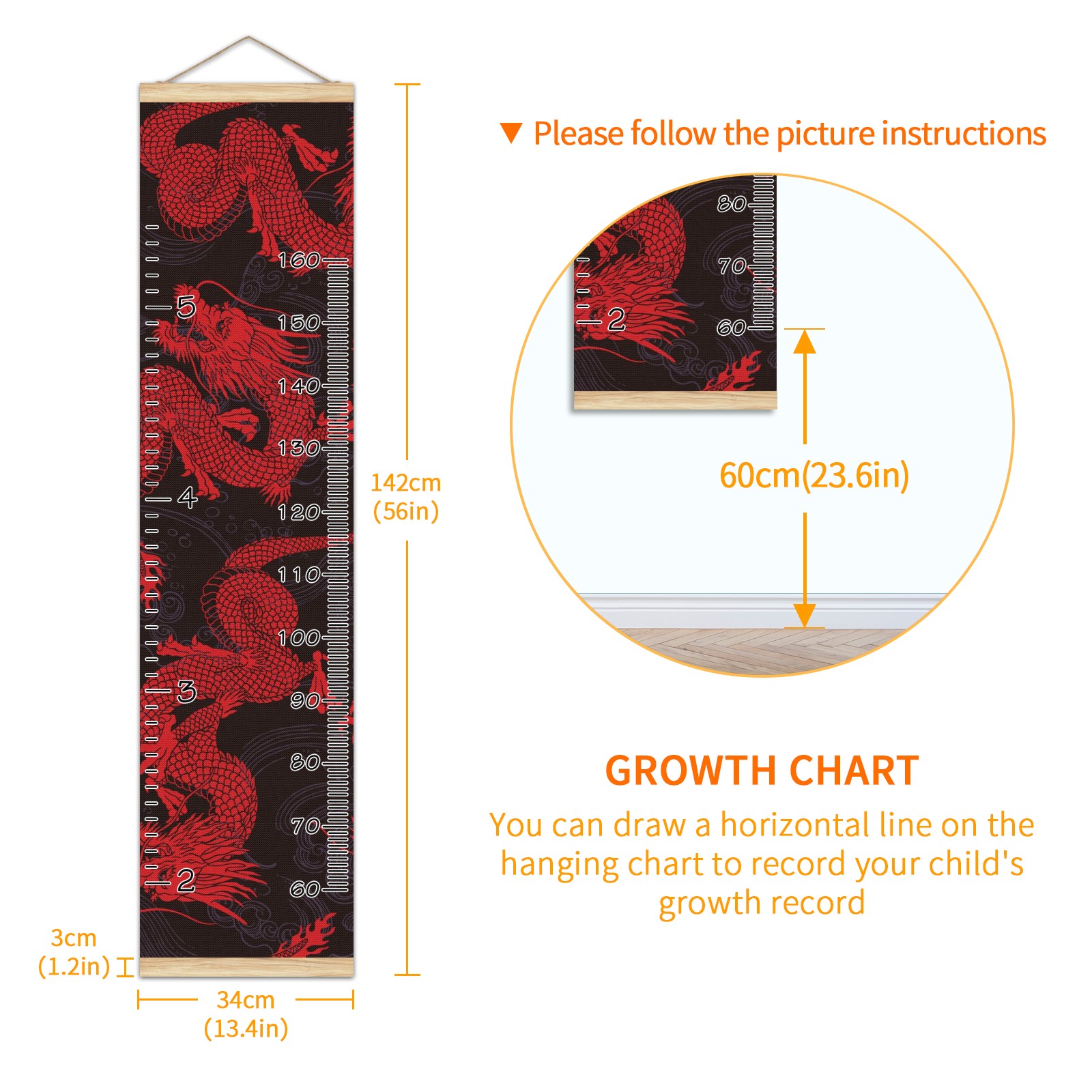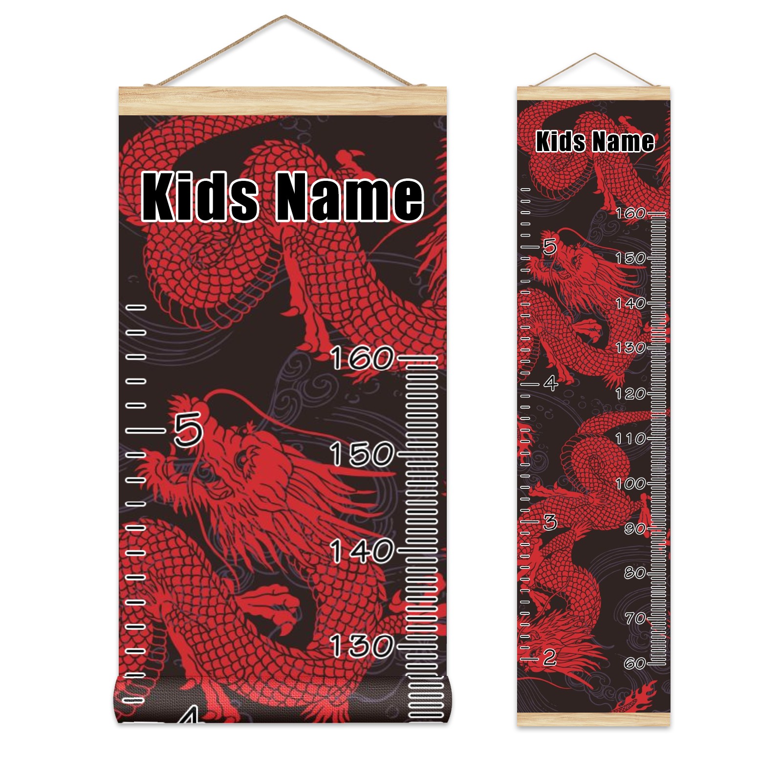 Personalized Kids Name Growth Chart Ruler for Wall Wood Frame Canvas Height Measure Chart 13.4x56 in Hanging Growth Chart Retro Red Chinese Dragon Boys Girls Room Decor