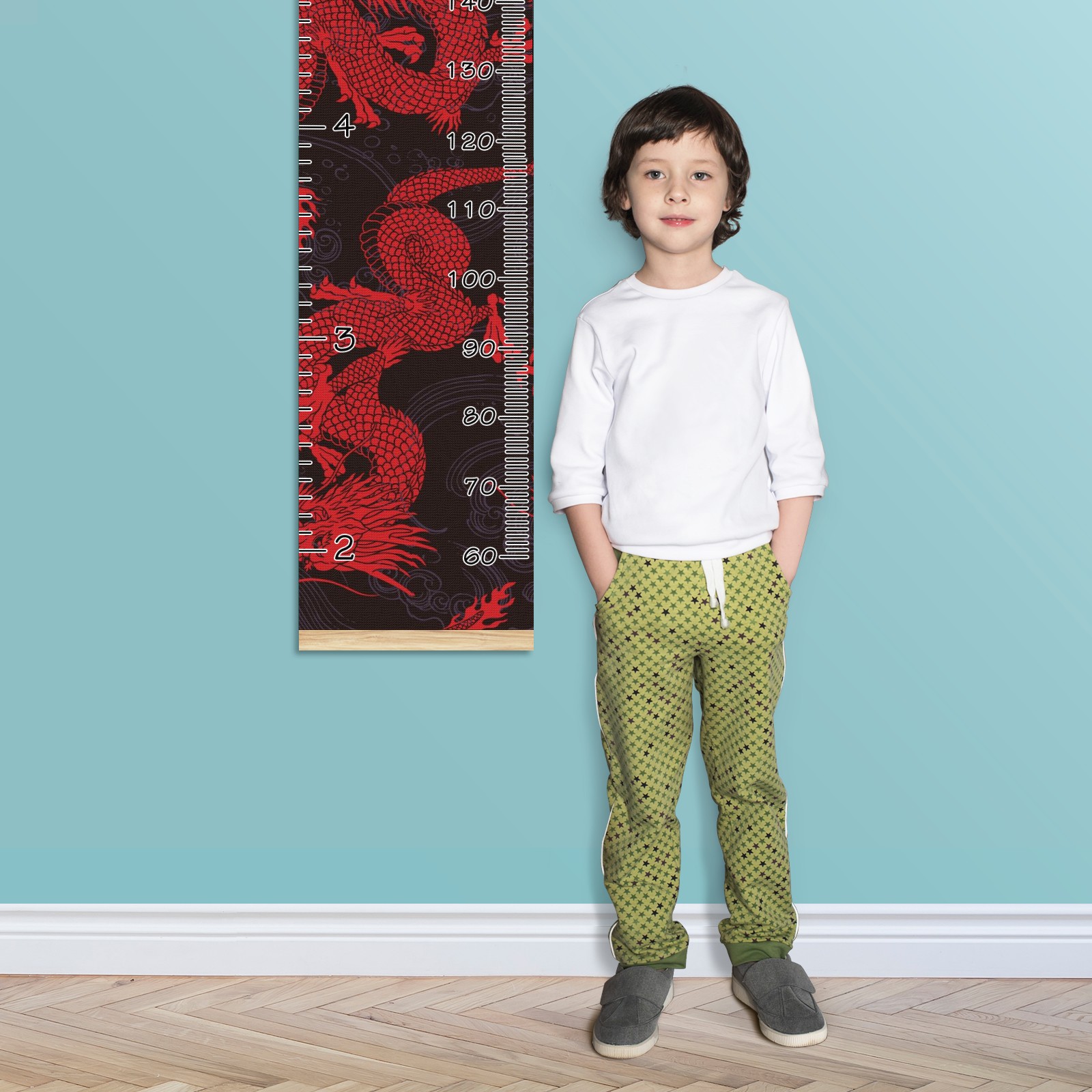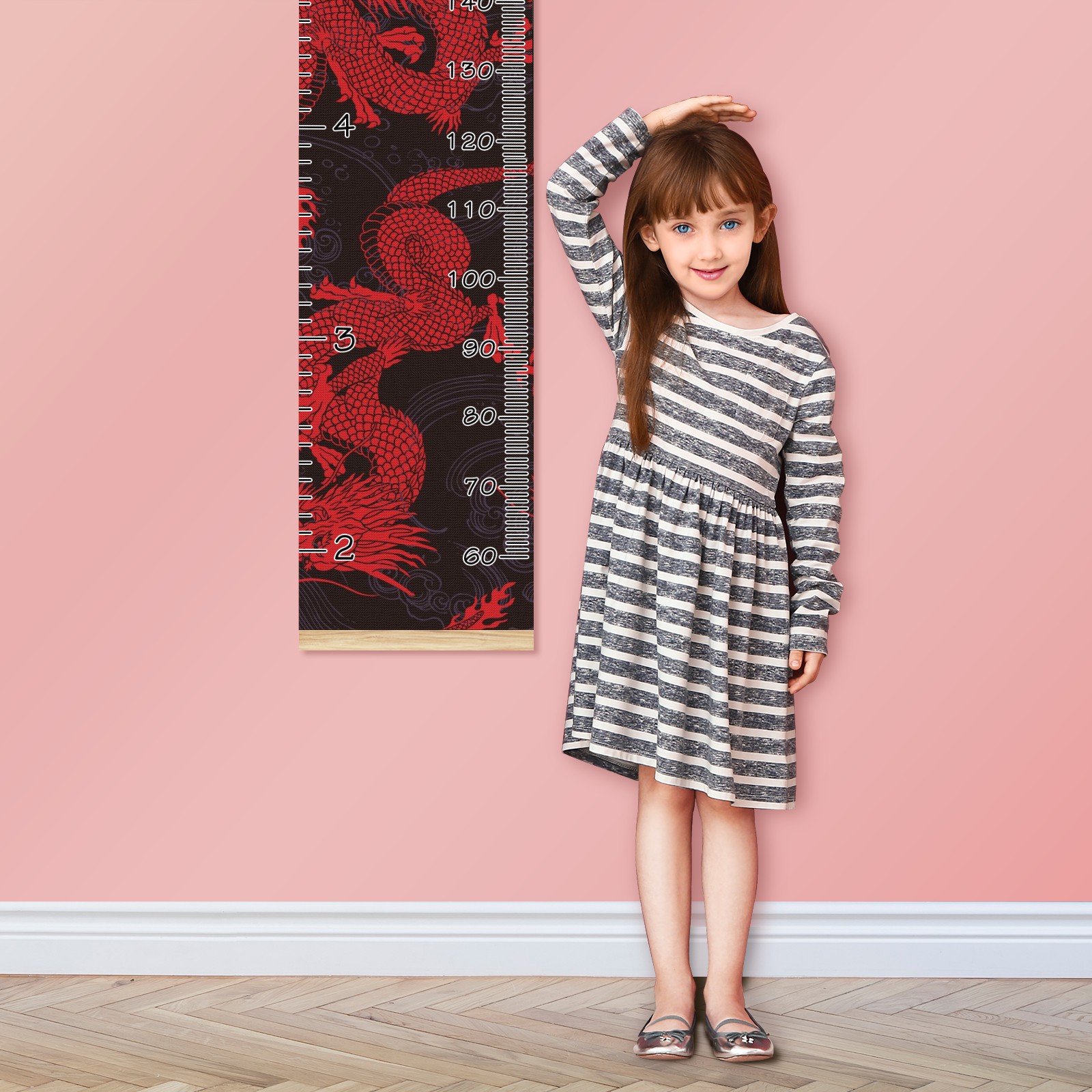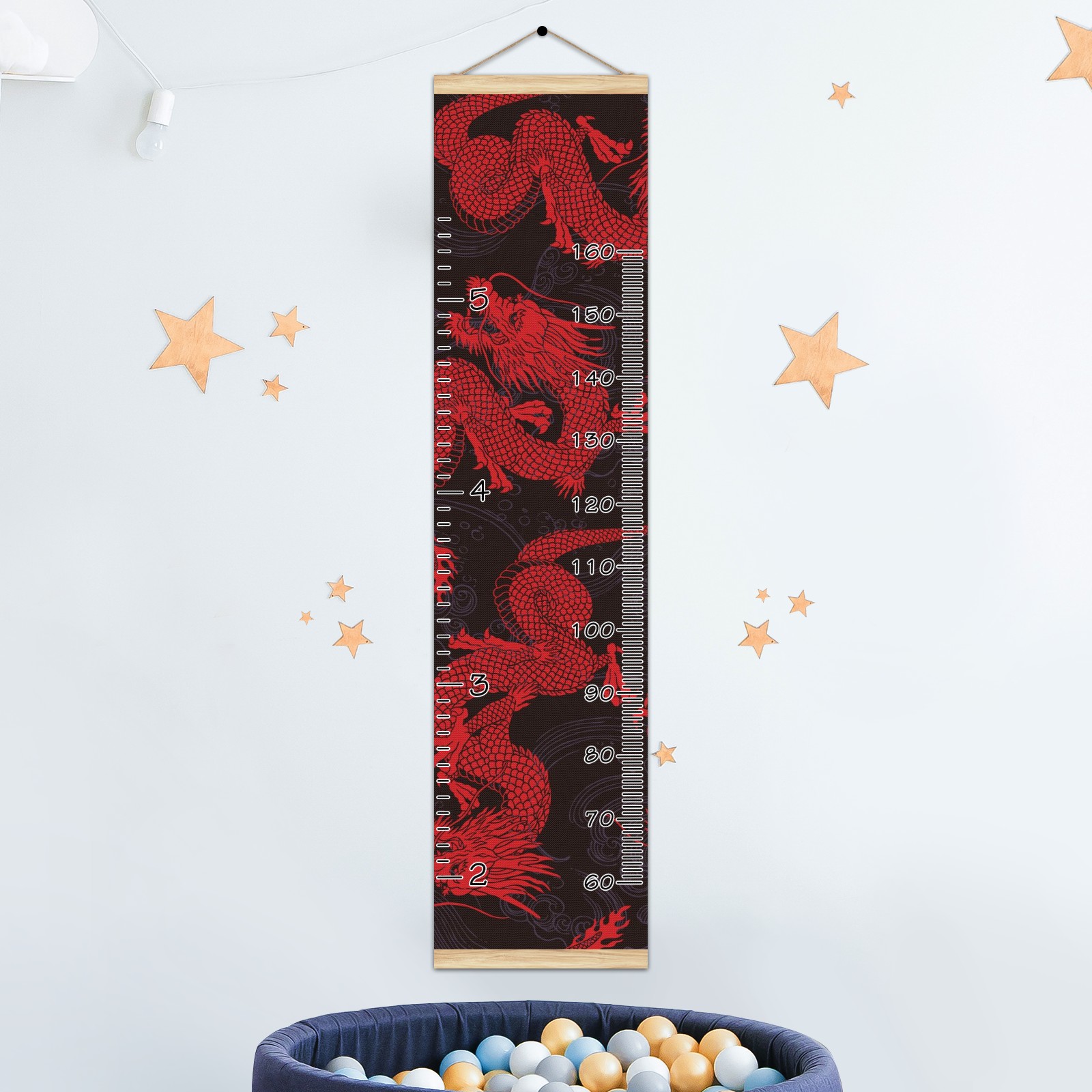 Personalized Kids Name Growth Chart Ruler for Wall Wood Frame Canvas Height Measure Chart 13.4x56 in Hanging Growth Chart Retro Red Chinese Dragon Boys Girls Room Decor