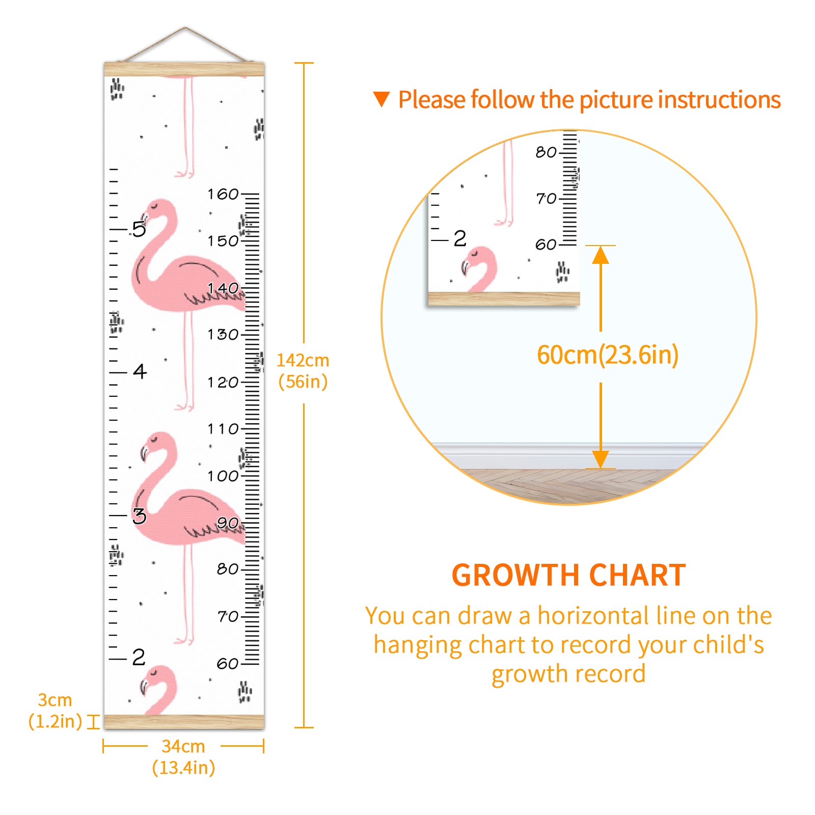 <p><b>Baby height growth chart can be used anywhere</b></p><p>Ideal for kids nursery decoration, kids bedroom, interior walls or windows, playroom, living room, homedecoration.Add name and make the growth chart special!</p><p><br></p><p><b>Easy to fold and carry</b></p><p>With rope at the top of the growth chart, it is easy to install and remove.You can fold it and unfold any time any where.</p><p><br></p><p><b>Perfect Gift Idea for Kids</b></p><p>Environmental and non-toxic for kids use, it must be a perfect gift for baby, kids, girls, and boys.This is a best choice for your friend who have kids or baby as a popular gift.</p><p><br></p><p><b>Easy to read</b></p><p>Measurement accrate with 2 scales, Centimeters and feet. The letters are big enough, very easy to read.</p><p><br></p><p><b>60cm(23.6inch) Over Ground Design</b></p><p>Not only can protect from dust and other damage, but also will not interfere in floor cleaning.</p><p><br></p><p><b>Features:</b></p><p>Rope for Hanging</p><p>Material: Linen + Wood</p><p>Dimensions: 13.4x56 inches</p><p>Weight: 7.5 once</p><p>Package Included: 1 * Baby Growth Chart</p>