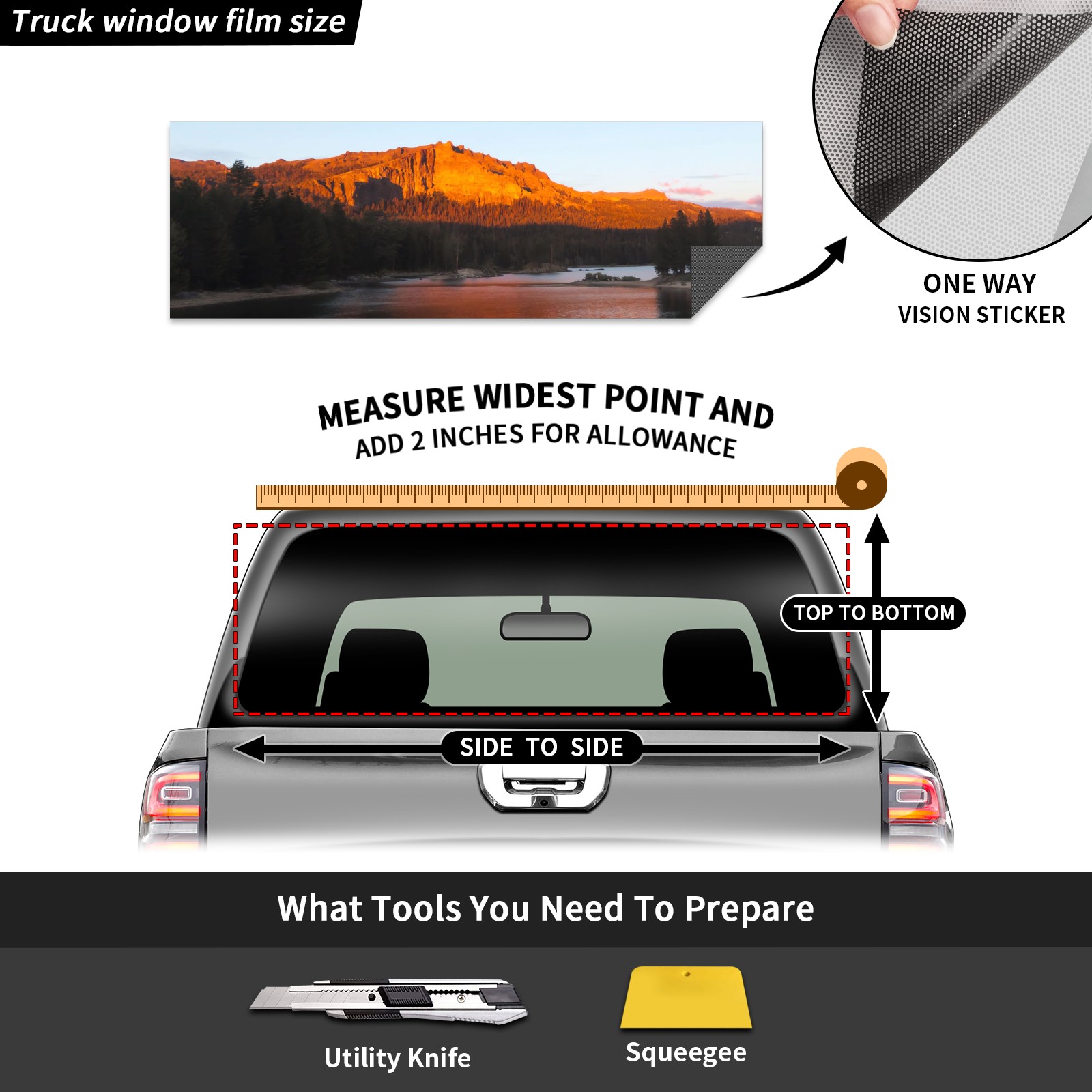 <p><strong>Truck Rear Window Graphics Decals Pickup Trucks Back Window Film Perforated Vinyl Wrap Stickers Decorations for Car Truck Back Window</strong></p> <p><strong><br></strong></p> <p><strong>Features :</strong></p> <p>- High quality perforated vinyl window film.</p> <p>- Installed on the outside of the rear window, see through from the inside.</p> <p>- Clear printing.</p> <p>- The truck back window graphics stickers fits most truck and makes your vehicle unique.&nbsp;</p> <p><br></p> <p><strong>【Installation Instructions】</strong></p> <p><strong>1. CLEAN SURFACE -</strong> Clean the back window and make sure the surface clean.</p> <p><strong>2. STICK THE DECALS -</strong> Tear off the paper on the back and stick the decal on the window.</p> <p><strong>3. SCRAPE OFF AIR BUBBLES -</strong> Use a squeegee or other card to scrape off the excess air bubbles.</p> <p><strong>4. TRIM THE EXCESS -</strong> Use a knife to cut off the excess stickers of the window, finally complete.</p> <p><br></p> <p>1. Measure the window size before purchasing, back window graphics decal for truck can be cut to your desired size.</p> <p>2.The graphics decals for truck back window is a great gift for birthdays, Halloween, and Christmas for friends and family.</p>