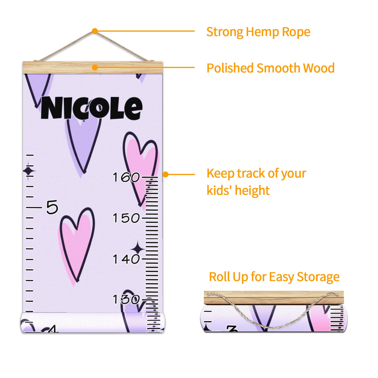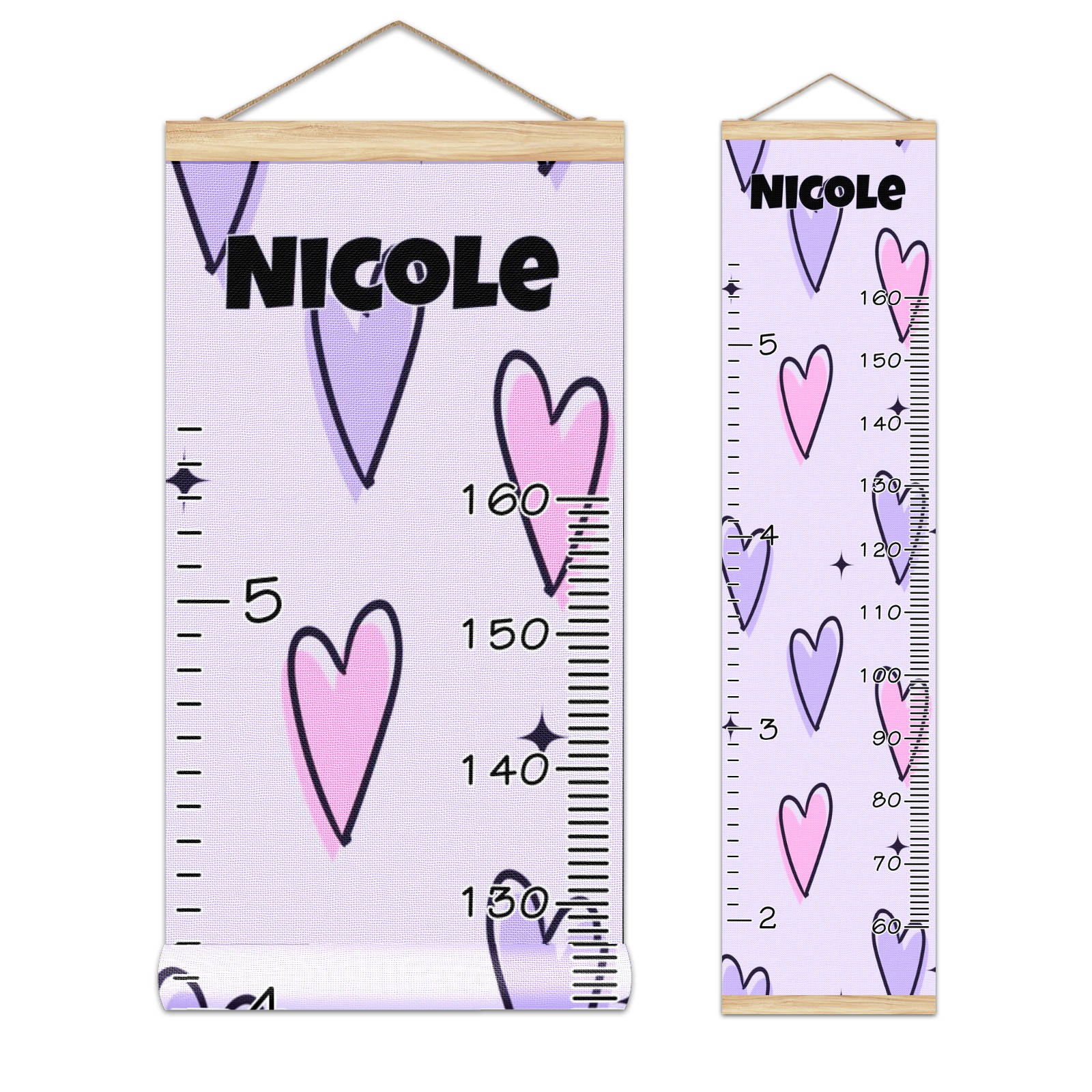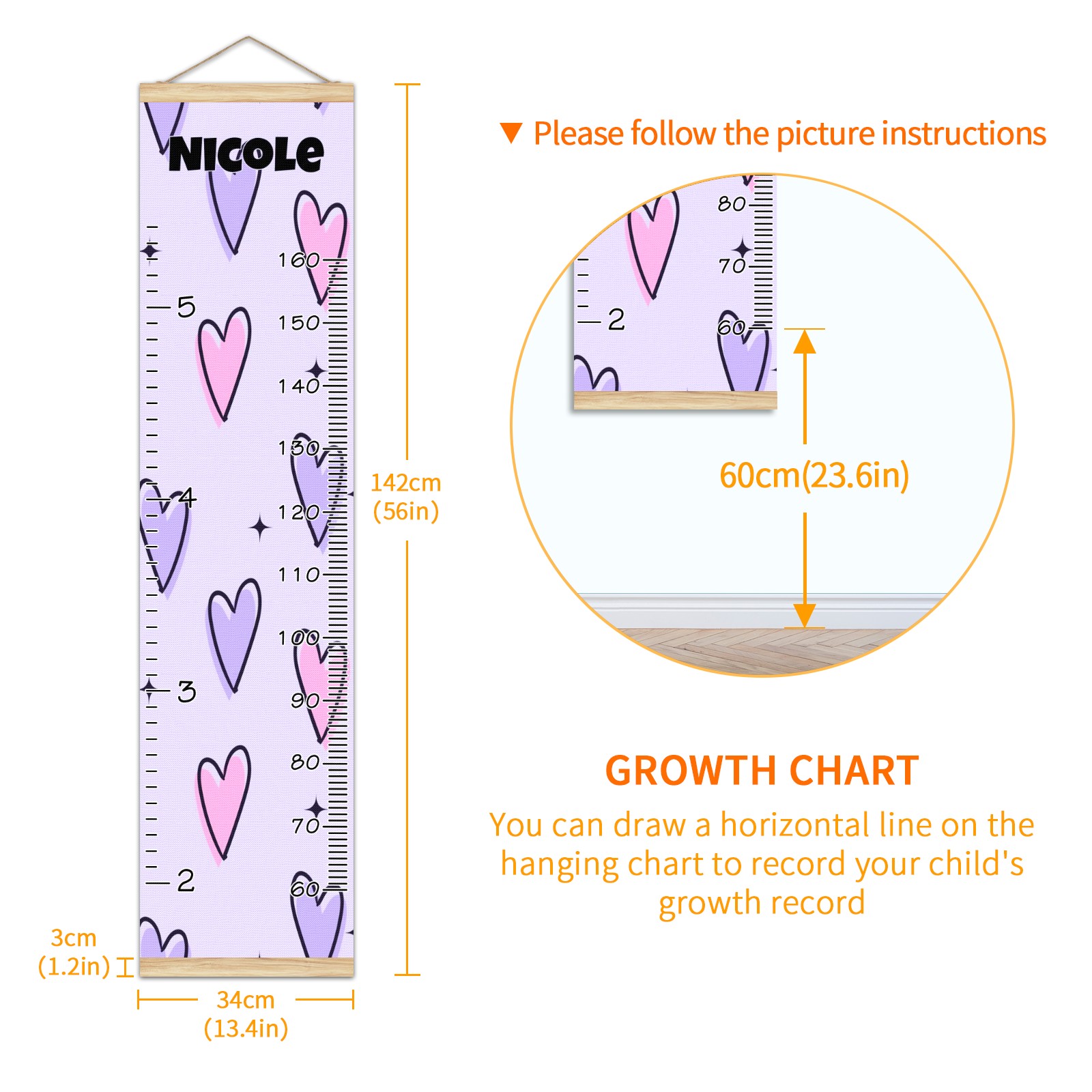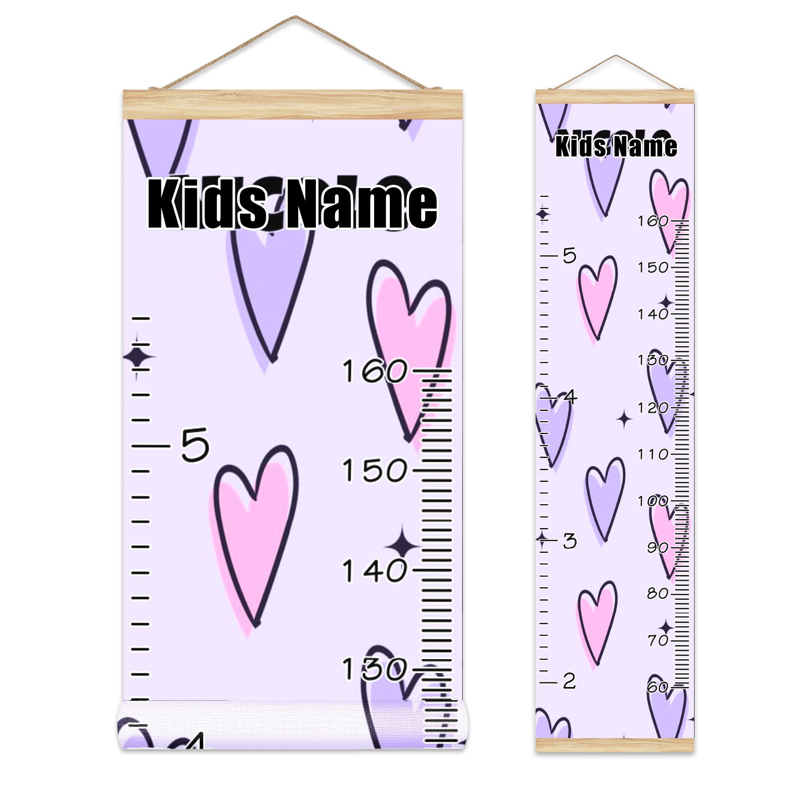 Personalized Kids Name Growth Chart Ruler for Wall Wood Frame Canvas Height Measure Chart 13.4x56 in Hanging Growth Chart Pink Purple Love Heart12.28 Boys Girls Room Decor