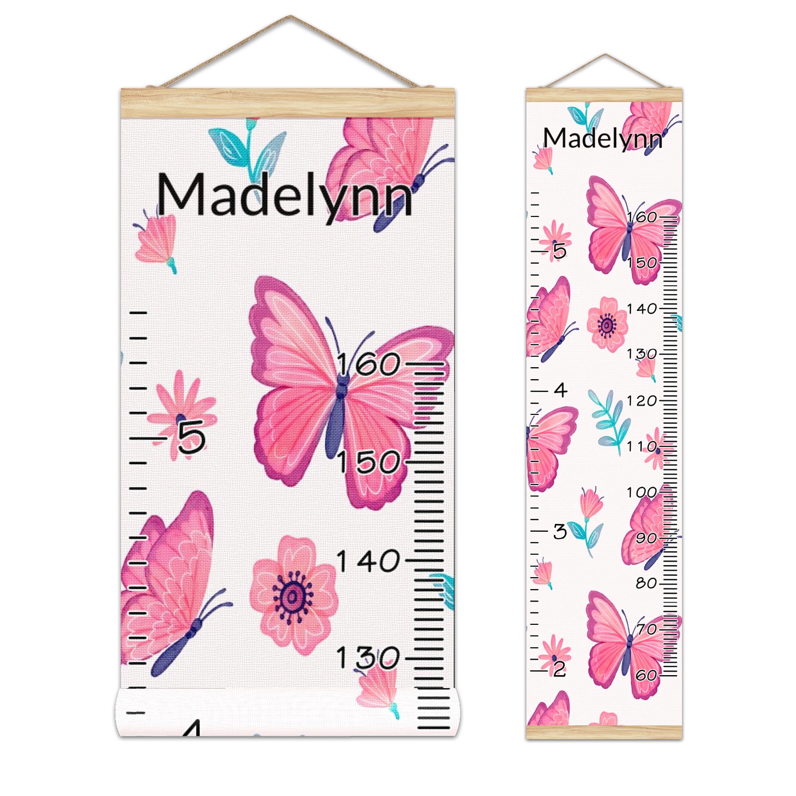 Personalized Kids Name Growth Chart Ruler for Wall Wood Frame Canvas Height Measure Chart 13.4x56 in Hanging Growth Chart Pink Butterfly & Flower12.28 Boys Girls Room Decor