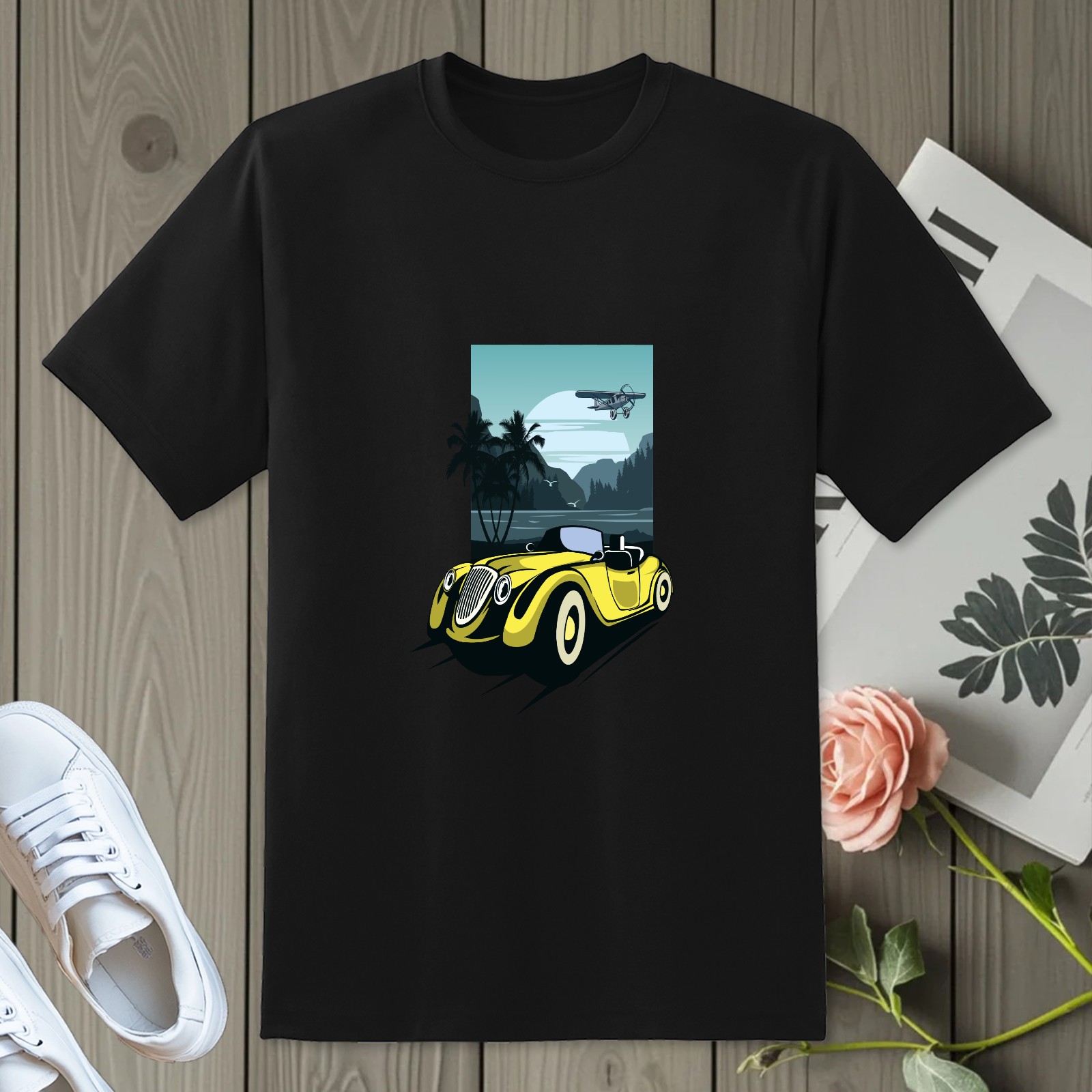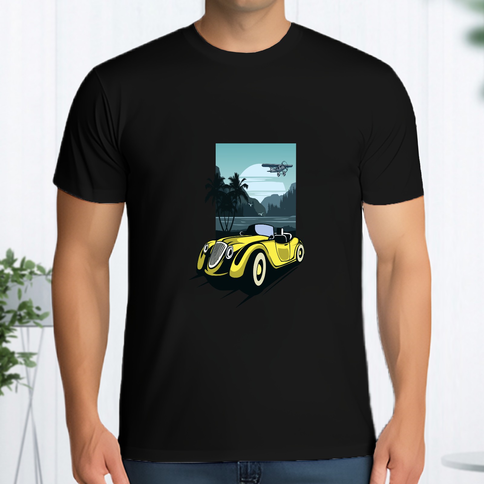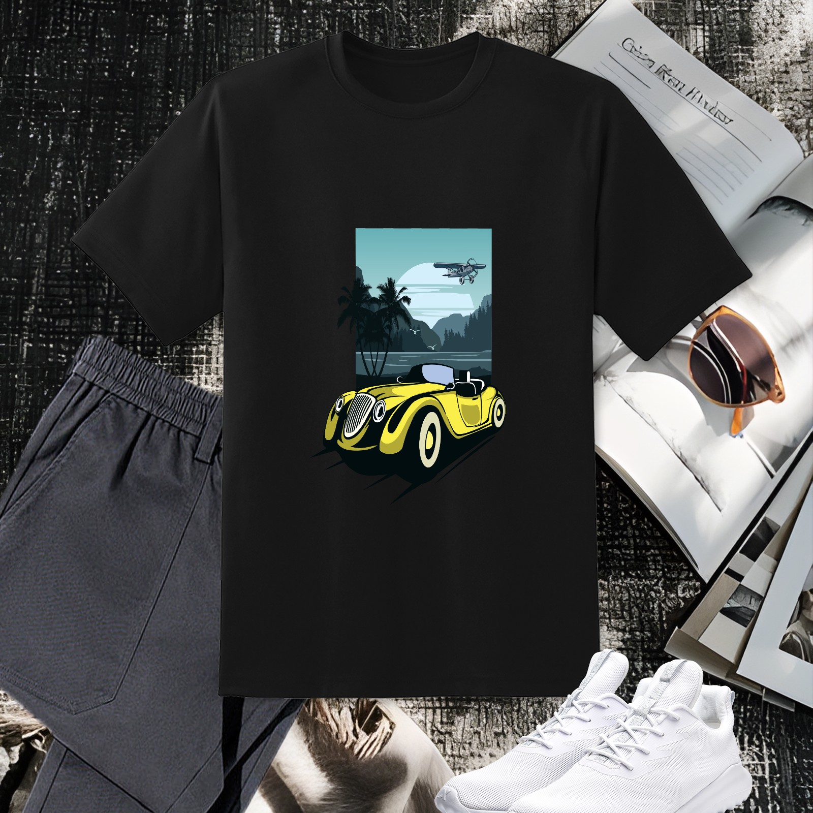 Men's Retro Car Versatile Casual Short Sleeved Shirt Paired With Fashionable Round Neck T-shirt,Suitable For Valentine's Day, Holiday Gifts, Suitable For Outdoor Daily Wear