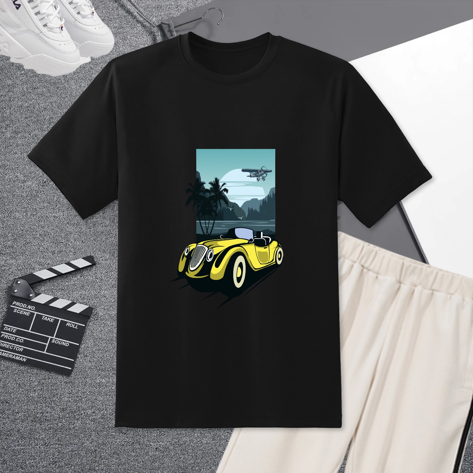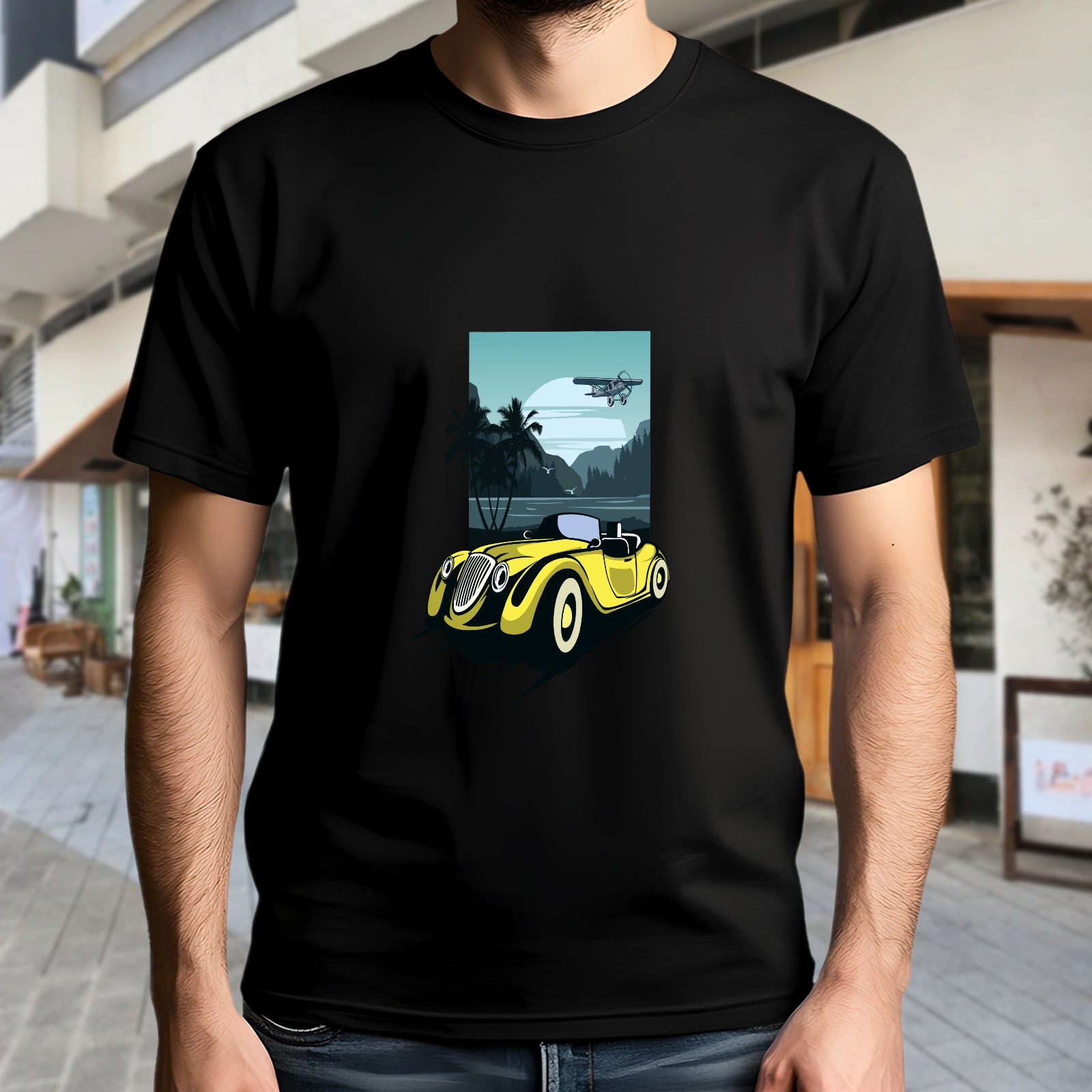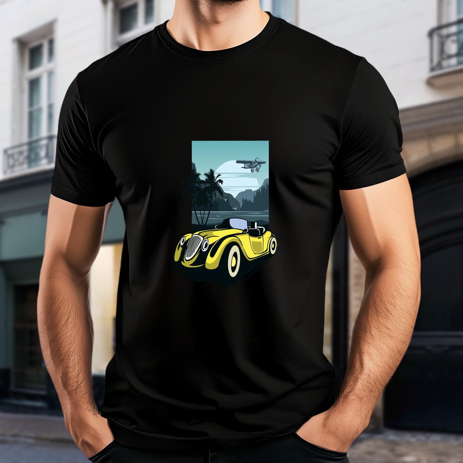Men's Retro Car Versatile Casual Short Sleeved Shirt Paired With Fashionable Round Neck T-shirt,Suitable For Valentine's Day, Holiday Gifts, Suitable For Outdoor Daily Wear