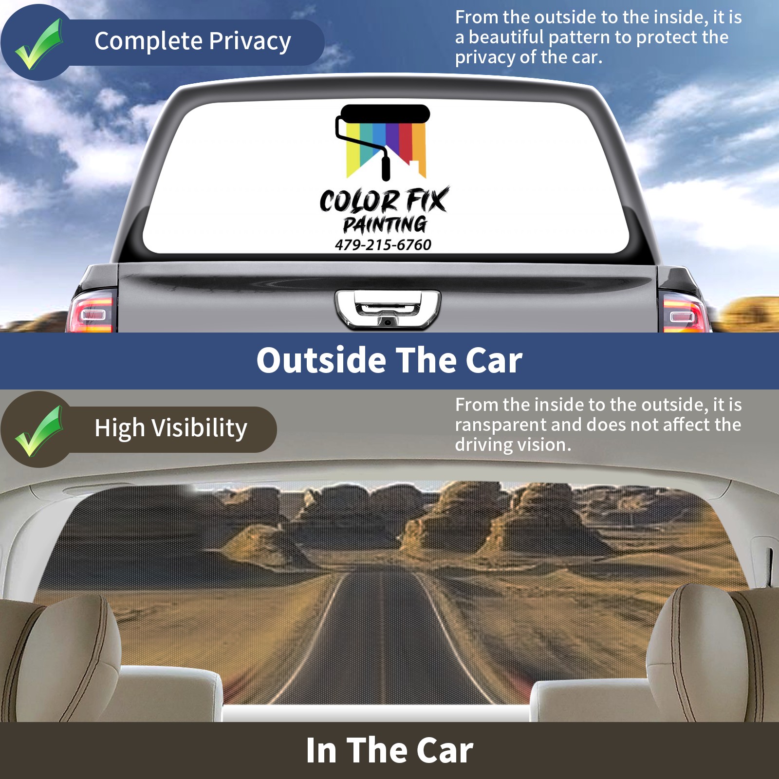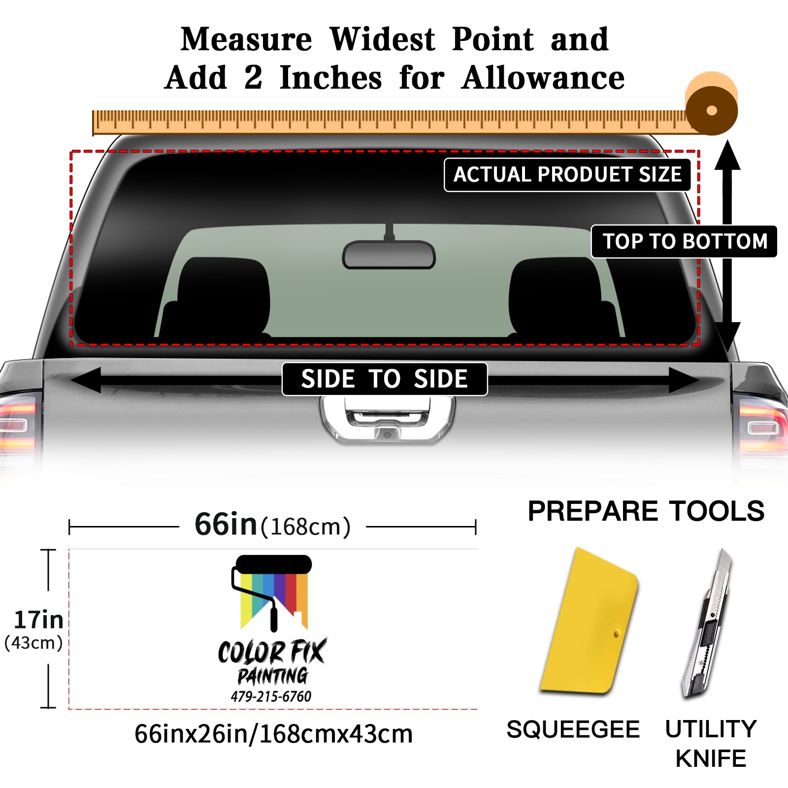 <p><strong>Truck Rear Window Graphics Decals Pickup Trucks Back Window Film Stickers 66" x 22" Perforated Vinyl Wrap Stickers Decorations for Car Rear Window</strong></p><p><strong><br /></strong></p><p><strong>Features :</strong></p><p>- Size of the rear window decals for trucks is 66x22 Inches (168x56cm).</p><p>- High quality perforated vinyl window film, one way vision sticker.</p><p>- Perforated is see through from the inside but not from outside.</p><p>- Clear printing, waterproof and durable.</p><p>- The car back window graphics stickers fits most truck and makes your vehicle more beautiful.&nbsp;</p><p><br /></p><p><strong>【Installation Instructions】</strong></p><p><strong>1. CLEAN SURFACE -</strong> Clean the rear window thoroughly and make sure the surface clean.</p><p><strong>2. STICK THE DECALS -</strong> Tear off the paper on the back and stick the decal on the window.</p><p><strong>3. SCRAPE OFF AIR BUBBLES -</strong> Use a squeegee or other card to scrape off the excess air bubbles.</p><p><strong>4. TRIM THE EXCESS -</strong> Use a knife to cut off the excess stickers of the window, finally complete.</p><p><br /></p><p>1. Please measure the size before purchasing, back window graphics decal for truck can be cut to your desired size.</p><p>2.The graphics stickers for truck back window is a great gift for yourself also can as a birthday / halloween / christmas gift for your friends and family.</p>