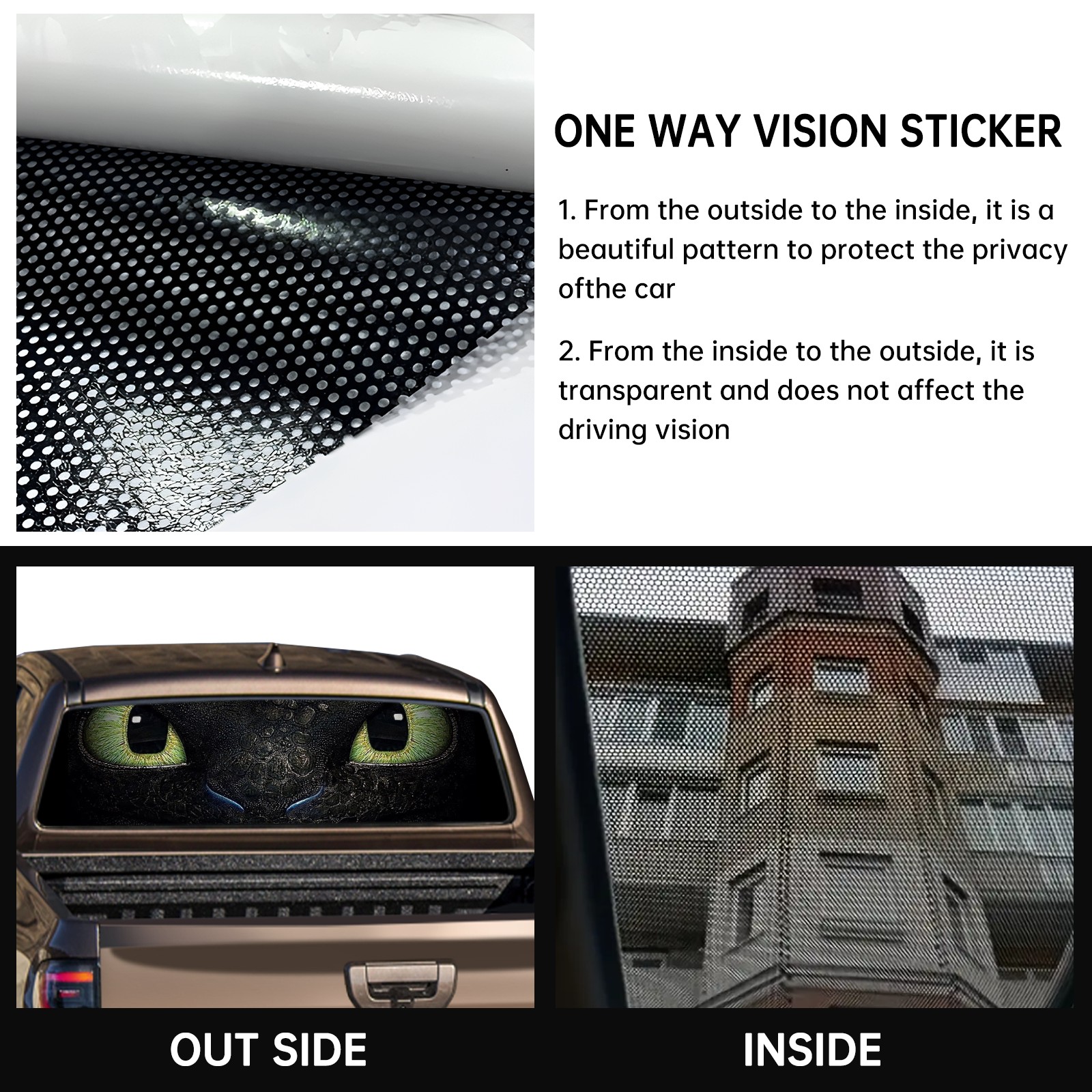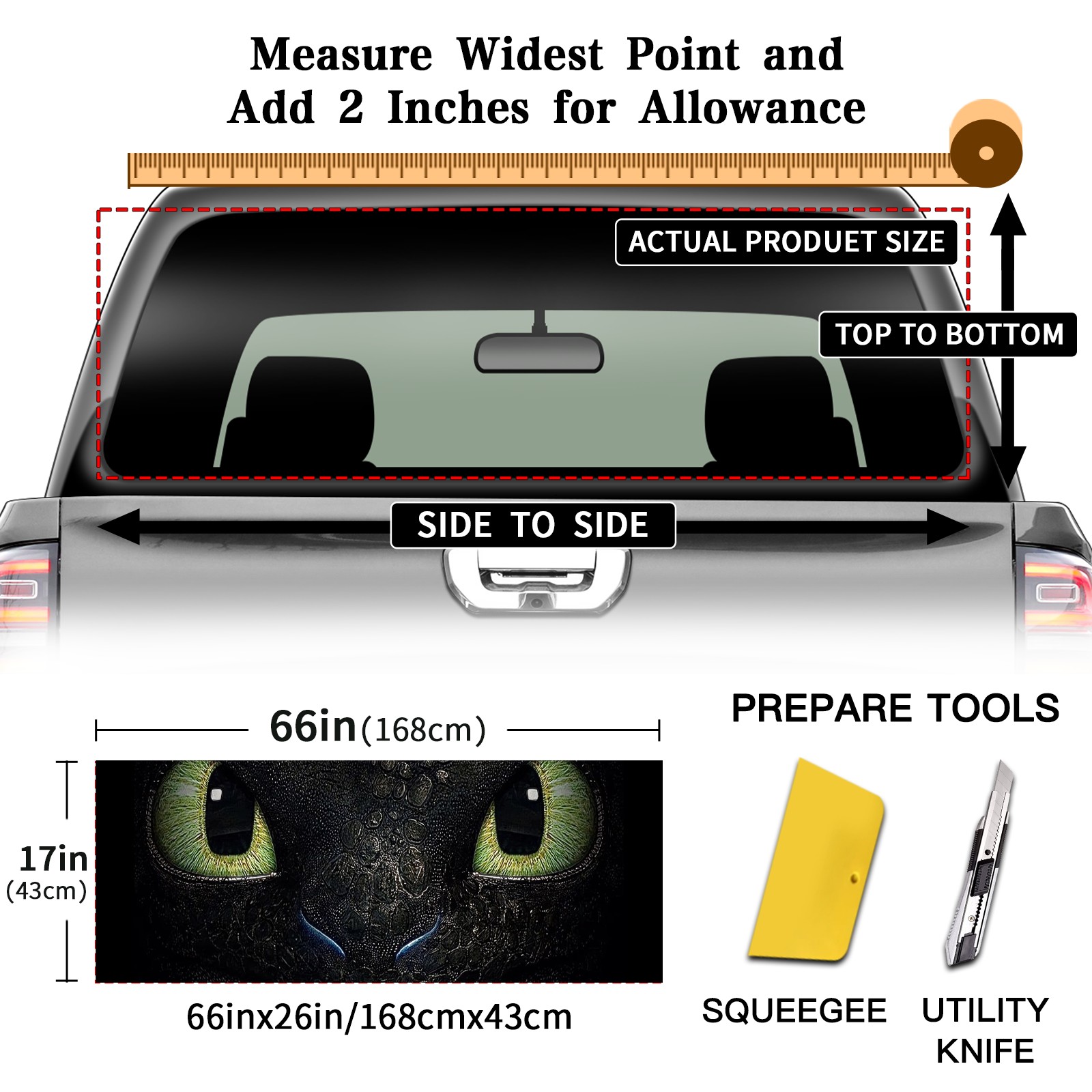 <p><strong>Truck Rear Window Graphics Decals Pickup Trucks Back Window Film Stickers 66" x 22" Perforated Vinyl Wrap Stickers Decorations for Car Rear Window</strong></p><p><strong><br /></strong></p><p><strong>Features :</strong></p><p>- Size of the rear window decals for trucks is 66x22 Inches (168x56cm).</p><p>- High quality perforated vinyl window film, one way vision sticker.</p><p>- Perforated is see through from the inside but not from outside.</p><p>- Clear printing, waterproof and durable.</p><p>- The car back window graphics stickers fits most truck and makes your vehicle more beautiful.&nbsp;</p><p><br /></p><p><strong>【Installation Instructions】</strong></p><p><strong>1. CLEAN SURFACE -</strong> Clean the rear window thoroughly and make sure the surface clean.</p><p><strong>2. STICK THE DECALS -</strong> Tear off the paper on the back and stick the decal on the window.</p><p><strong>3. SCRAPE OFF AIR BUBBLES -</strong> Use a squeegee or other card to scrape off the excess air bubbles.</p><p><strong>4. TRIM THE EXCESS -</strong> Use a knife to cut off the excess stickers of the window, finally complete.</p><p><br /></p><p>1. Please measure the size before purchasing, back window graphics decal for truck can be cut to your desired size.</p><p>2.The graphics stickers for truck back window is a great gift for yourself also can as a birthday / halloween / christmas gift for your friends and family.</p>