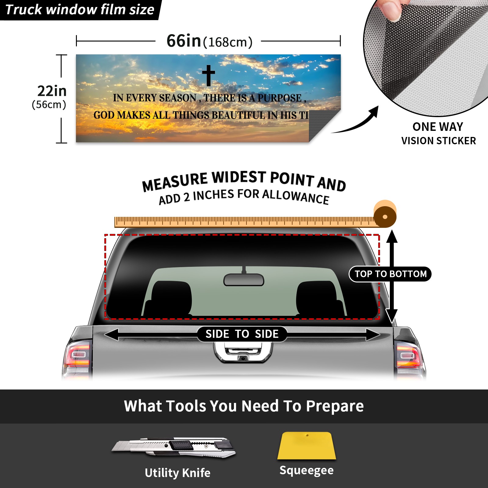 <p><strong>Truck Rear Window Graphics Decals Pickup Trucks Back Window Film Stickers 66" x 22" Perforated Vinyl Wrap Stickers Decorations for Car Rear Window</strong></p><p><strong><br /></strong></p><p><strong>Features :</strong></p><p>- Size of the rear window decals for trucks is 66x22 Inches (168x56cm).</p><p>- High quality perforated vinyl window film, one way vision sticker.</p><p>- Perforated is see through from the inside but not from outside.</p><p>- Clear printing, waterproof and durable.</p><p>- The car back window graphics stickers fits most truck and makes your vehicle more beautiful.&nbsp;</p><p><br /></p><p><strong>【Installation Instructions】</strong></p><p><strong>1. CLEAN SURFACE -</strong> Clean the rear window thoroughly and make sure the surface clean.</p><p><strong>2. STICK THE DECALS -</strong> Tear off the paper on the back and stick the decal on the window.</p><p><strong>3. SCRAPE OFF AIR BUBBLES -</strong> Use a squeegee or other card to scrape off the excess air bubbles.</p><p><strong>4. TRIM THE EXCESS -</strong> Use a knife to cut off the excess stickers of the window, finally complete.</p><p><br /></p><p>1. Please measure the size before purchasing, back window graphics decal for truck can be cut to your desired size.</p><p>2.The graphics stickers for truck back window is a great gift for yourself also can as a birthday / halloween / christmas gift for your friends and family.</p>