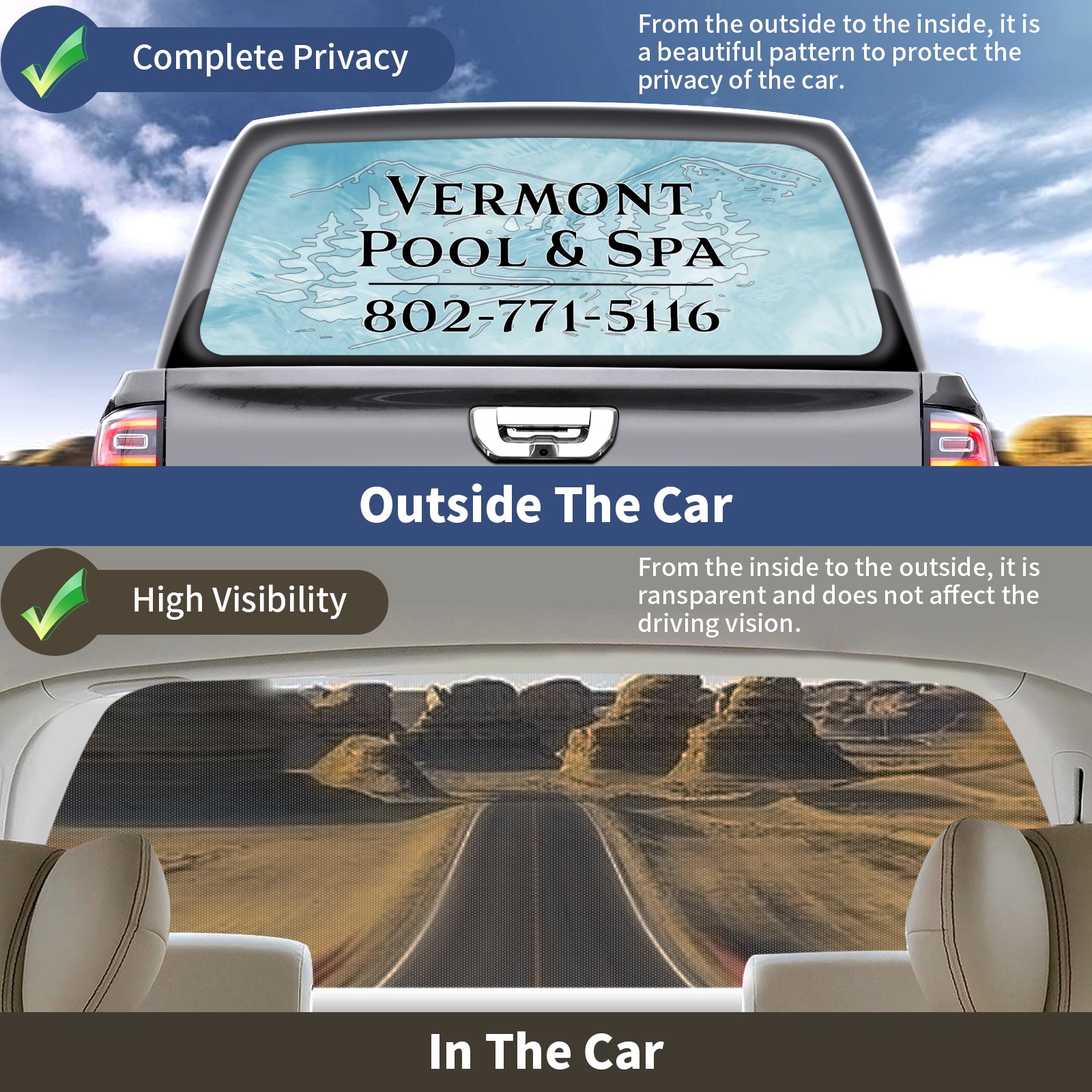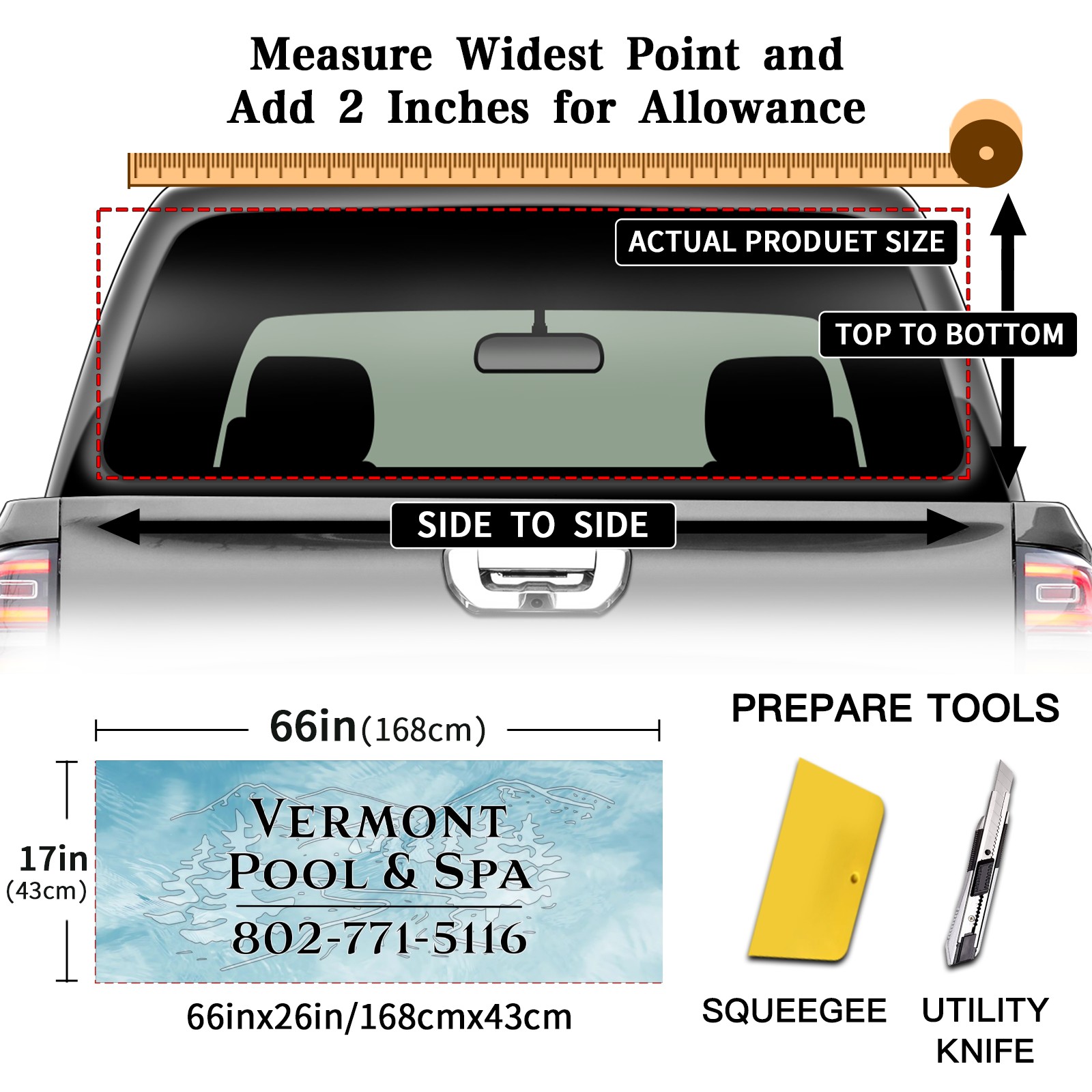 <p><strong>Truck Rear Window Graphics Decals Pickup Trucks Back Window Film Stickers 66" x 22" Perforated Vinyl Wrap Stickers Decorations for Car Rear Window</strong></p><p><strong><br /></strong></p><p><strong>Features :</strong></p><p>- Size of the rear window decals for trucks is 66x22 Inches (168x56cm).</p><p>- High quality perforated vinyl window film, one way vision sticker.</p><p>- Perforated is see through from the inside but not from outside.</p><p>- Clear printing, waterproof and durable.</p><p>- The car back window graphics stickers fits most truck and makes your vehicle more beautiful.&nbsp;</p><p><br /></p><p><strong>【Installation Instructions】</strong></p><p><strong>1. CLEAN SURFACE -</strong> Clean the rear window thoroughly and make sure the surface clean.</p><p><strong>2. STICK THE DECALS -</strong> Tear off the paper on the back and stick the decal on the window.</p><p><strong>3. SCRAPE OFF AIR BUBBLES -</strong> Use a squeegee or other card to scrape off the excess air bubbles.</p><p><strong>4. TRIM THE EXCESS -</strong> Use a knife to cut off the excess stickers of the window, finally complete.</p><p><br /></p><p>1. Please measure the size before purchasing, back window graphics decal for truck can be cut to your desired size.</p><p>2.The graphics stickers for truck back window is a great gift for yourself also can as a birthday / halloween / christmas gift for your friends and family.</p>