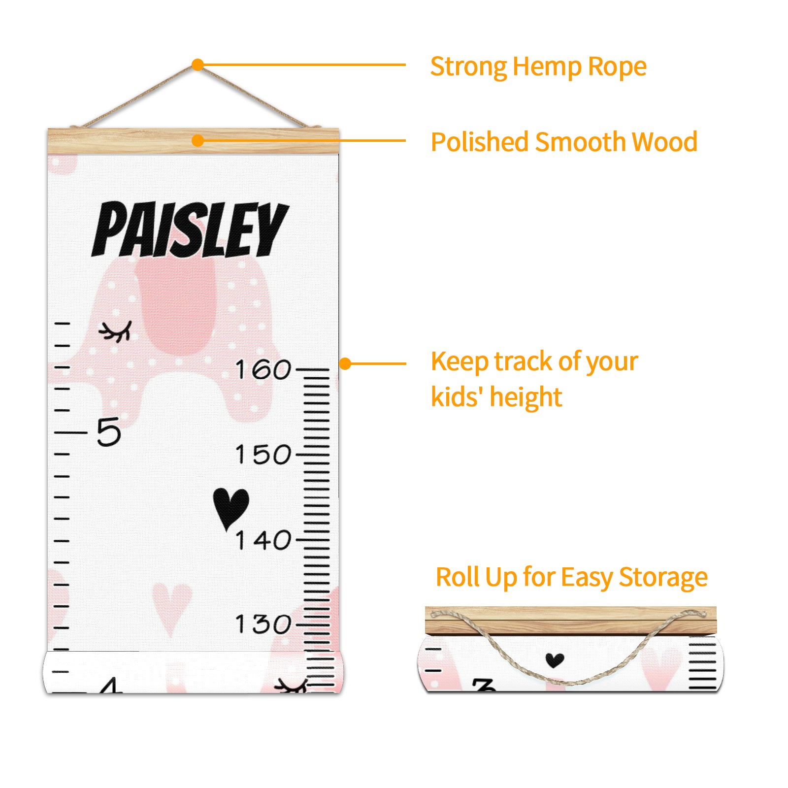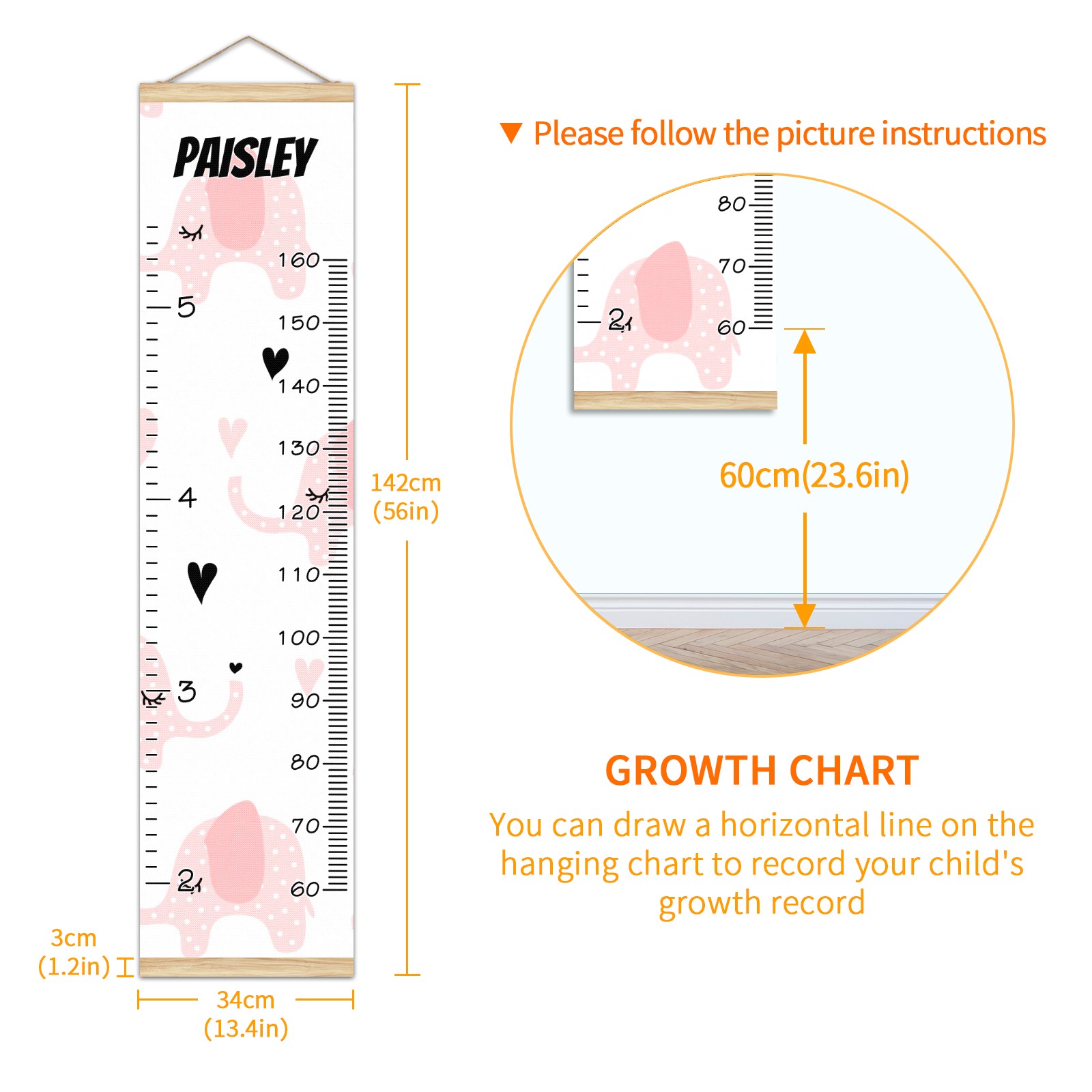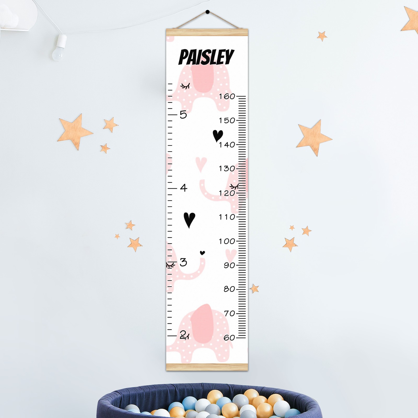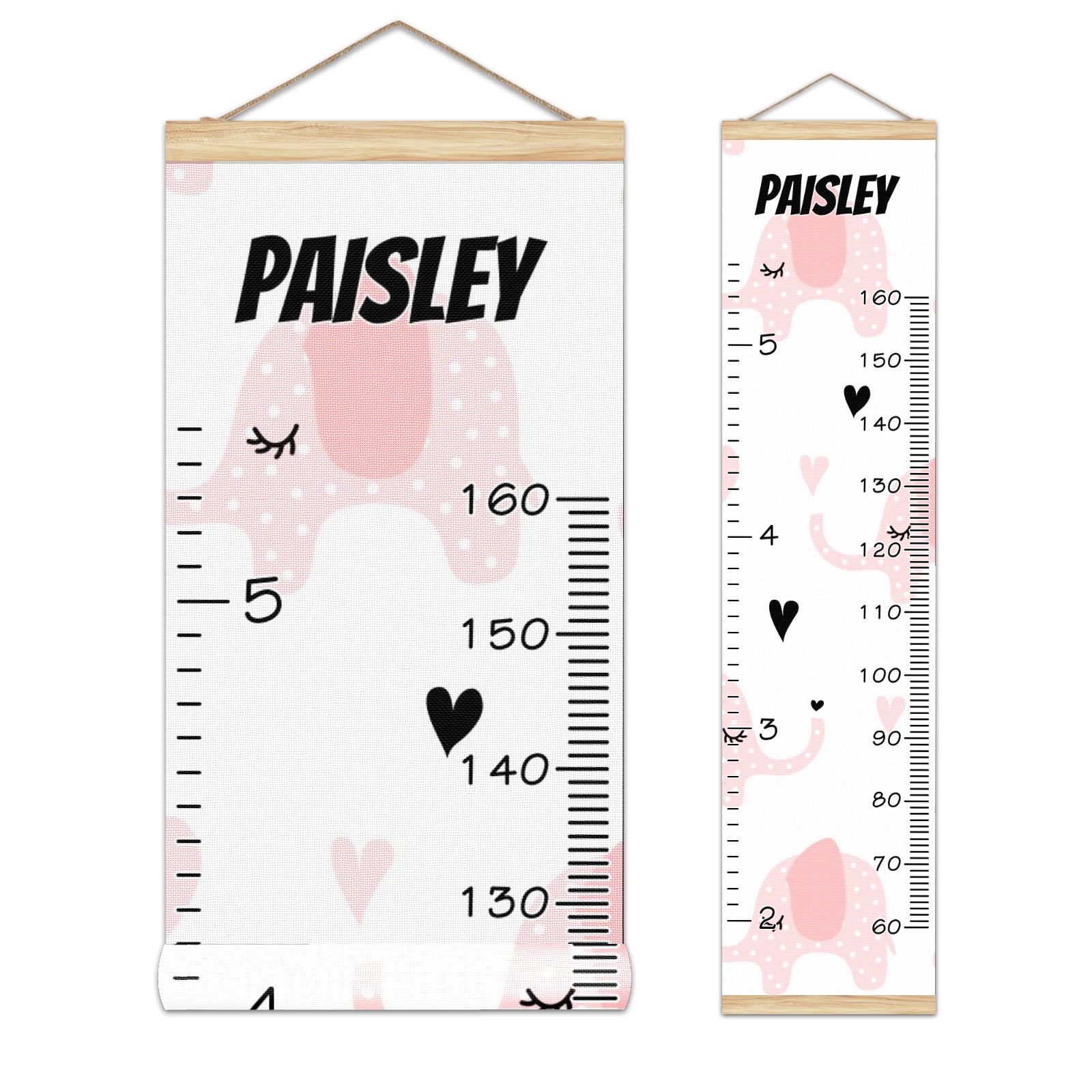 Personalized Kids Name Growth Chart Ruler for Wall Wood Frame Canvas Height Measure Chart 13.4x56 in Hanging Growth Chart Pink Elephant1.10 Boys Girls Room Decor