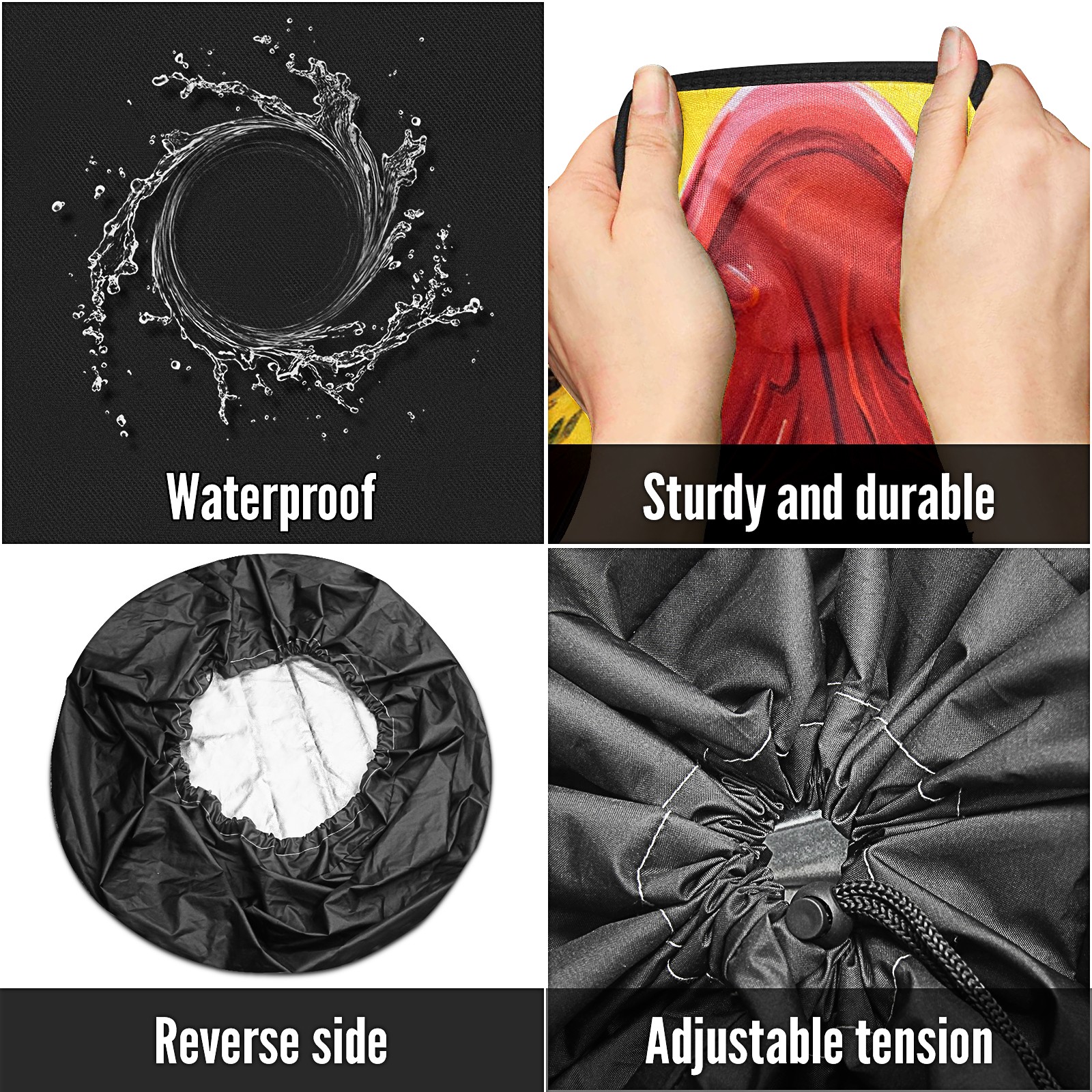 • <p>Spare Tire Cover Size</p> <p>Size 14" fits for tire diameter 23"-27"(60~69cm)</p> <p>Size 15" fits for tire diameter 28"-29"(70~74cm)</p> <p>Size 16" fits for tire diameter 30"-31"(75~79cm)</p> <p>Size 17" fits for tire diameter 32"-33"(80~84cm)</p> <p><br></p> <p>- Premium Material: Our spare tire cover is made of high-quality polyester fabric, ensuring durability and waterproof performance. Protect your spare tires from rain, wind, dust, UV rays, and other harsh weather conditions.</p> <p>- Multifunctional Use: Our trailer spare tire cover is suitable for trailers, RVs, SUVs, campers, trucks, and other vehicles. Keep your spare tires clean, prevent corrosion, and prolong their lifespan.</p> <p>- Easy to Use: Our tire covers for trailers can be effortlessly fitted and securely fastened with the adjustable nylon cord, preventing it from slipping off. </p> <p>- Reliable After-Sales Service: We stand behind the quality of our product. If you encounter any issues with our spare tire cover, please feel free to contact us. We will provide a satisfacto</p>