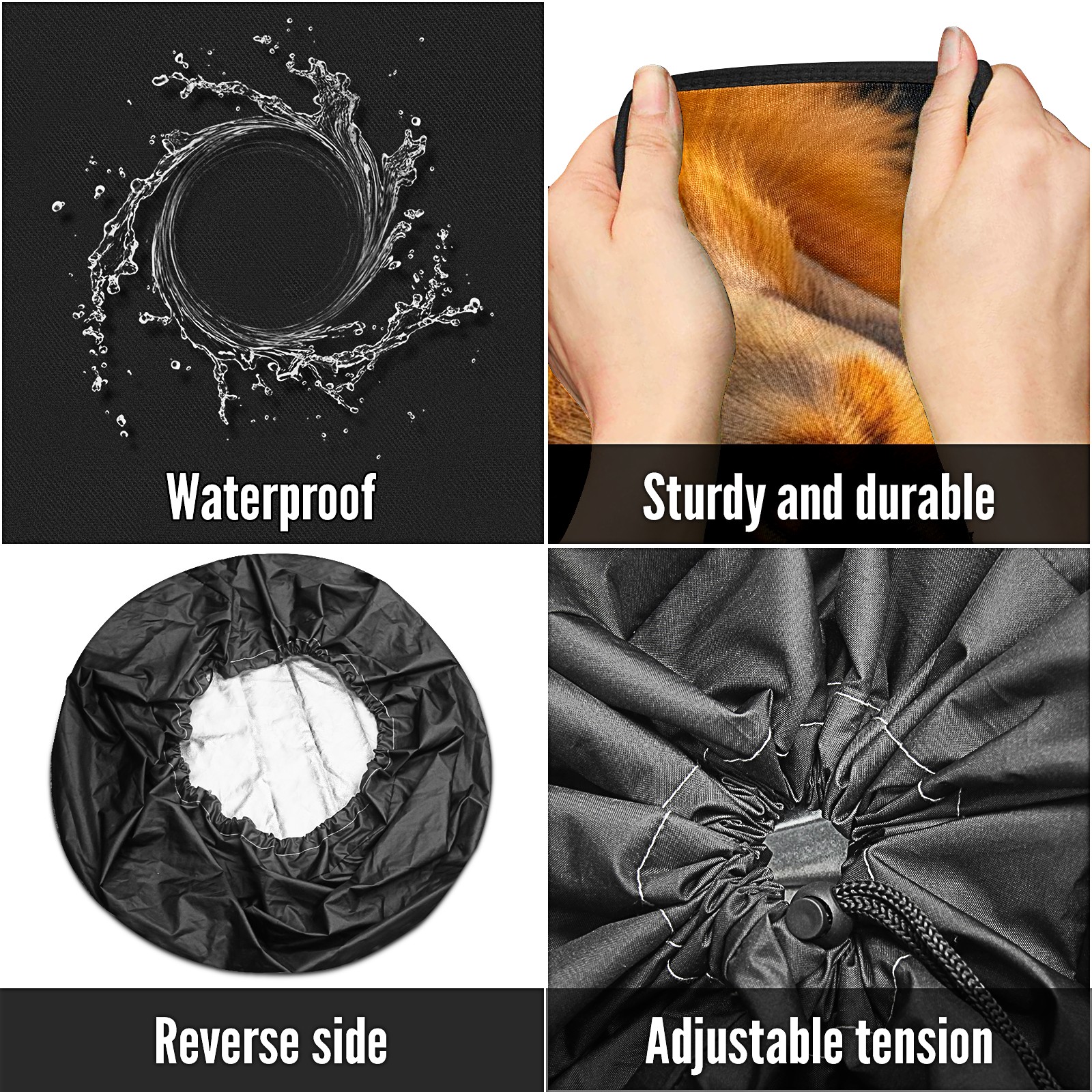 <p>Spare Tire Cover Size</p> <p>Size 14" fits for tire diameter 23"-27"(60~69cm)</p> <p>Size 15" fits for tire diameter 28"-29"(70~74cm)</p> <p>Size 16" fits for tire diameter 30"-31"(75~79cm)</p> <p>Size 17" fits for tire diameter 32"-33"(80~84cm)</p> <p><br></p> <p>- Premium Material: Our spare tire cover is made of high-quality polyester fabric, ensuring durability and waterproof performance. Protect your spare tires from rain, wind, dust, UV rays, and other harsh weather conditions.</p> <p>- Multifunctional Use: Our trailer spare tire cover is suitable for trailers, RVs, SUVs, campers, trucks, and other vehicles. Keep your spare tires clean, prevent corrosion, and prolong their lifespan.</p> <p>- Easy to Use: Our tire covers for trailers can be effortlessly fitted and securely fastened with the adjustable nylon cord, preventing it from slipping off. </p> <p>- Reliable After-Sales Service: We stand behind the quality of our product. If you encounter any issues with our spare tire cover, please feel free to contact us. We will provide a satisfacto</p>