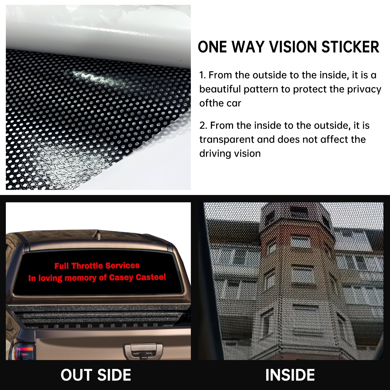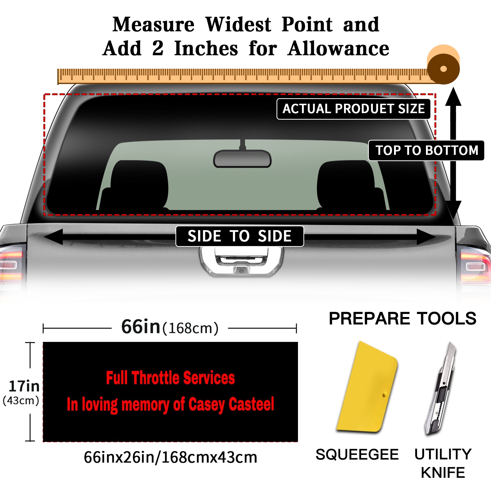 <p><strong>Truck Rear Window Graphics Decals Pickup Trucks Back Window Film Stickers 66" x 22" Perforated Vinyl Wrap Stickers Decorations for Car Rear Window</strong></p><p><strong><br /></strong></p><p><strong>Features :</strong></p><p>- Size of the rear window decals for trucks is 66x22 Inches (168x56cm).</p><p>- High quality perforated vinyl window film, one way vision sticker.</p><p>- Perforated is see through from the inside but not from outside.</p><p>- Clear printing, waterproof and durable.</p><p>- The car back window graphics stickers fits most truck and makes your vehicle more beautiful. </p><p><br /></p><p><strong>【Installation Instructions】</strong></p><p><strong>1. CLEAN SURFACE -</strong> Clean the rear window thoroughly and make sure the surface clean.</p><p><strong>2. STICK THE DECALS -</strong> Tear off the paper on the back and stick the decal on the window.</p><p><strong>3. SCRAPE OFF AIR BUBBLES -</strong> Use a squeegee or other card to scrape off the excess air bubbles.</p><p><strong>4. TRIM THE EXCESS -</strong> Use a knife to cut off the excess stickers of the window, finally complete.</p><p><br /></p><p>1. Please measure the size before purchasing, back window graphics decal for truck can be cut to your desired size.</p><p>2.The graphics stickers for truck back window is a great gift for yourself also can as a birthday / halloween / christmas gift for your friends and family.</p>