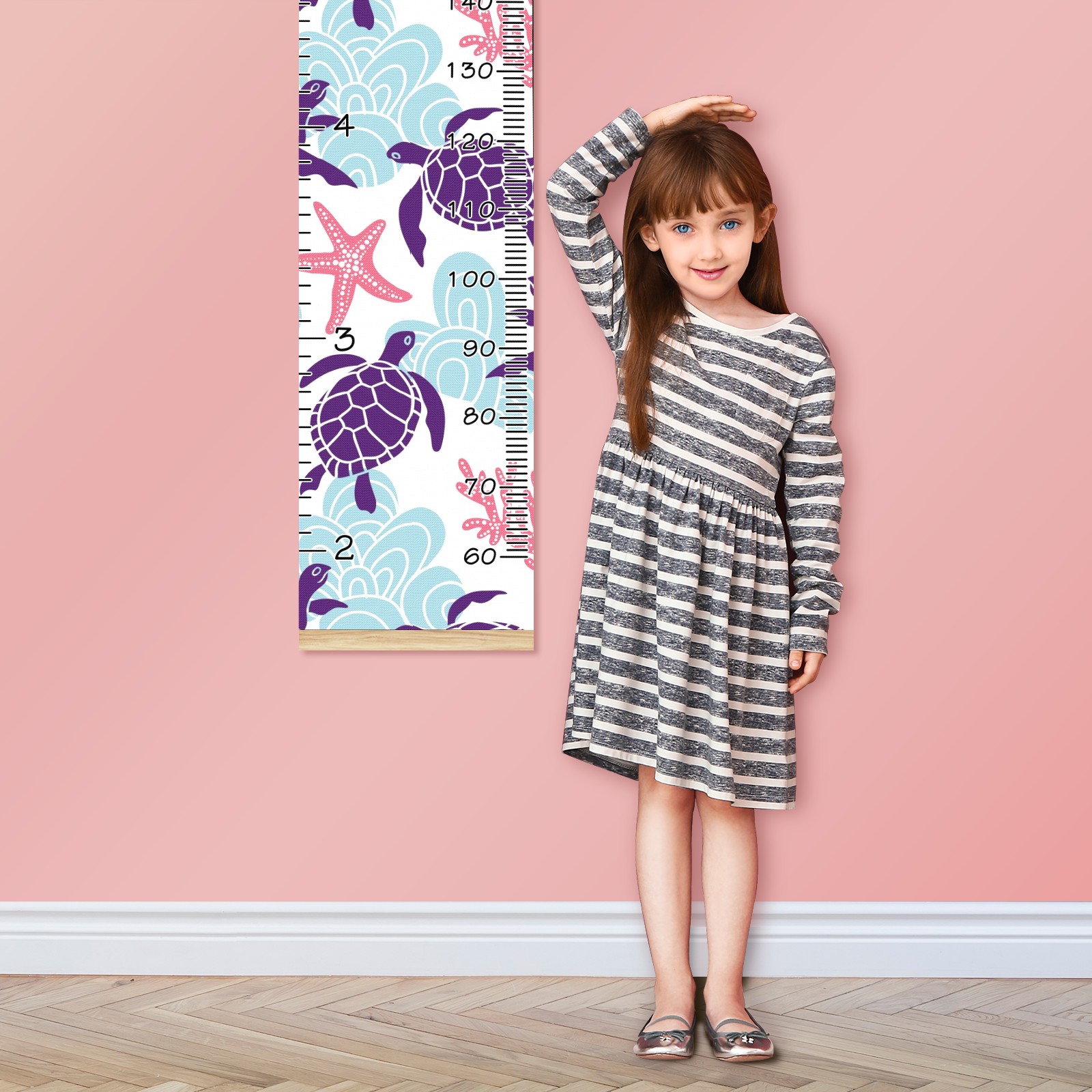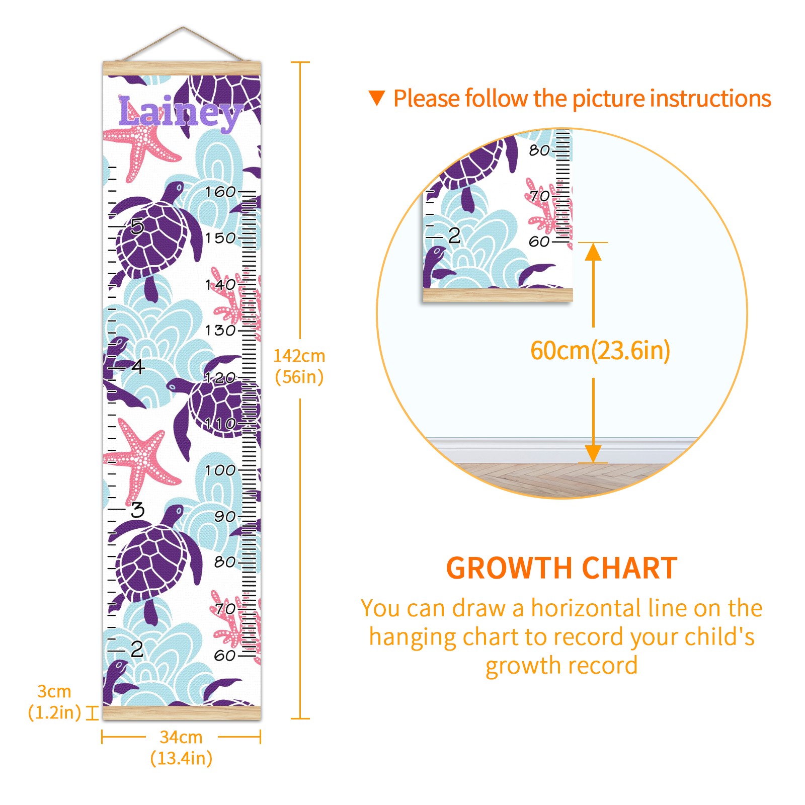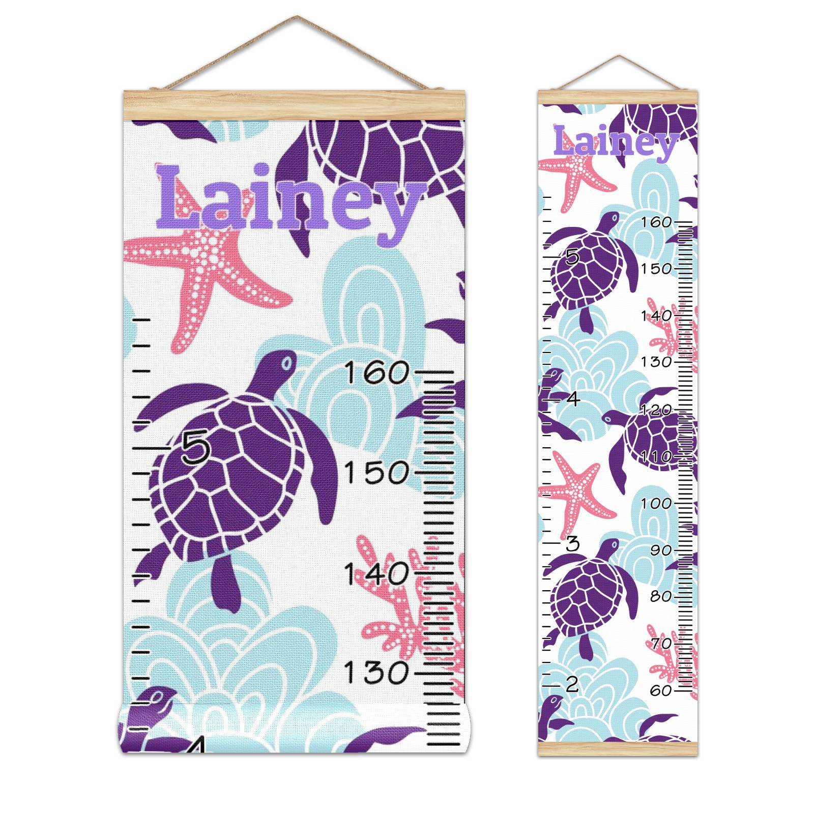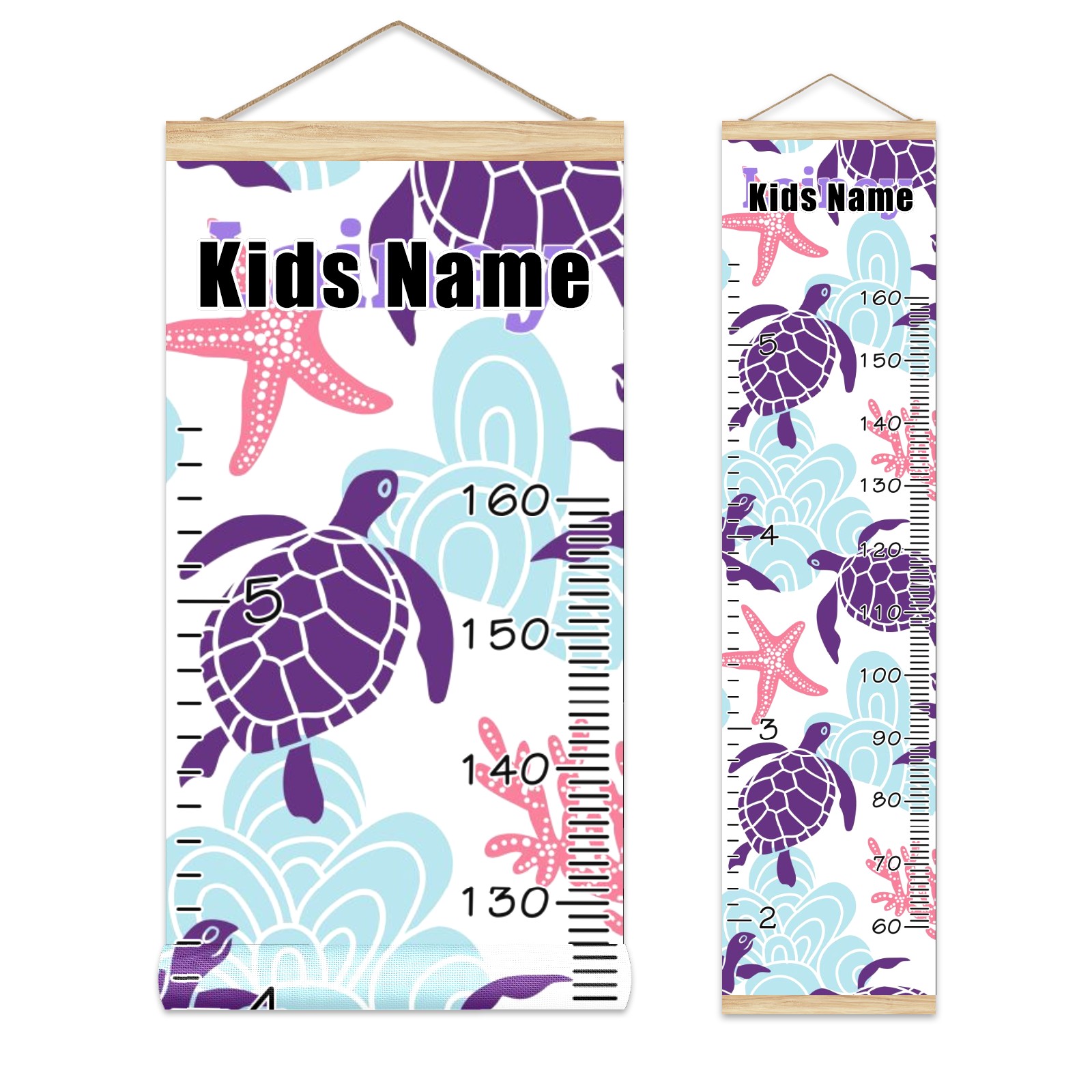 Personalized Kids Name Growth Chart Ruler for Wall Wood Frame Canvas Height Measure Chart 13.4x56 in Hanging Growth Chart Sea Turtle Starfish Coral1.13 Boys Girls Room Decor