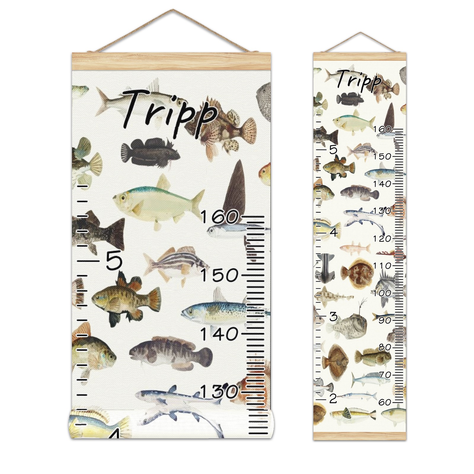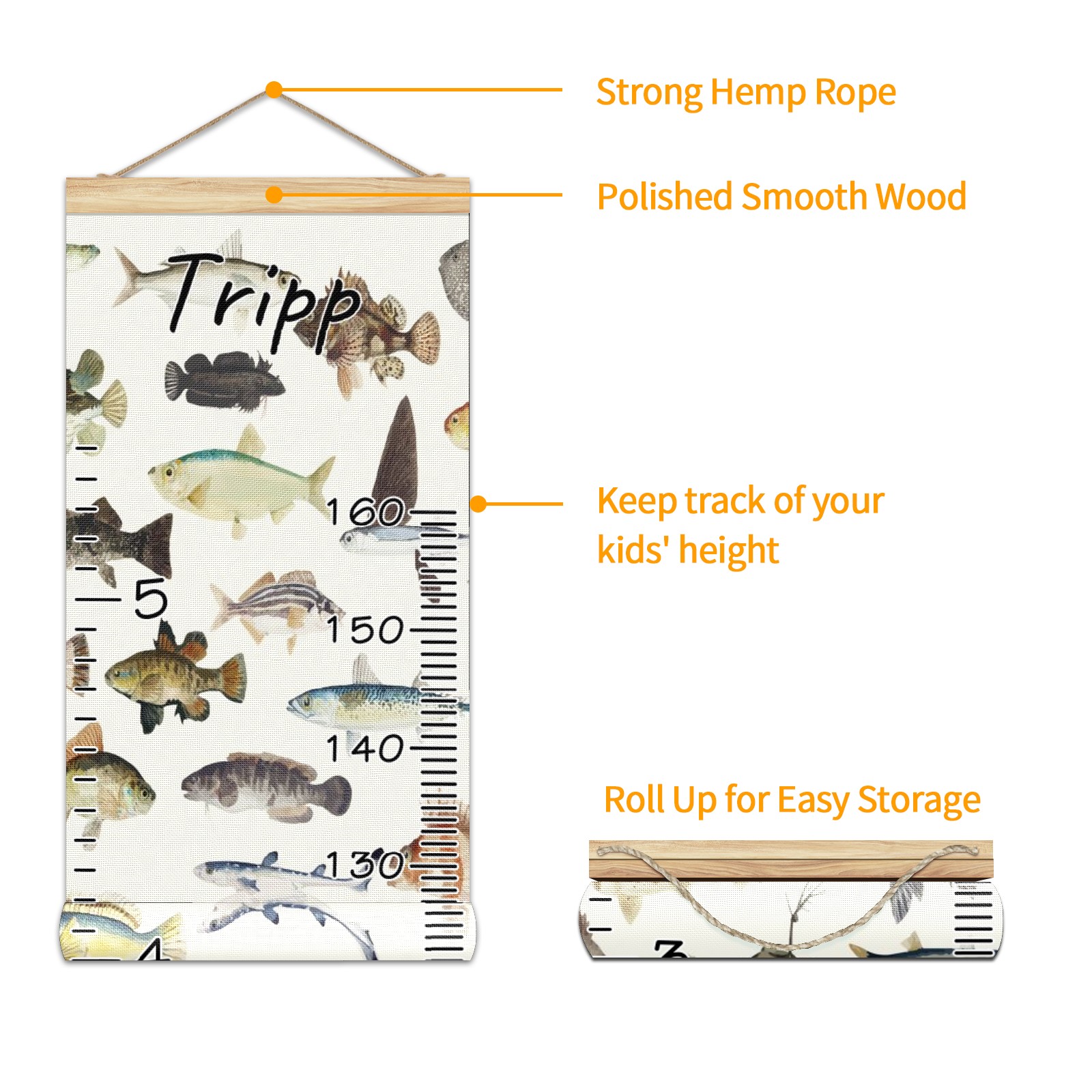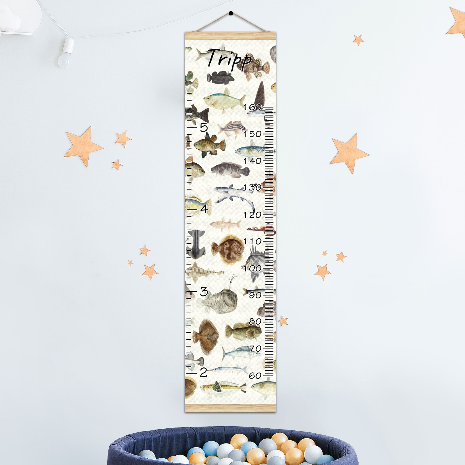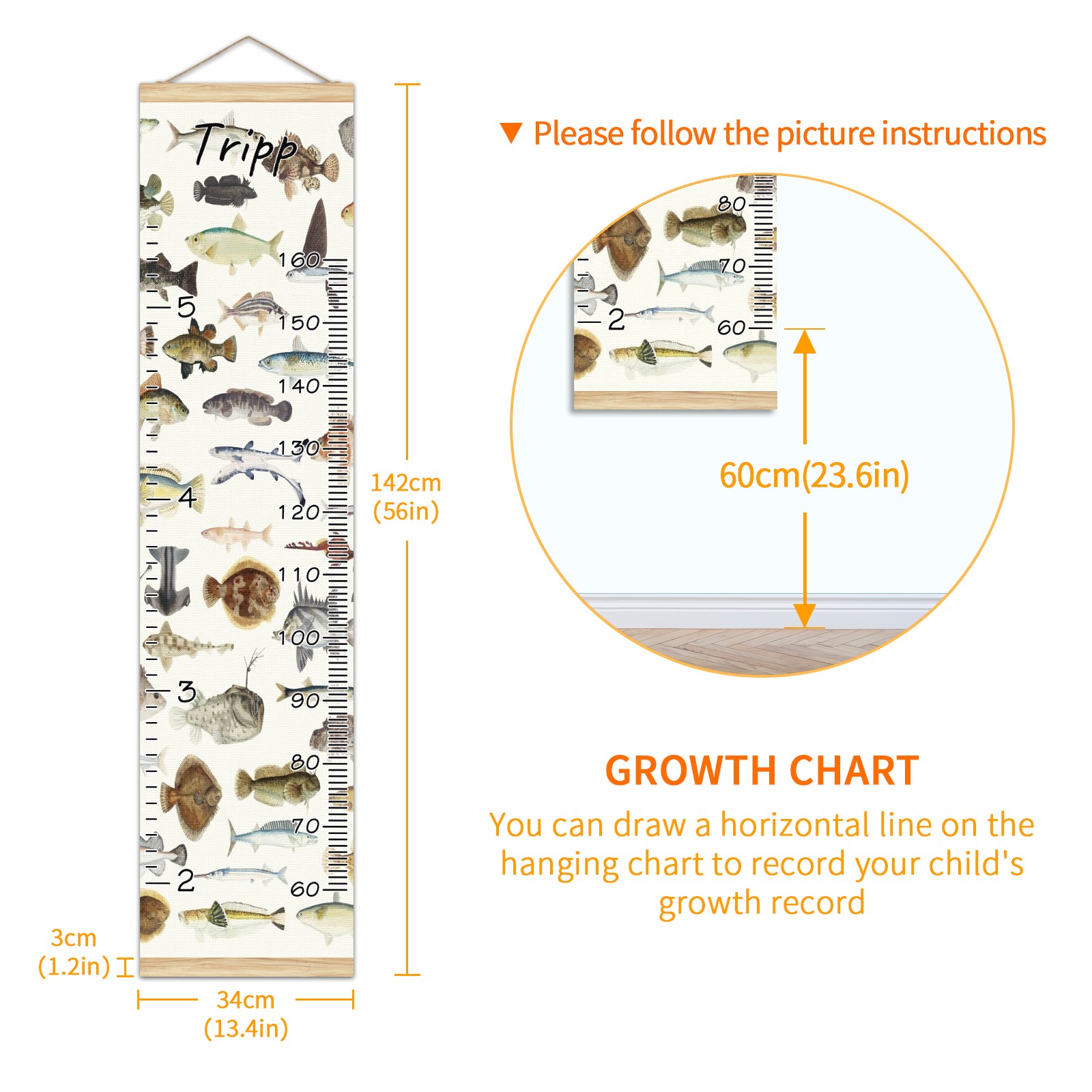 Personalized Kids Name Growth Chart Ruler for Wall Wood Frame Canvas Height Measure Chart 13.4x56 in Hanging Growth Chart Colored Fish Drawing1.14 Boys Girls Room Decor