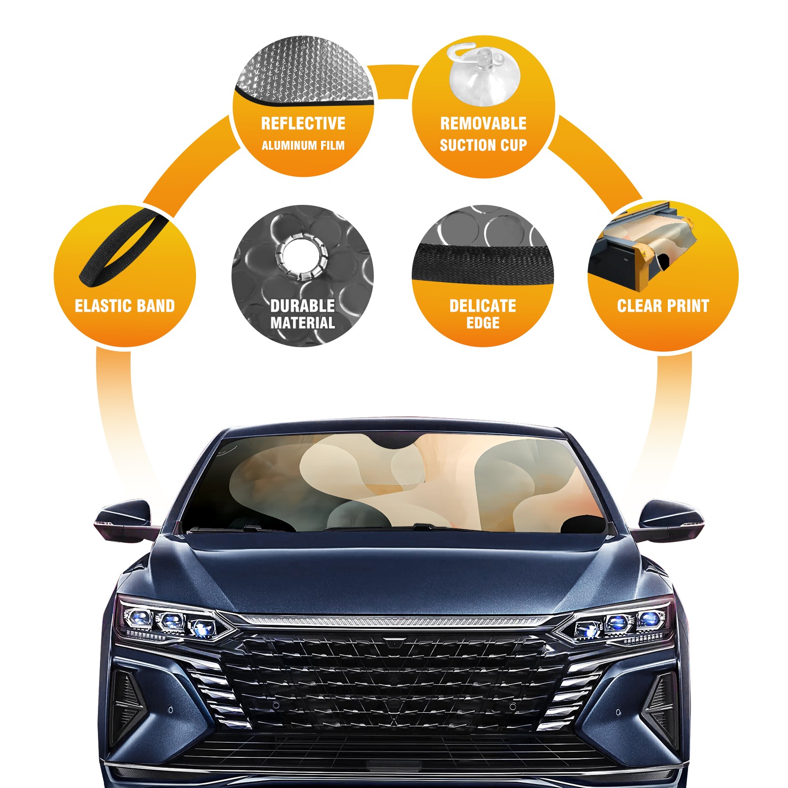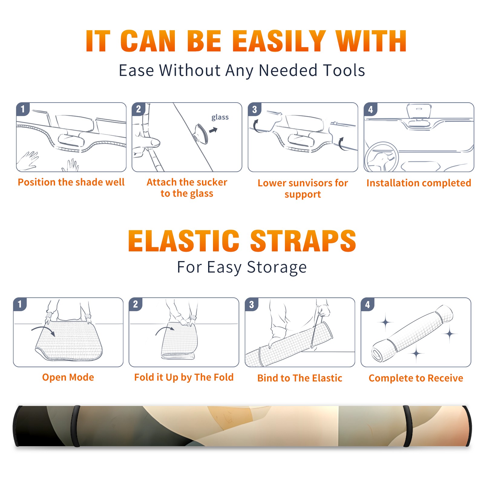 <b>Foldable Premium Car Windshield Sunshade is your great solution to reduce your car’s interior temperature dramatically!This is definitely a must-have item for your summer travel! </b> <br> ●<b>Size: 55"L x 30"W </b> <br> ●<b>Blocking Uv Rays & Heat Insulation</b><br> Our vehicle sunshade provides effective UV, sun, and summer heat protection .Maintains dashboards by preventing fading and cracking <br> ●<b>Easy-To-Store Folding Design Makes Storage Convenient</b> <br> Car sunshades comes with removable suction cups and elastic bands that you can install or remove easily and quickly. In a matter of seconds you can install your purchased windshield visor. And the detachable suction cups on the automotive's sun visor leave no marks on the windows when removed. When not in use, the front windshield can be conveniently and effectively placed on the door pocket or the dashboard, which is beautiful and does not occupy the interior space.<br> <br> <b>Stay cool and protected this summer with our fun and functional car windshield sun shade!Perfectly crafted to fit most vehicles, this premium quality sun blocker is your go-to automotive accessory. it's time to say goodbye to scorching hot seats and hello to comfort on every drive!</b>