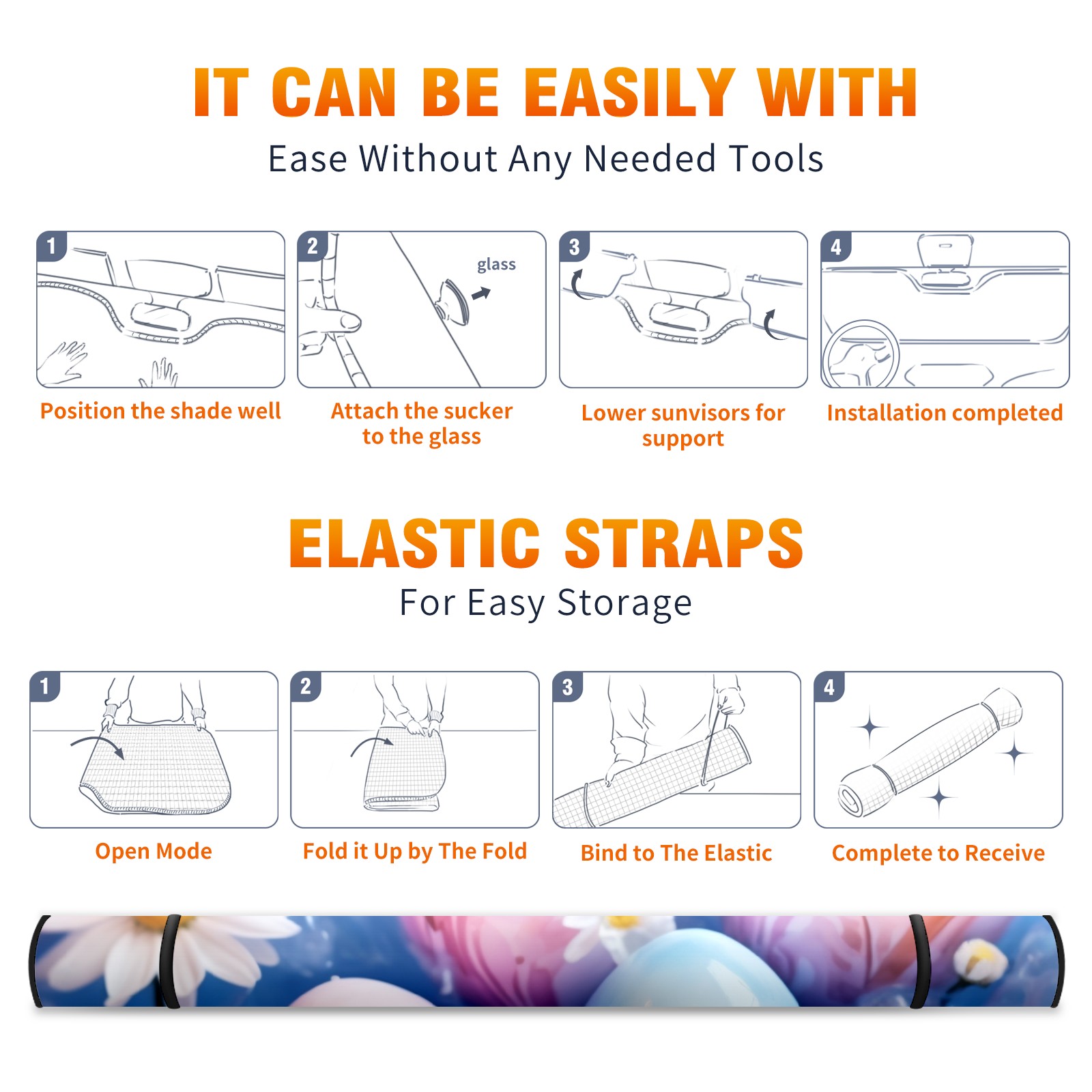 • <b>Foldable Premium Car Windshield Sunshade is your great solution to reduce your car’s interior temperature dramatically!This is definitely a must-have item for your summer travel! </b> <br> ●<b>Size: 55"L x 30"W </b> <br> ●<b>Blocking Uv Rays & Heat Insulation</b><br> Our vehicle sunshade provides effective UV, sun, and summer heat protection .Maintains dashboards by preventing fading and cracking <br> ●<b>Easy-To-Store Folding Design Makes Storage Convenient</b> <br> Car sunshades comes with removable suction cups and elastic bands that you can install or remove easily and quickly. In a matter of seconds you can install your purchased windshield visor. And the detachable suction cups on the automotive's sun visor leave no marks on the windows when removed. When not in use, the front windshield can be conveniently and effectively placed on the door pocket or the dashboard, which is beautiful and does not occupy the interior space.<br> <br> <b>Stay cool and protected this summer with our fun and functional car windshield sun shade!Perfectly crafted to fit most vehicles, this premium quality sun blocker is your go-to automotive accessory. it's time to say goodbye to scorching hot seats and hello to comfort on every drive!</b>