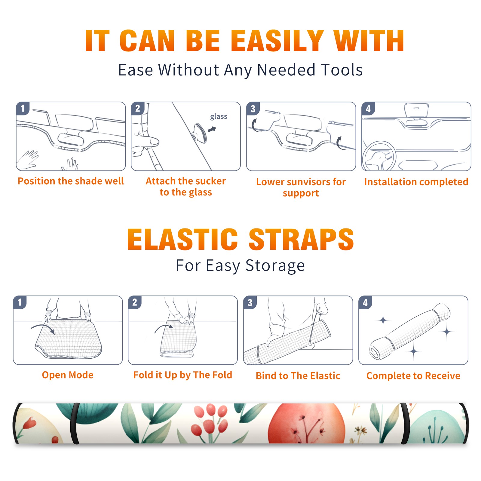 <b>Foldable Premium Car Windshield Sunshade is your great solution to reduce your car’s interior temperature dramatically!This is definitely a must-have item for your summer travel! </b> <br> ●<b>Size: 55"L x 30"W </b> <br> ●<b>Blocking Uv Rays & Heat Insulation</b><br> Our vehicle sunshade provides effective UV, sun, and summer heat protection .Maintains dashboards by preventing fading and cracking <br> ●<b>Easy-To-Store Folding Design Makes Storage Convenient</b> <br> Car sunshades comes with removable suction cups and elastic bands that you can install or remove easily and quickly. In a matter of seconds you can install your purchased windshield visor. And the detachable suction cups on the automotive's sun visor leave no marks on the windows when removed. When not in use, the front windshield can be conveniently and effectively placed on the door pocket or the dashboard, which is beautiful and does not occupy the interior space.<br> <br> <b>Stay cool and protected this summer with our fun and functional car windshield sun shade!Perfectly crafted to fit most vehicles, this premium quality sun blocker is your go-to automotive accessory. it's time to say goodbye to scorching hot seats and hello to comfort on every drive!</b>