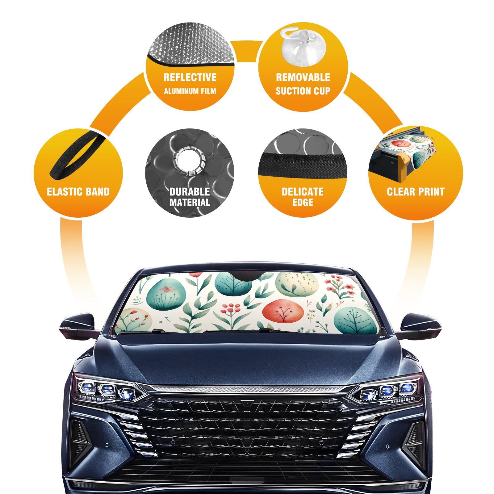 • <b>Foldable Premium Car Windshield Sunshade is your great solution to reduce your car’s interior temperature dramatically!This is definitely a must-have item for your summer travel! </b> <br> ●<b>Size: 55"L x 30"W </b> <br> ●<b>Blocking Uv Rays & Heat Insulation</b><br> Our vehicle sunshade provides effective UV, sun, and summer heat protection .Maintains dashboards by preventing fading and cracking <br> ●<b>Easy-To-Store Folding Design Makes Storage Convenient</b> <br> Car sunshades comes with removable suction cups and elastic bands that you can install or remove easily and quickly. In a matter of seconds you can install your purchased windshield visor. And the detachable suction cups on the automotive's sun visor leave no marks on the windows when removed. When not in use, the front windshield can be conveniently and effectively placed on the door pocket or the dashboard, which is beautiful and does not occupy the interior space.<br> <br> <b>Stay cool and protected this summer with our fun and functional car windshield sun shade!Perfectly crafted to fit most vehicles, this premium quality sun blocker is your go-to automotive accessory. it's time to say goodbye to scorching hot seats and hello to comfort on every drive!</b>