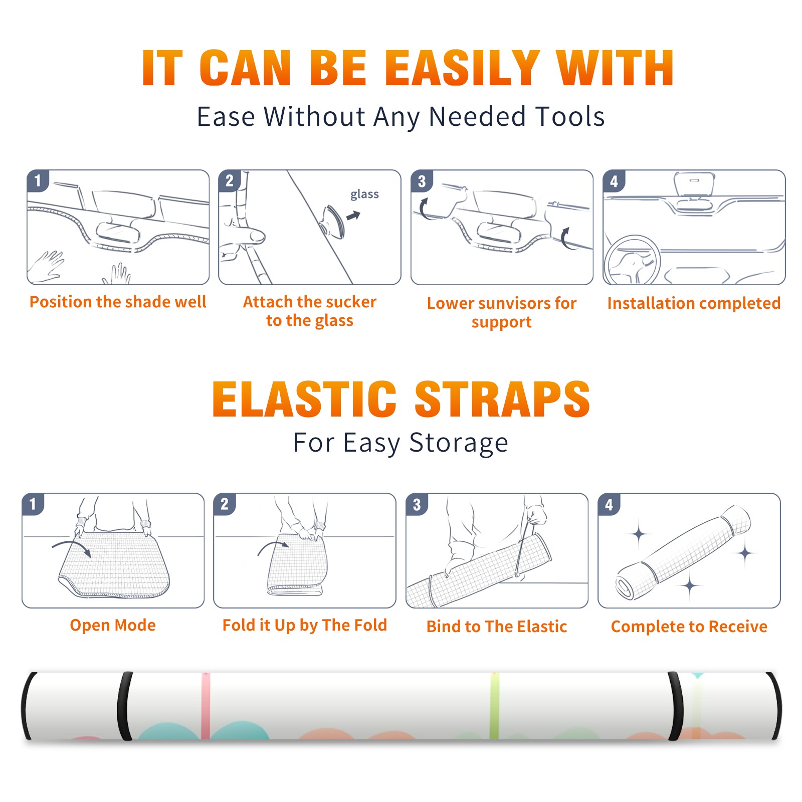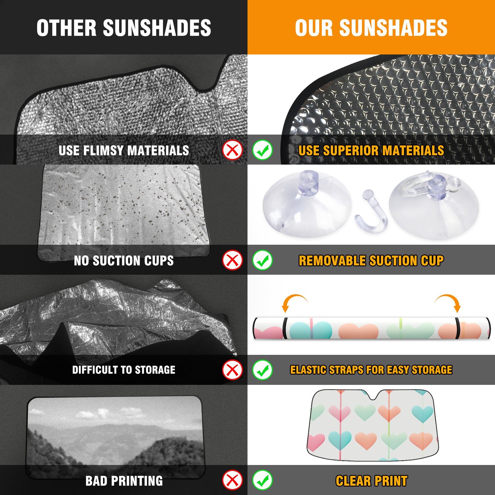 • <b>Foldable Premium Car Windshield Sunshade is your great solution to reduce your car’s interior temperature dramatically!This is definitely a must-have item for your summer travel! </b> <br> ●<b>Size: 55"L x 30"W </b> <br> ●<b>Blocking Uv Rays & Heat Insulation</b><br> Our vehicle sunshade provides effective UV, sun, and summer heat protection .Maintains dashboards by preventing fading and cracking <br> ●<b>Easy-To-Store Folding Design Makes Storage Convenient</b> <br> Car sunshades comes with removable suction cups and elastic bands that you can install or remove easily and quickly. In a matter of seconds you can install your purchased windshield visor. And the detachable suction cups on the automotive's sun visor leave no marks on the windows when removed. When not in use, the front windshield can be conveniently and effectively placed on the door pocket or the dashboard, which is beautiful and does not occupy the interior space.<br> <br> <b>Stay cool and protected this summer with our fun and functional car windshield sun shade!Perfectly crafted to fit most vehicles, this premium quality sun blocker is your go-to automotive accessory. it's time to say goodbye to scorching hot seats and hello to comfort on every drive!</b>