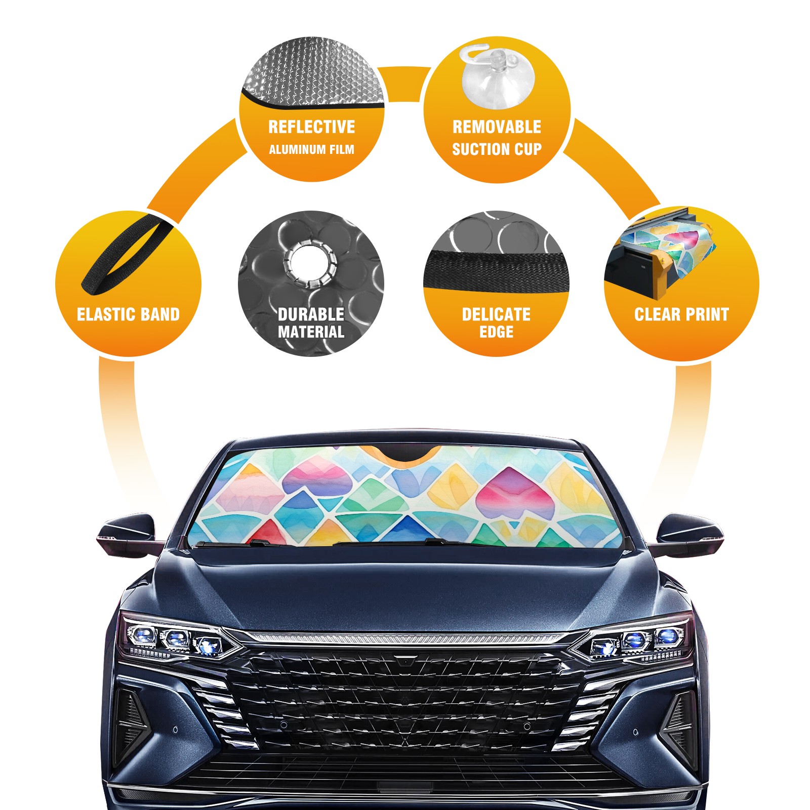 <b>Foldable Premium Car Windshield Sunshade is your great solution to reduce your car’s interior temperature dramatically!This is definitely a must-have item for your summer travel! </b> <br> ●<b>Size: 55"L x 30"W </b> <br> ●<b>Blocking Uv Rays & Heat Insulation</b><br> Our vehicle sunshade provides effective UV, sun, and summer heat protection .Maintains dashboards by preventing fading and cracking <br> ●<b>Easy-To-Store Folding Design Makes Storage Convenient</b> <br> Car sunshades comes with removable suction cups and elastic bands that you can install or remove easily and quickly. In a matter of seconds you can install your purchased windshield visor. And the detachable suction cups on the automotive's sun visor leave no marks on the windows when removed. When not in use, the front windshield can be conveniently and effectively placed on the door pocket or the dashboard, which is beautiful and does not occupy the interior space.<br> <br> <b>Stay cool and protected this summer with our fun and functional car windshield sun shade!Perfectly crafted to fit most vehicles, this premium quality sun blocker is your go-to automotive accessory. it's time to say goodbye to scorching hot seats and hello to comfort on every drive!</b>