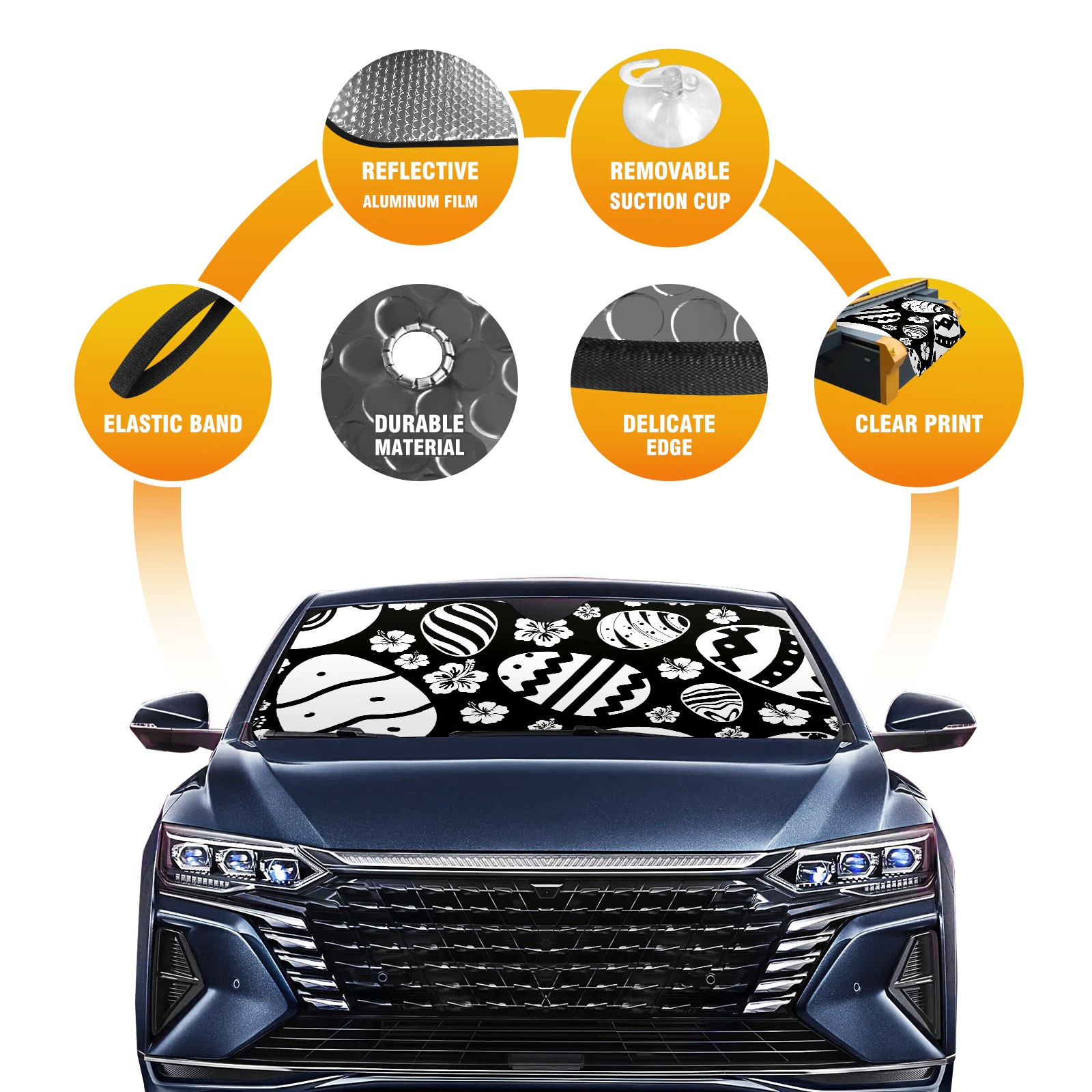 • <b>Foldable Premium Car Windshield Sunshade is your great solution to reduce your car’s interior temperature dramatically!This is definitely a must-have item for your summer travel! </b> <br> ●<b>Size: 55"L x 30"W </b> <br> ●<b>Blocking Uv Rays & Heat Insulation</b><br> Our vehicle sunshade provides effective UV, sun, and summer heat protection .Maintains dashboards by preventing fading and cracking <br> ●<b>Easy-To-Store Folding Design Makes Storage Convenient</b> <br> Car sunshades comes with removable suction cups and elastic bands that you can install or remove easily and quickly. In a matter of seconds you can install your purchased windshield visor. And the detachable suction cups on the automotive's sun visor leave no marks on the windows when removed. When not in use, the front windshield can be conveniently and effectively placed on the door pocket or the dashboard, which is beautiful and does not occupy the interior space.<br> <br> <b>Stay cool and protected this summer with our fun and functional car windshield sun shade!Perfectly crafted to fit most vehicles, this premium quality sun blocker is your go-to automotive accessory. it's time to say goodbye to scorching hot seats and hello to comfort on every drive!</b>