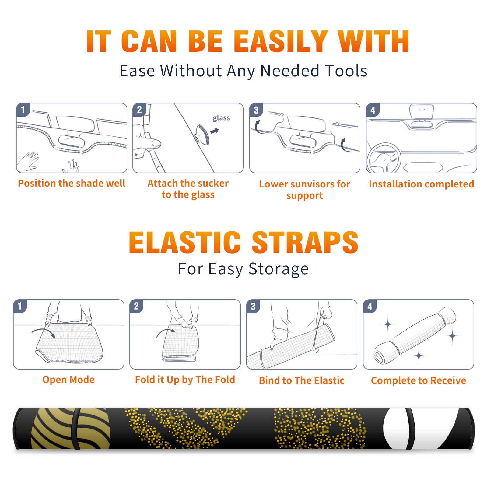 <b>Foldable Premium Car Windshield Sunshade is your great solution to reduce your car’s interior temperature dramatically!This is definitely a must-have item for your summer travel! </b> <br> ●<b>Size: 55"L x 30"W </b> <br> ●<b>Blocking Uv Rays & Heat Insulation</b><br> Our vehicle sunshade provides effective UV, sun, and summer heat protection .Maintains dashboards by preventing fading and cracking <br> ●<b>Easy-To-Store Folding Design Makes Storage Convenient</b> <br> Car sunshades comes with removable suction cups and elastic bands that you can install or remove easily and quickly. In a matter of seconds you can install your purchased windshield visor. And the detachable suction cups on the automotive's sun visor leave no marks on the windows when removed. When not in use, the front windshield can be conveniently and effectively placed on the door pocket or the dashboard, which is beautiful and does not occupy the interior space.<br> <br> <b>Stay cool and protected this summer with our fun and functional car windshield sun shade!Perfectly crafted to fit most vehicles, this premium quality sun blocker is your go-to automotive accessory. it's time to say goodbye to scorching hot seats and hello to comfort on every drive!</b>