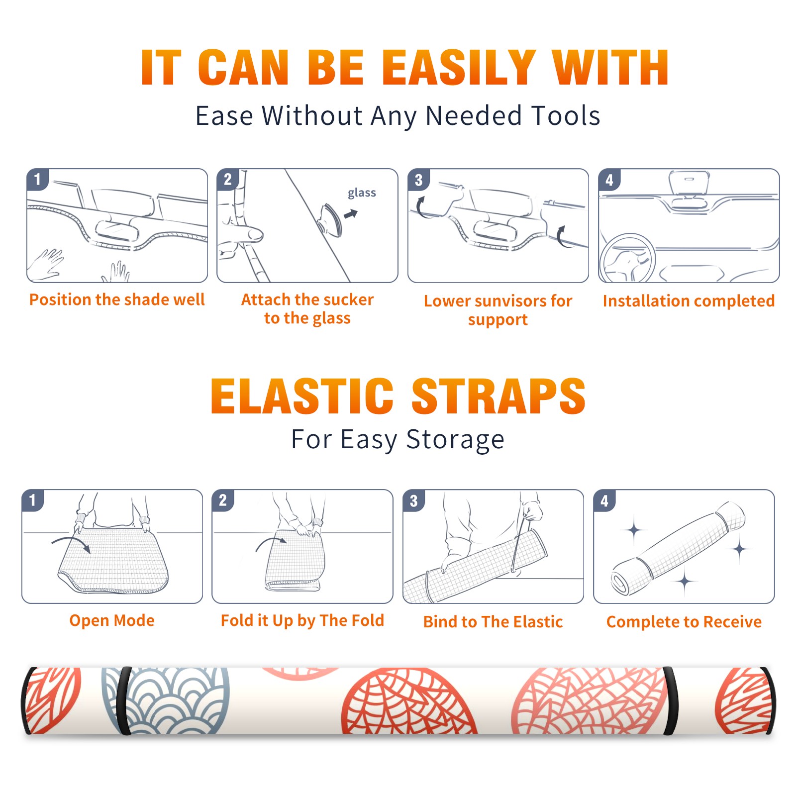 • <b>Foldable Premium Car Windshield Sunshade is your great solution to reduce your car’s interior temperature dramatically!This is definitely a must-have item for your summer travel! </b> <br> ●<b>Size: 55"L x 30"W </b> <br> ●<b>Blocking Uv Rays & Heat Insulation</b><br> Our vehicle sunshade provides effective UV, sun, and summer heat protection .Maintains dashboards by preventing fading and cracking <br> ●<b>Easy-To-Store Folding Design Makes Storage Convenient</b> <br> Car sunshades comes with removable suction cups and elastic bands that you can install or remove easily and quickly. In a matter of seconds you can install your purchased windshield visor. And the detachable suction cups on the automotive's sun visor leave no marks on the windows when removed. When not in use, the front windshield can be conveniently and effectively placed on the door pocket or the dashboard, which is beautiful and does not occupy the interior space.<br> <br> <b>Stay cool and protected this summer with our fun and functional car windshield sun shade!Perfectly crafted to fit most vehicles, this premium quality sun blocker is your go-to automotive accessory. it's time to say goodbye to scorching hot seats and hello to comfort on every drive!</b>
