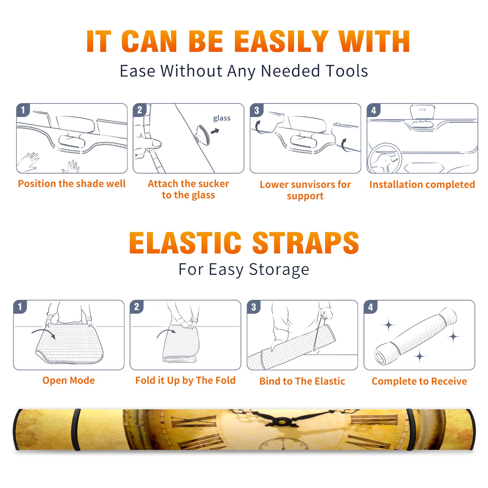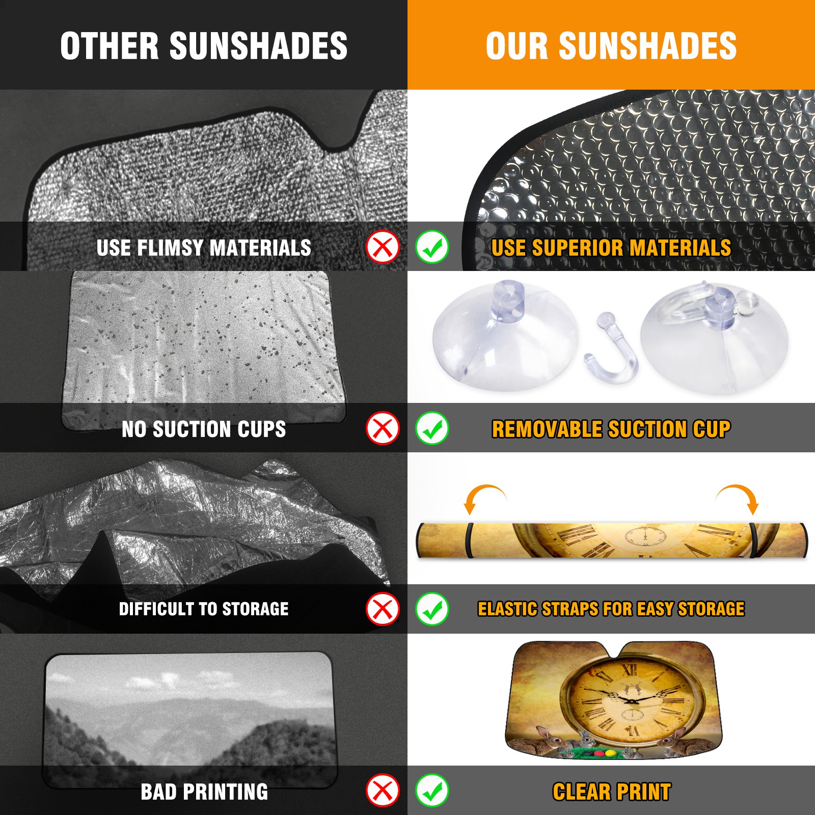 <b>Foldable Premium Car Windshield Sunshade is your great solution to reduce your car’s interior temperature dramatically!This is definitely a must-have item for your summer travel! </b> <br> ●<b>Size: 55"L x 30"W </b> <br> ●<b>Blocking Uv Rays & Heat Insulation</b><br> Our vehicle sunshade provides effective UV, sun, and summer heat protection .Maintains dashboards by preventing fading and cracking <br> ●<b>Easy-To-Store Folding Design Makes Storage Convenient</b> <br> Car sunshades comes with removable suction cups and elastic bands that you can install or remove easily and quickly. In a matter of seconds you can install your purchased windshield visor. And the detachable suction cups on the automotive's sun visor leave no marks on the windows when removed. When not in use, the front windshield can be conveniently and effectively placed on the door pocket or the dashboard, which is beautiful and does not occupy the interior space.<br> <br> <b>Stay cool and protected this summer with our fun and functional car windshield sun shade!Perfectly crafted to fit most vehicles, this premium quality sun blocker is your go-to automotive accessory. it's time to say goodbye to scorching hot seats and hello to comfort on every drive!</b>