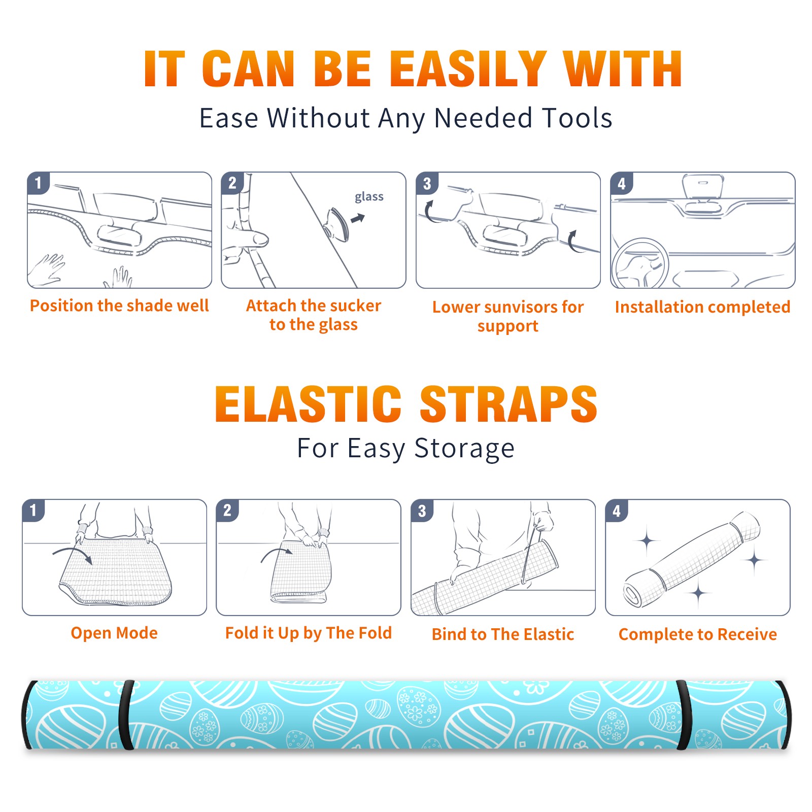 • <b>Foldable Premium Car Windshield Sunshade is your great solution to reduce your car’s interior temperature dramatically!This is definitely a must-have item for your summer travel! </b> <br> ●<b>Size: 55"L x 30"W </b> <br> ●<b>Blocking Uv Rays & Heat Insulation</b><br> Our vehicle sunshade provides effective UV, sun, and summer heat protection .Maintains dashboards by preventing fading and cracking <br> ●<b>Easy-To-Store Folding Design Makes Storage Convenient</b> <br> Car sunshades comes with removable suction cups and elastic bands that you can install or remove easily and quickly. In a matter of seconds you can install your purchased windshield visor. And the detachable suction cups on the automotive's sun visor leave no marks on the windows when removed. When not in use, the front windshield can be conveniently and effectively placed on the door pocket or the dashboard, which is beautiful and does not occupy the interior space.<br> <br> <b>Stay cool and protected this summer with our fun and functional car windshield sun shade!Perfectly crafted to fit most vehicles, this premium quality sun blocker is your go-to automotive accessory. it's time to say goodbye to scorching hot seats and hello to comfort on every drive!</b>