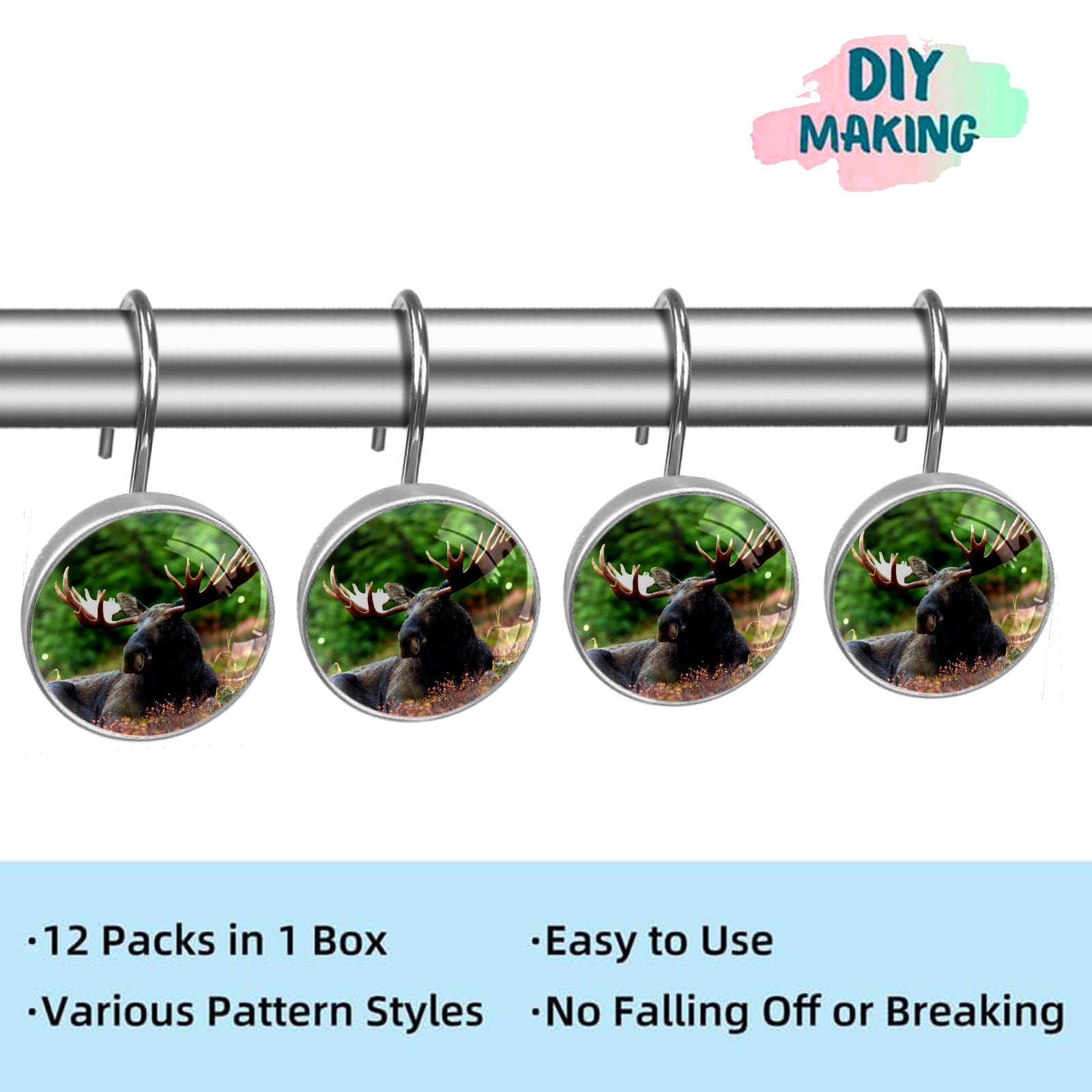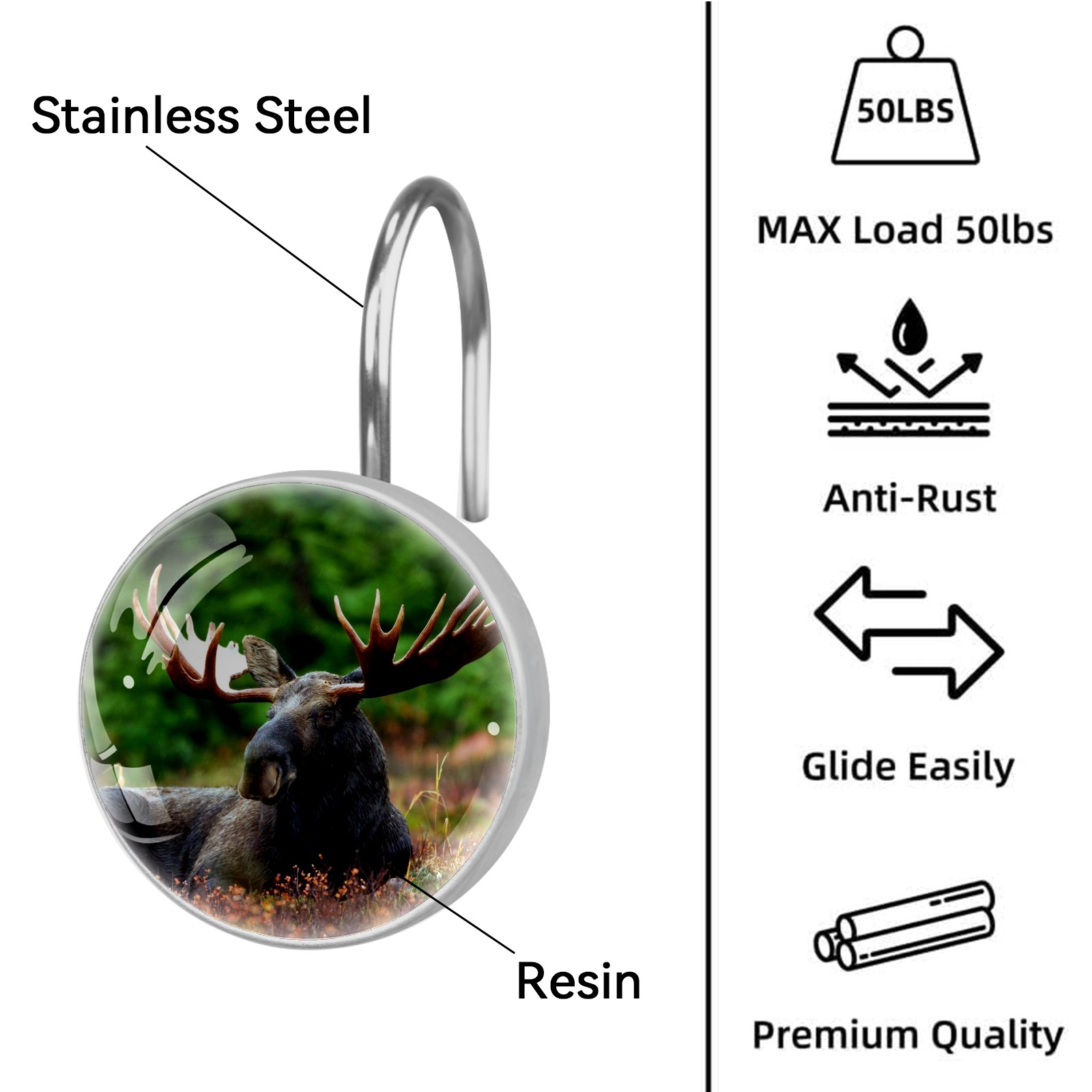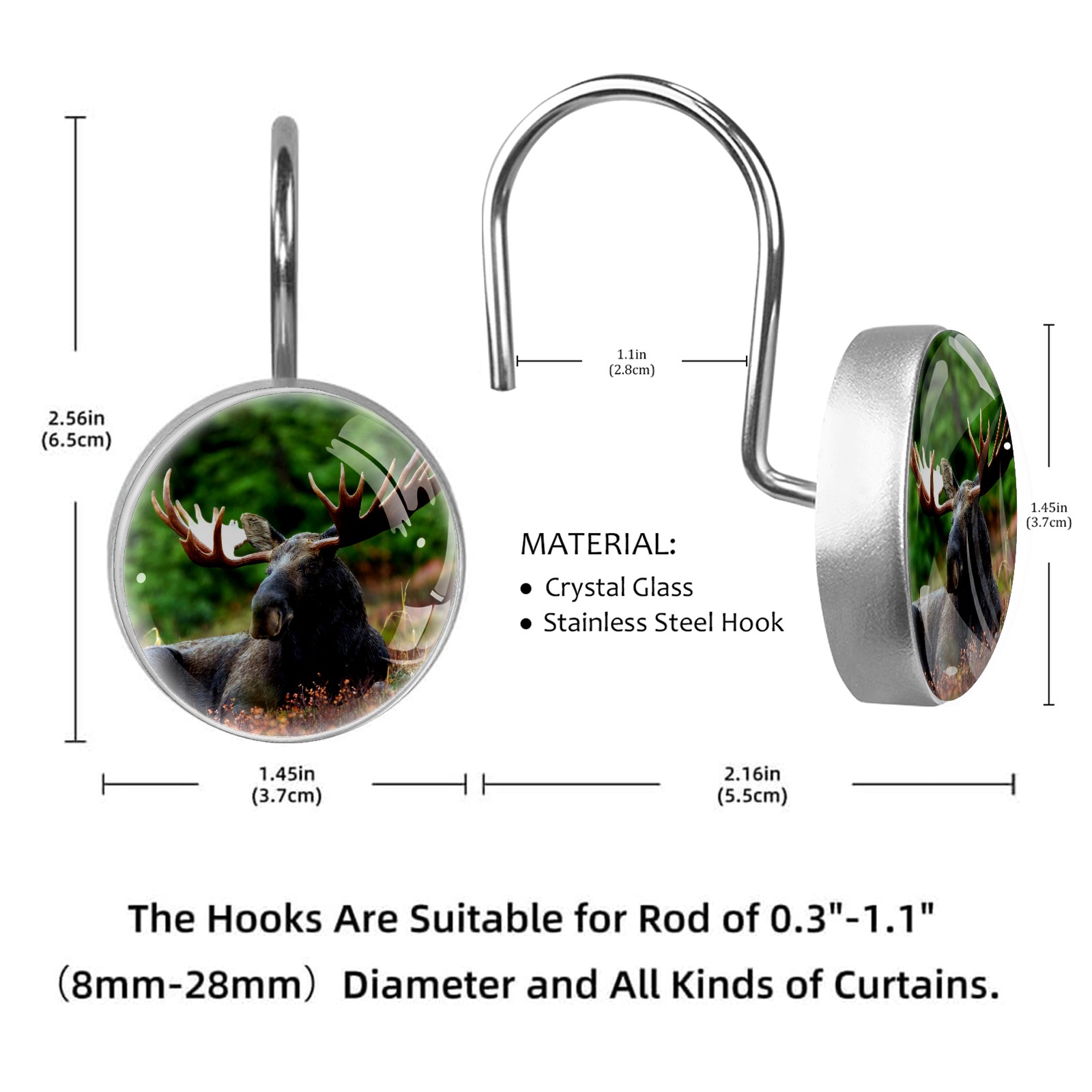 Decorative Black Moose Lying On Ground Shower Curtain Hooks 12pcs Crystal Glass Rustproof Shower Hooks for Bathroom Home Decor Stainless Steel Resin Shower Curtain Rings