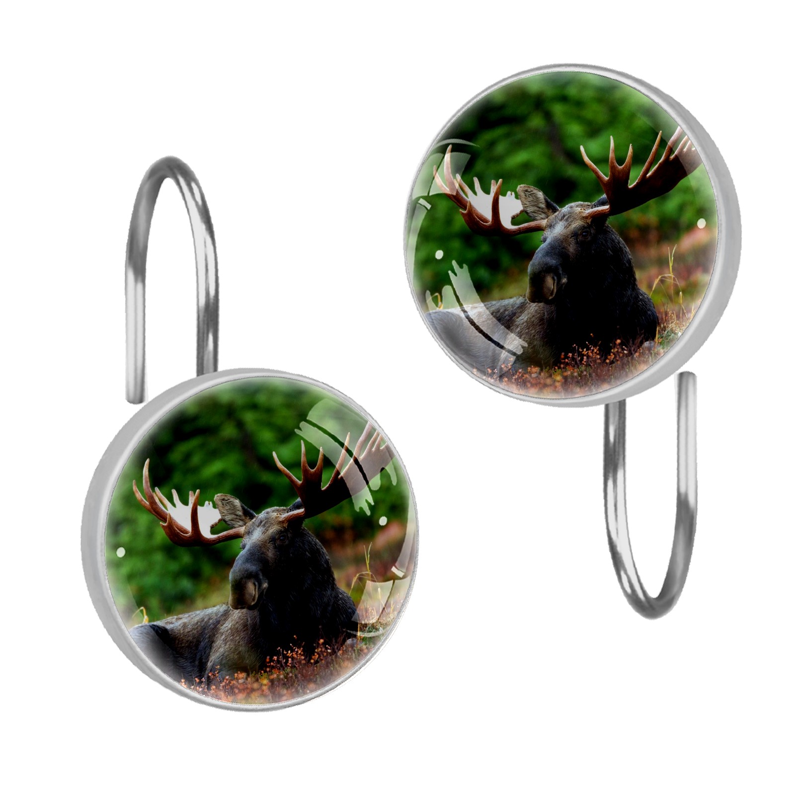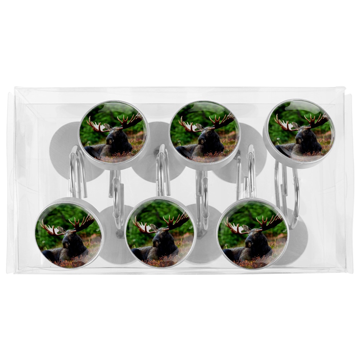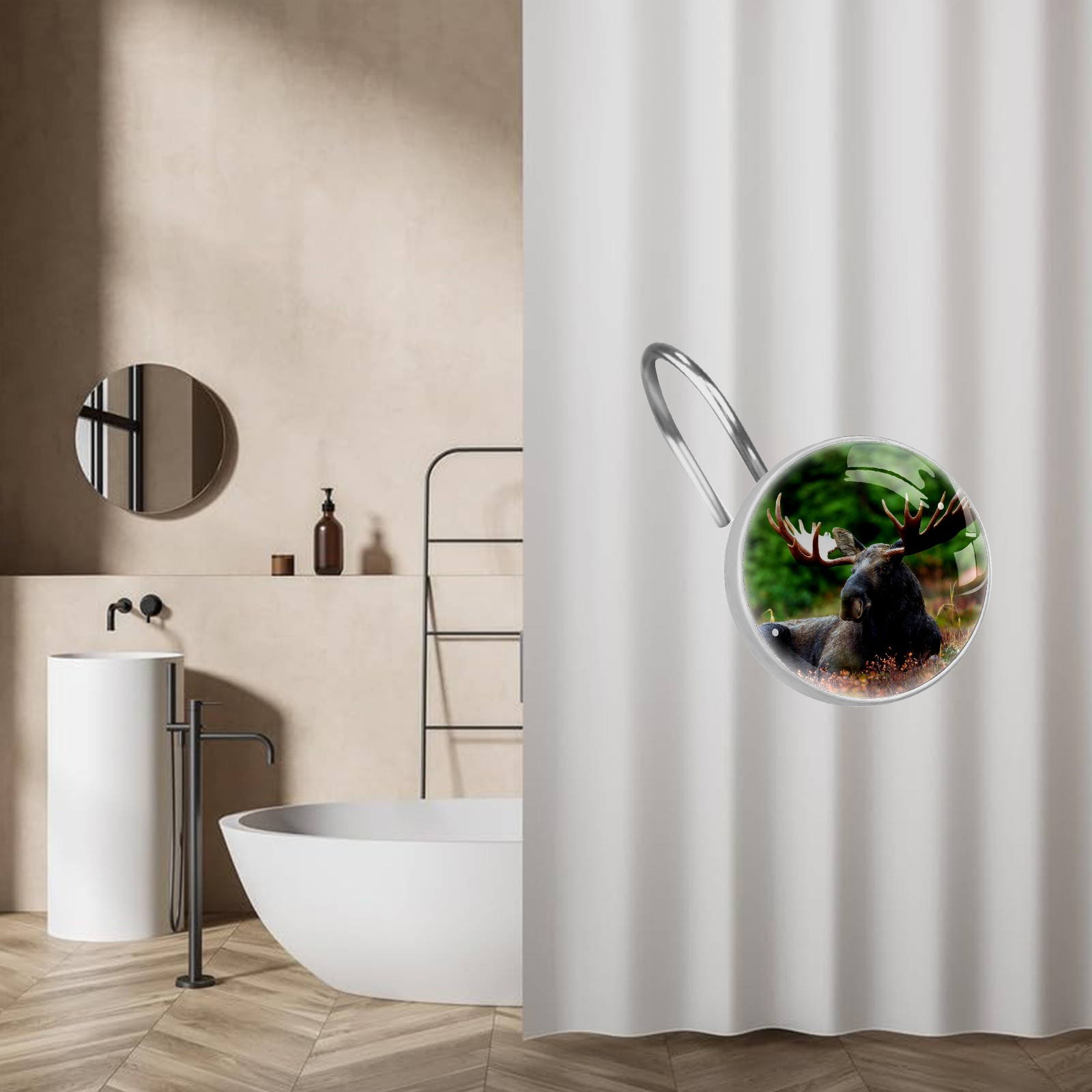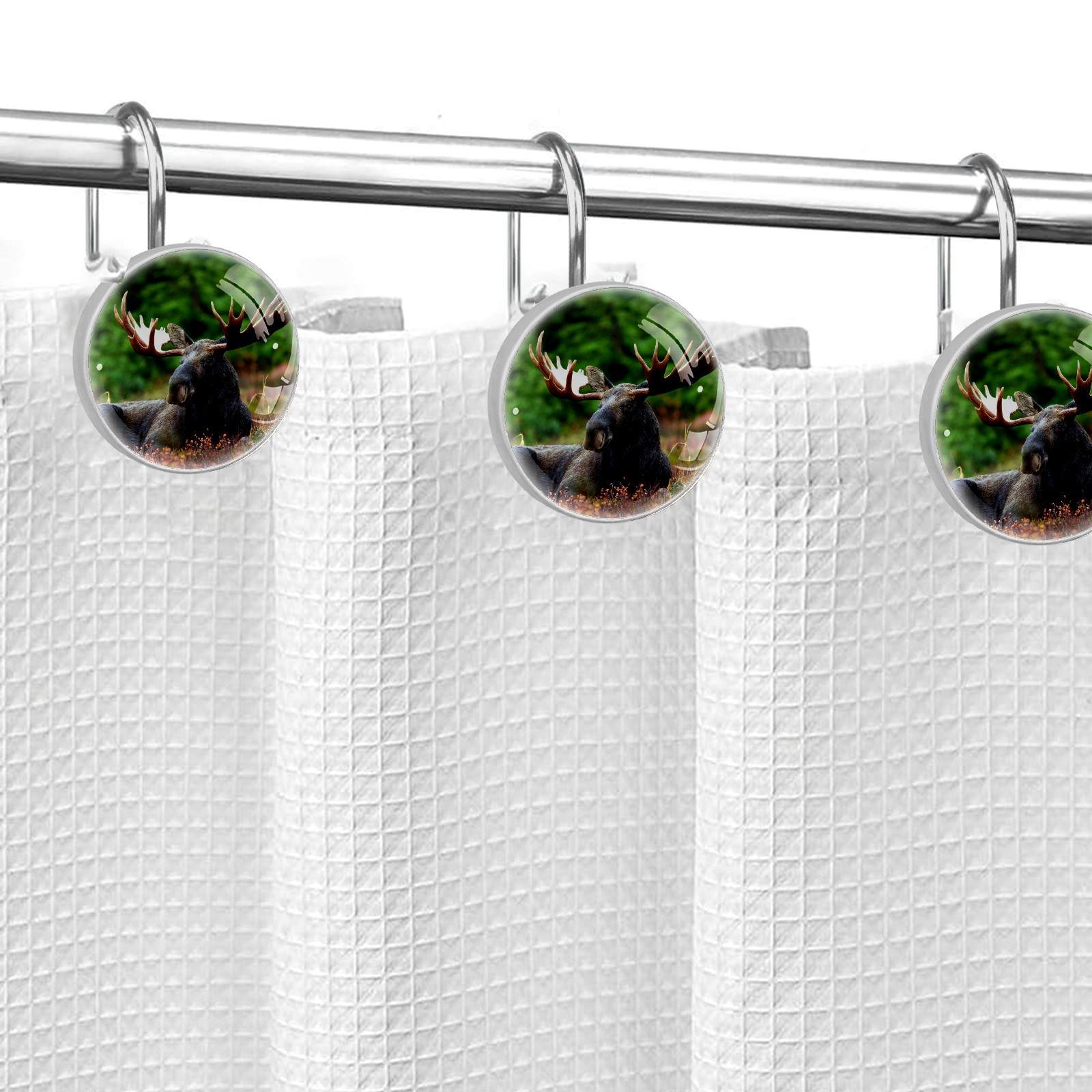 Decorative Black Moose Lying On Ground Shower Curtain Hooks 12pcs Crystal Glass Rustproof Shower Hooks for Bathroom Home Decor Stainless Steel Resin Shower Curtain Rings