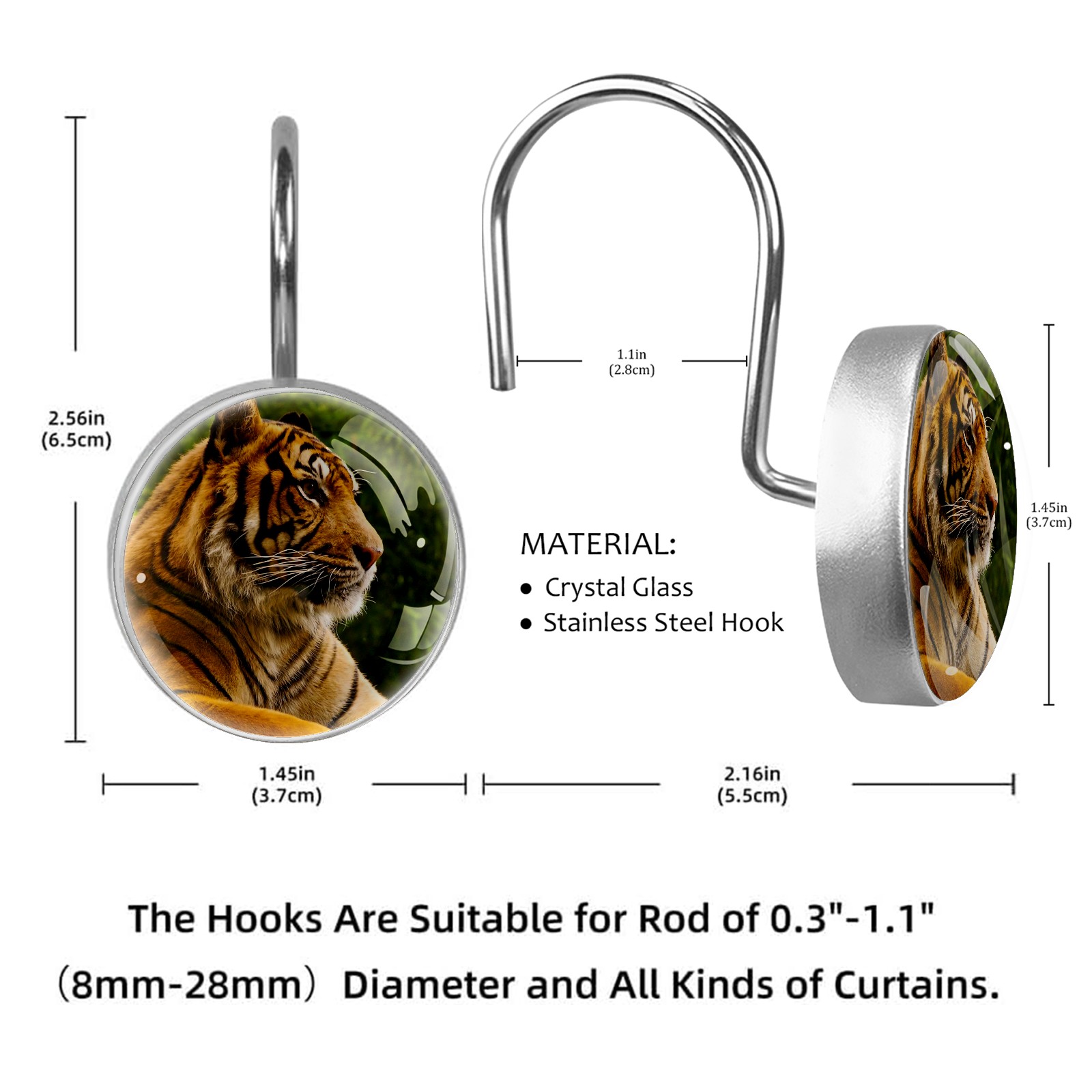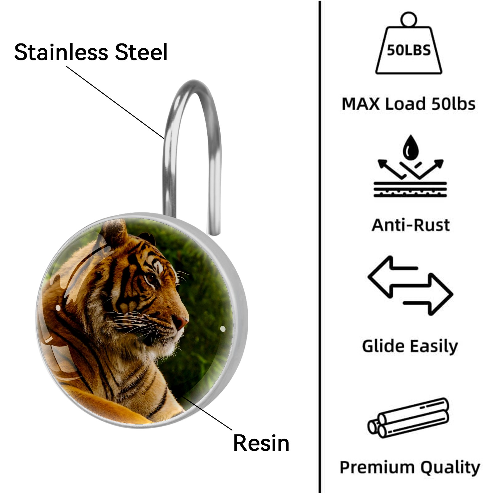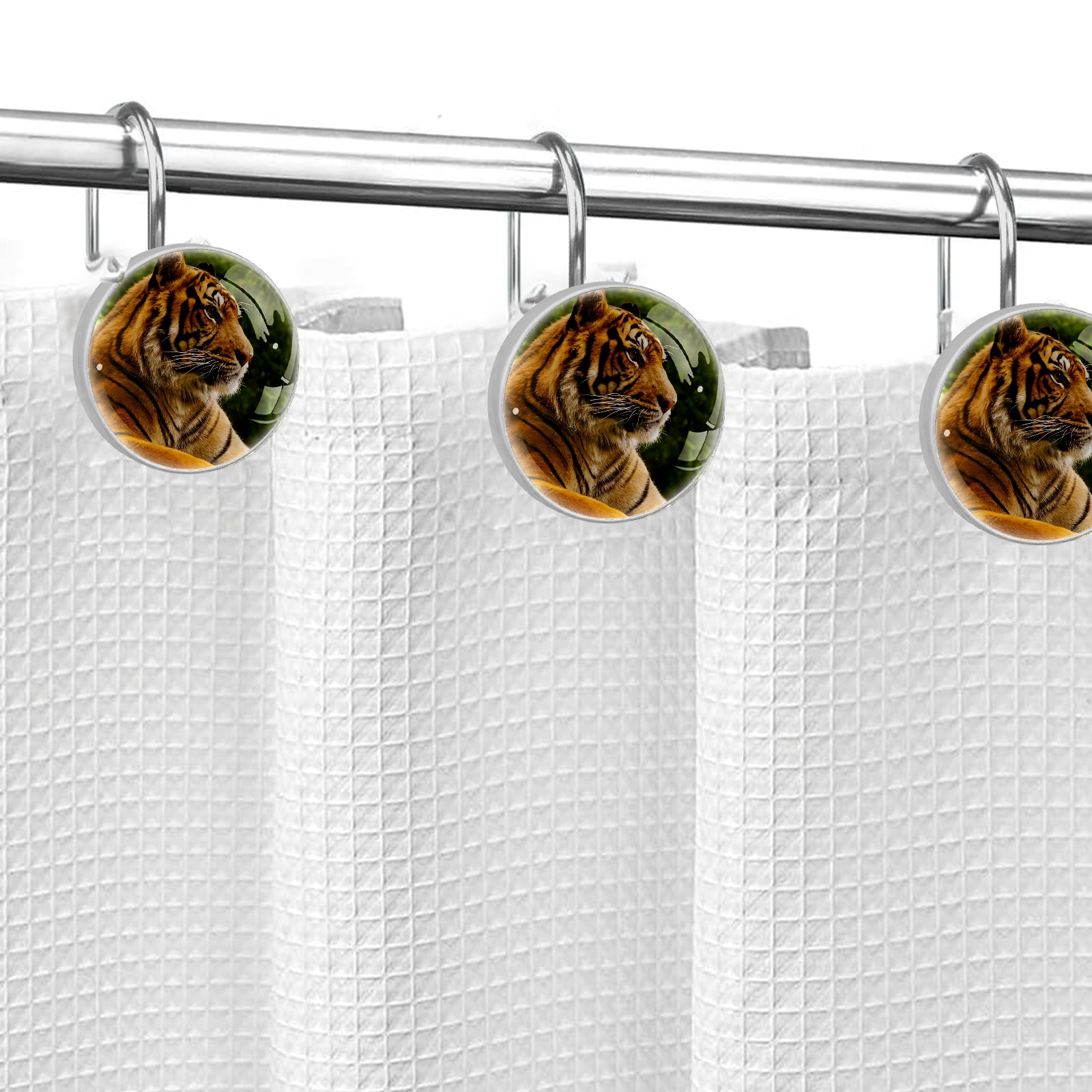 Decorative Animal Tiger (1) Shower Curtain Hooks 12pcs Crystal Glass Rustproof Shower Hooks for Bathroom Home Decor Stainless Steel Resin Shower Curtain Rings