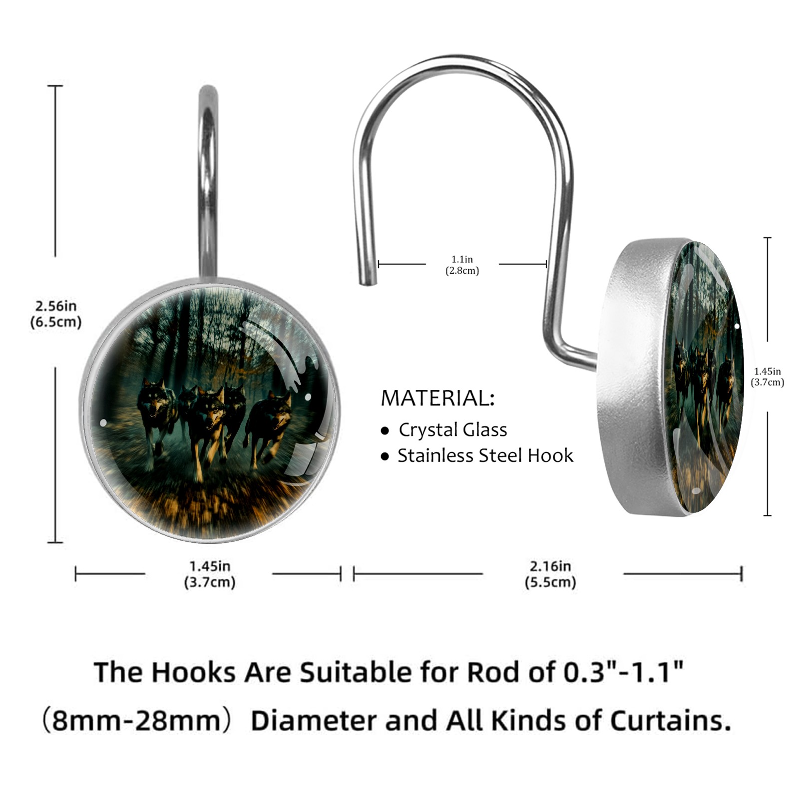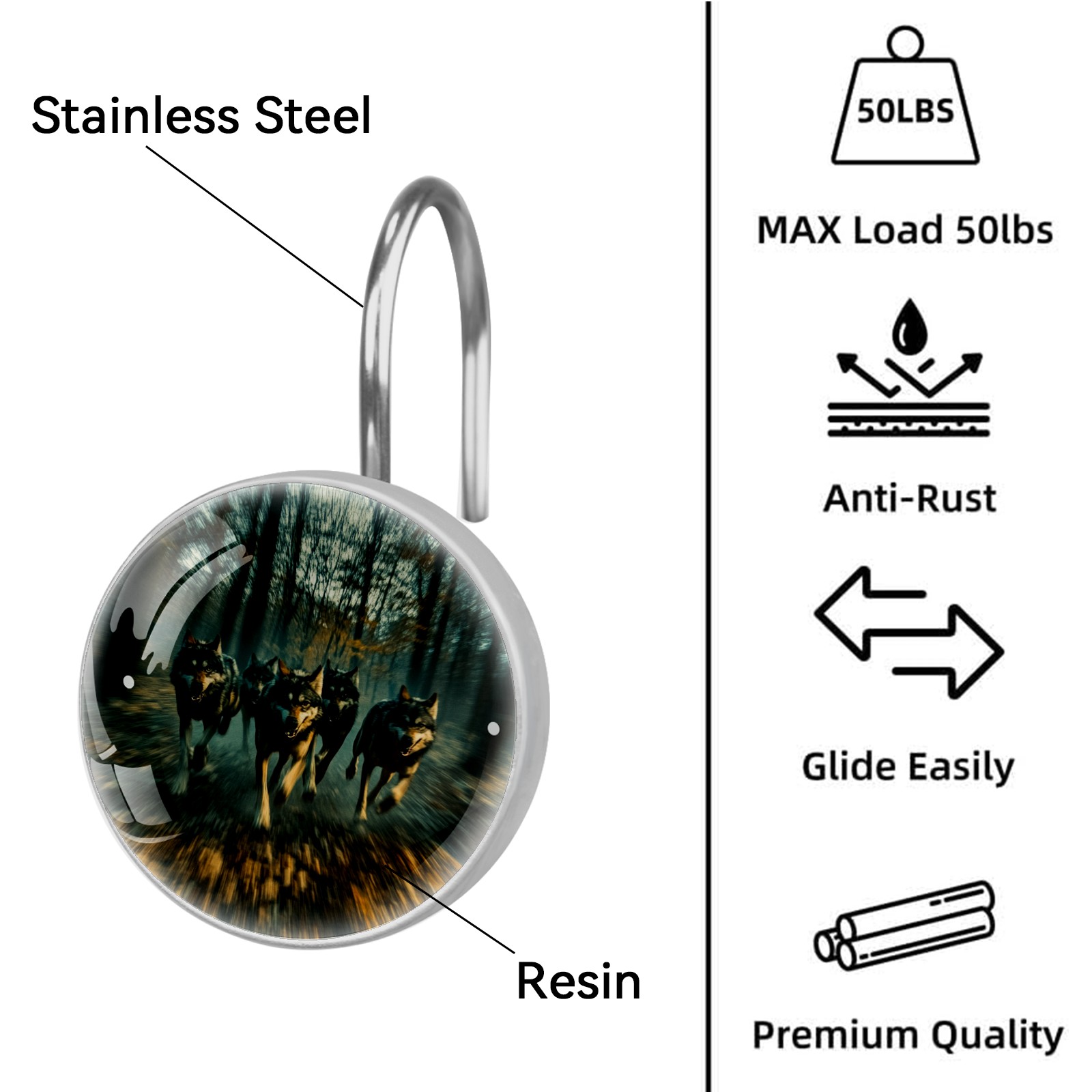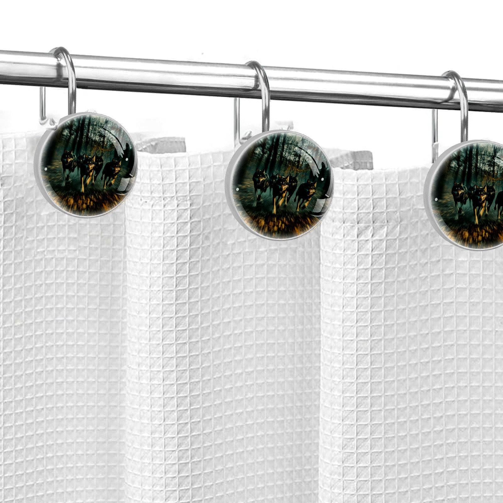 Decorative Wolves Shower Curtain Hooks 12pcs Crystal Glass Rustproof Shower Hooks for Bathroom Home Decor Stainless Steel Resin Shower Curtain Rings