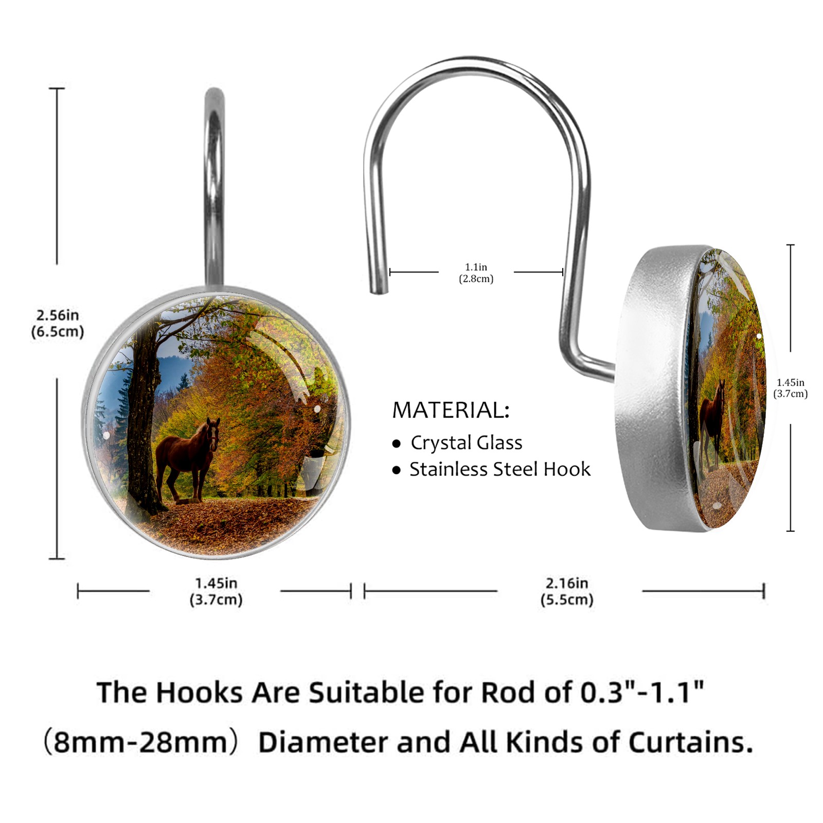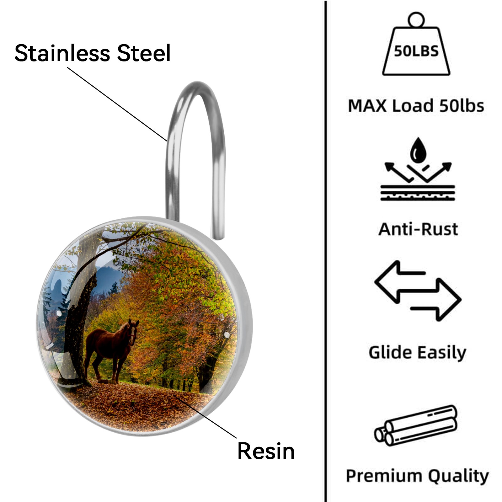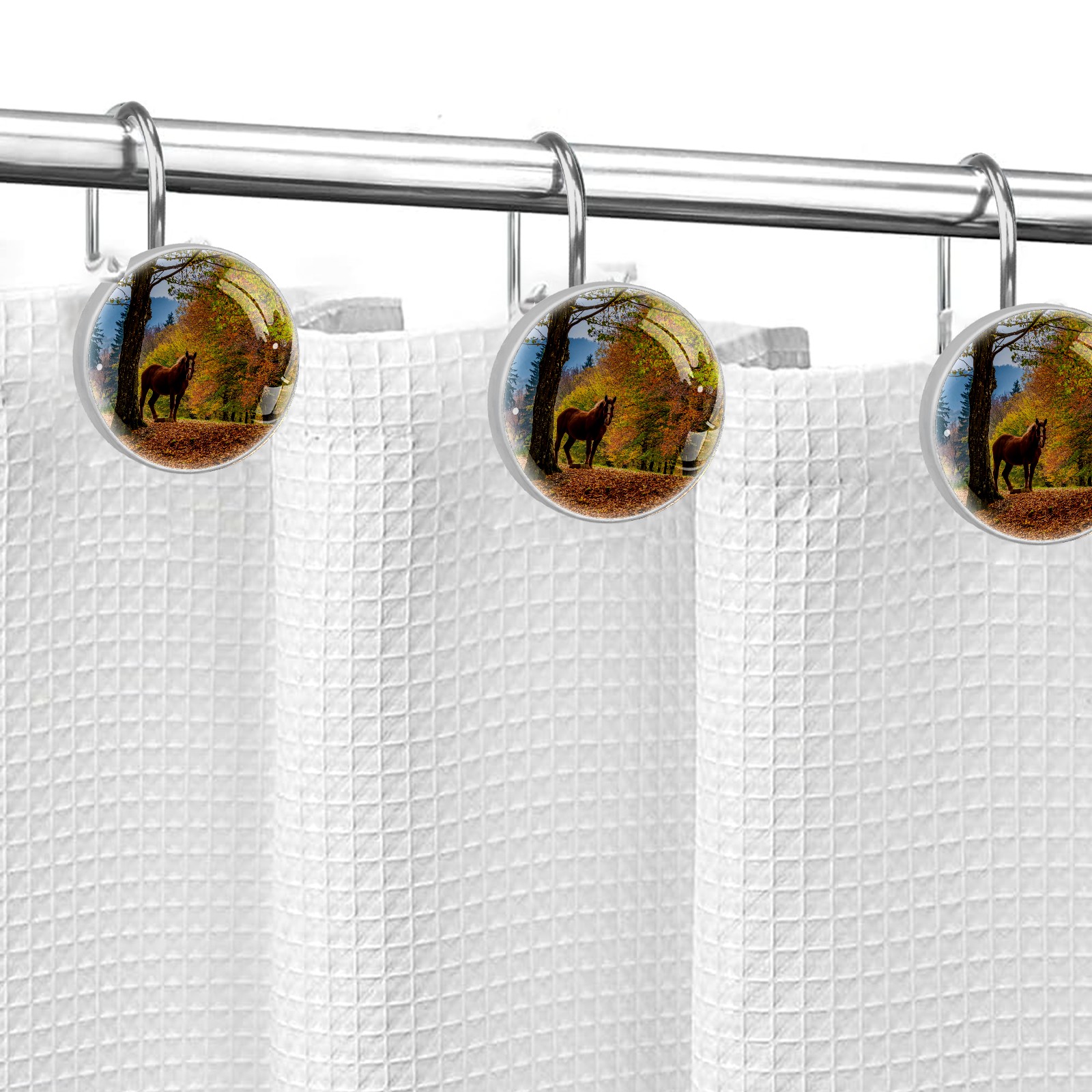 Decorative Fall Trees Leaves Horse Shower Curtain Hooks 12pcs Crystal Glass Rustproof Shower Hooks for Bathroom Home Decor Stainless Steel Resin Shower Curtain Rings