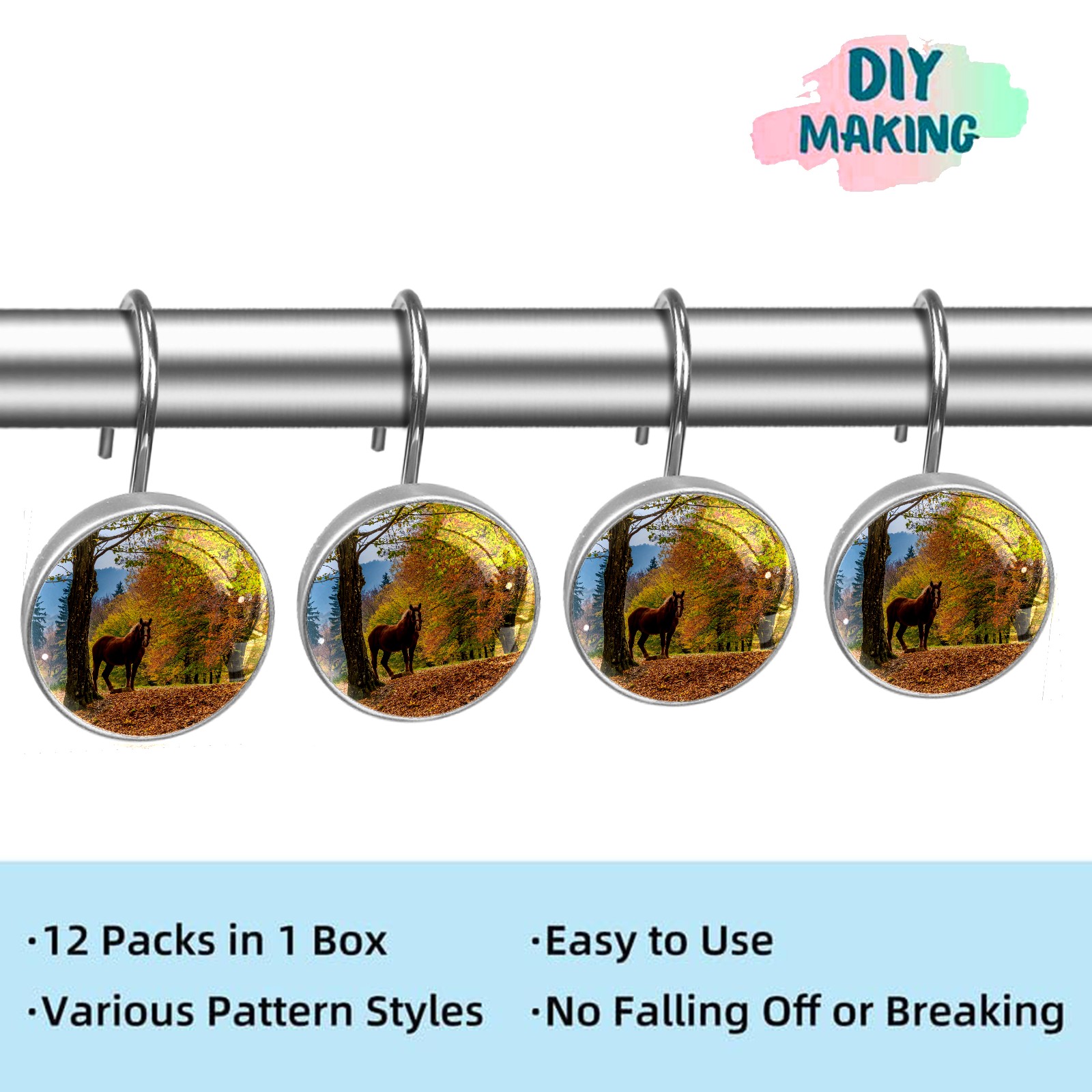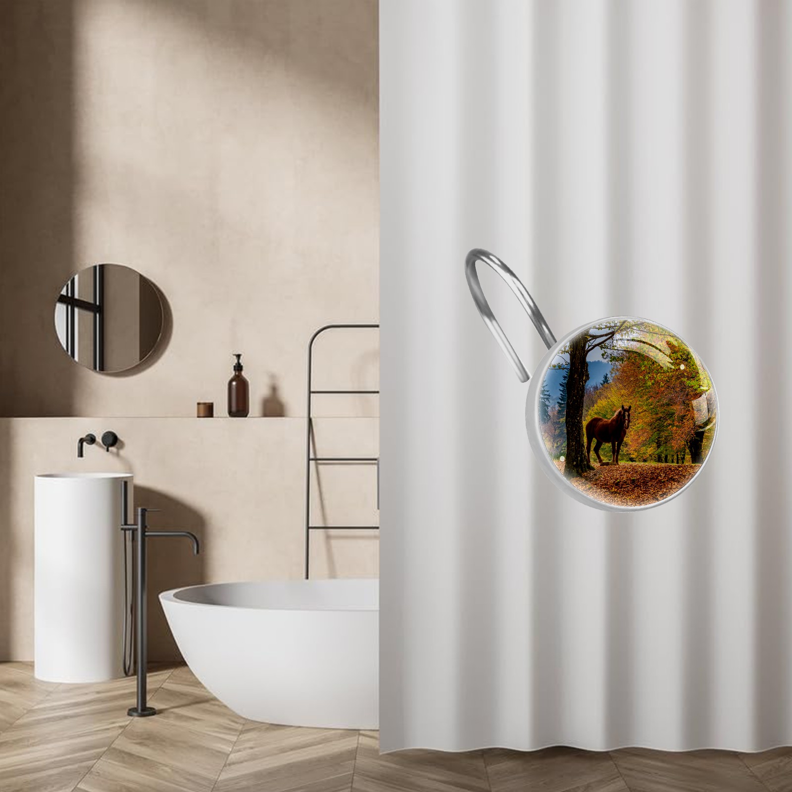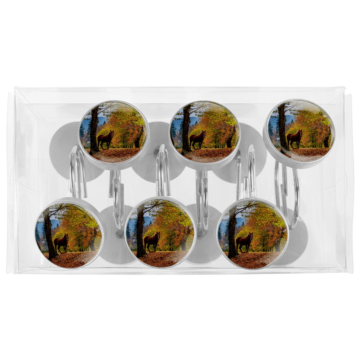 Decorative Fall Trees Leaves Horse Shower Curtain Hooks 12pcs Crystal Glass Rustproof Shower Hooks for Bathroom Home Decor Stainless Steel Resin Shower Curtain Rings
