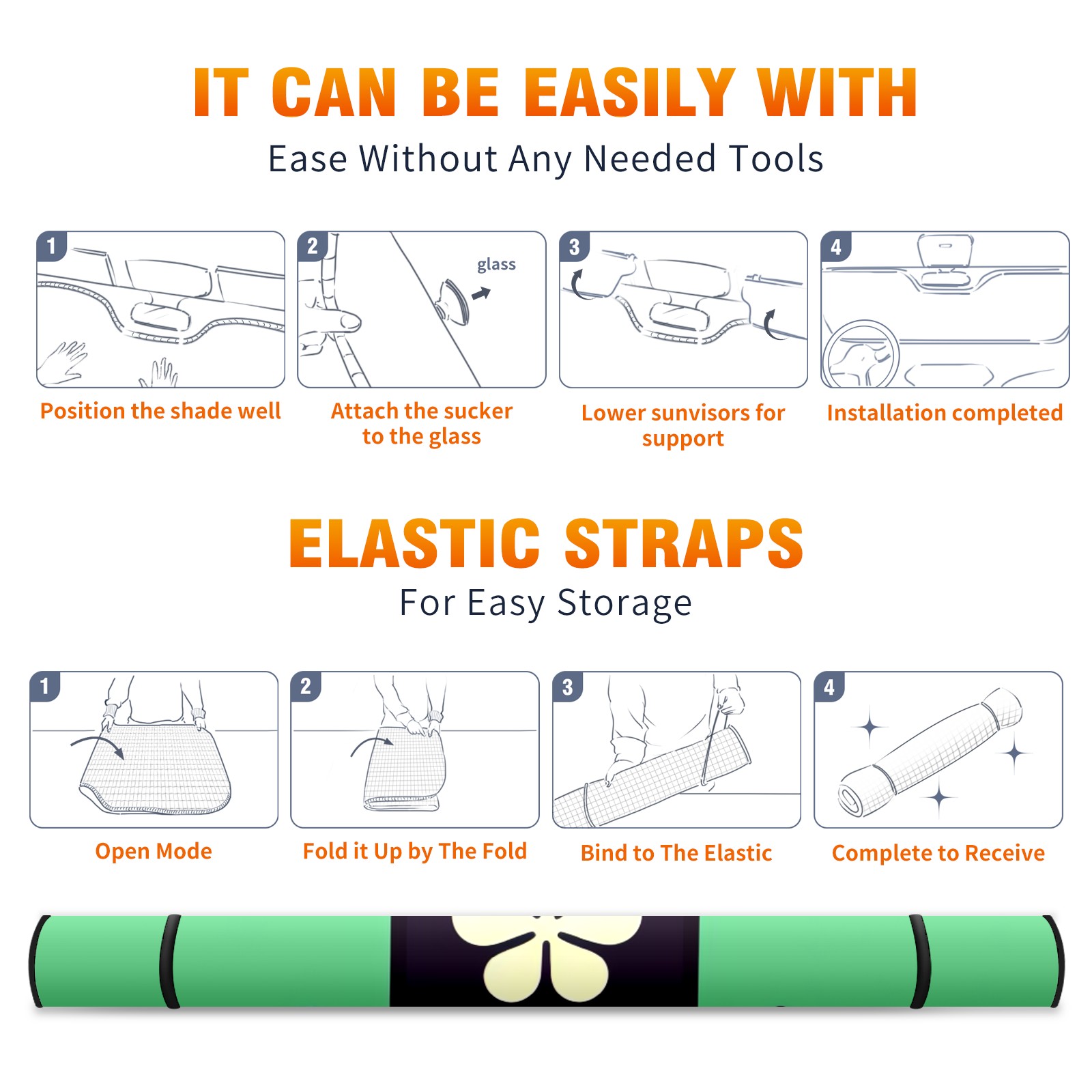 <b>Foldable Premium Car Windshield Sunshade is your great solution to reduce your car’s interior temperature dramatically!This is definitely a must-have item for your summer travel! </b> <br> ●<b>Size: 55"L x 30"W </b> <br> ●<b>Blocking Uv Rays & Heat Insulation</b><br> Our vehicle sunshade provides effective UV, sun, and summer heat protection .Maintains dashboards by preventing fading and cracking <br> ●<b>Easy-To-Store Folding Design Makes Storage Convenient</b> <br> Car sunshades comes with removable suction cups and elastic bands that you can install or remove easily and quickly. In a matter of seconds you can install your purchased windshield visor. And the detachable suction cups on the automotive's sun visor leave no marks on the windows when removed. When not in use, the front windshield can be conveniently and effectively placed on the door pocket or the dashboard, which is beautiful and does not occupy the interior space.<br> <br> <b>Stay cool and protected this summer with our fun and functional car windshield sun shade!Perfectly crafted to fit most vehicles, this premium quality sun blocker is your go-to automotive accessory. it's time to say goodbye to scorching hot seats and hello to comfort on every drive!</b>