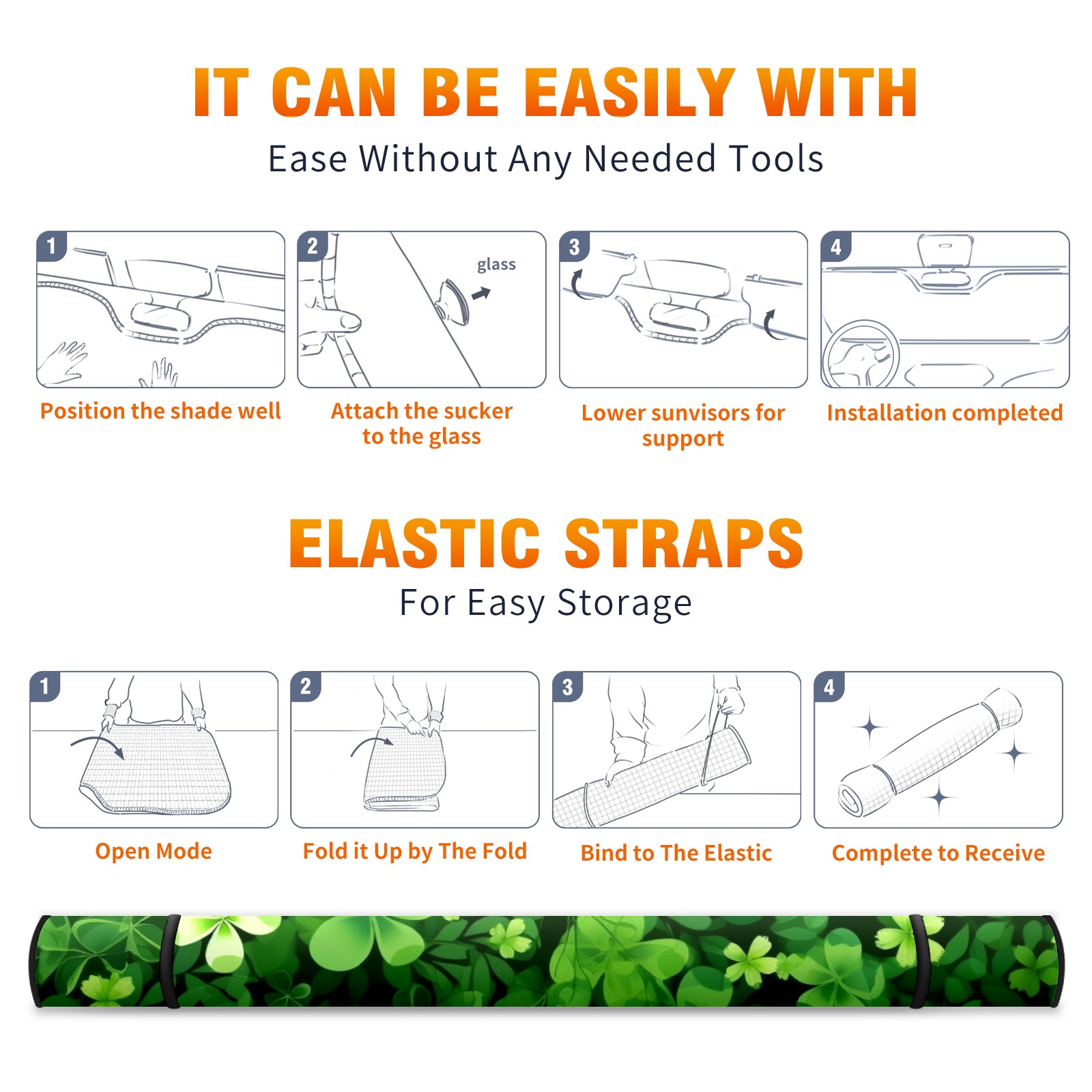 <b>Foldable Premium Car Windshield Sunshade is your great solution to reduce your car’s interior temperature dramatically!This is definitely a must-have item for your summer travel! </b> <br> ●<b>Size: 55"L x 30"W </b> <br> ●<b>Blocking Uv Rays & Heat Insulation</b><br> Our vehicle sunshade provides effective UV, sun, and summer heat protection .Maintains dashboards by preventing fading and cracking <br> ●<b>Easy-To-Store Folding Design Makes Storage Convenient</b> <br> Car sunshades comes with removable suction cups and elastic bands that you can install or remove easily and quickly. In a matter of seconds you can install your purchased windshield visor. And the detachable suction cups on the automotive's sun visor leave no marks on the windows when removed. When not in use, the front windshield can be conveniently and effectively placed on the door pocket or the dashboard, which is beautiful and does not occupy the interior space.<br> <br> <b>Stay cool and protected this summer with our fun and functional car windshield sun shade!Perfectly crafted to fit most vehicles, this premium quality sun blocker is your go-to automotive accessory. it's time to say goodbye to scorching hot seats and hello to comfort on every drive!</b>