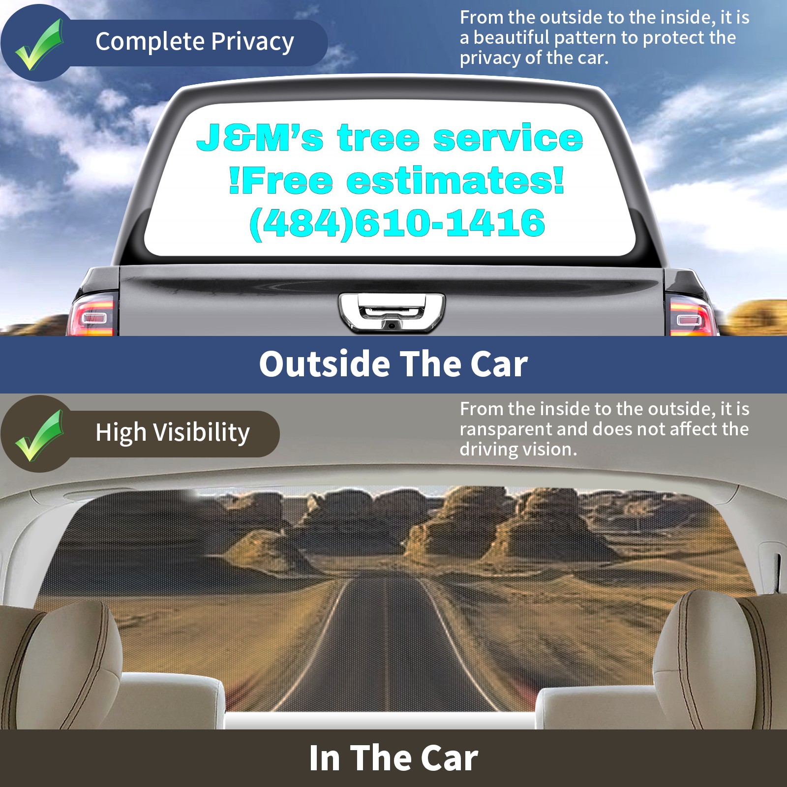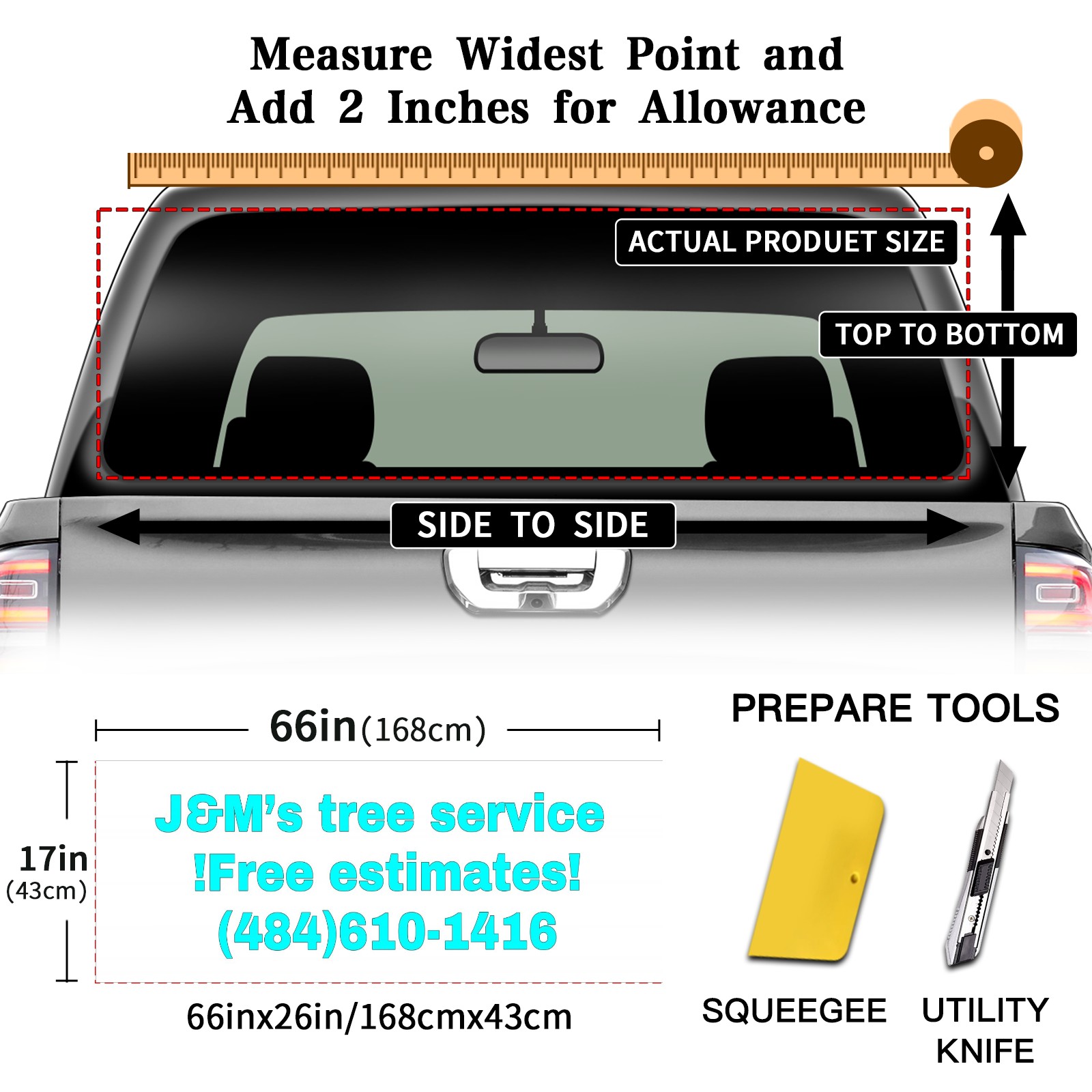 <p><strong>Truck Rear Window Graphics Decals Pickup Trucks Back Window Film Stickers 66" x 22" Perforated Vinyl Wrap Stickers Decorations for Car Rear Window</strong></p><p><strong><br /></strong></p><p><strong>Features :</strong></p><p>- Size of the rear window decals for trucks is 66x22 Inches (168x56cm).</p><p>- High quality perforated vinyl window film, one way vision sticker.</p><p>- Perforated is see through from the inside but not from outside.</p><p>- Clear printing, waterproof and durable.</p><p>- The car back window graphics stickers fits most truck and makes your vehicle more beautiful.&nbsp;</p><p><br /></p><p><strong>【Installation Instructions】</strong></p><p><strong>1. CLEAN SURFACE -</strong> Clean the rear window thoroughly and make sure the surface clean.</p><p><strong>2. STICK THE DECALS -</strong> Tear off the paper on the back and stick the decal on the window.</p><p><strong>3. SCRAPE OFF AIR BUBBLES -</strong> Use a squeegee or other card to scrape off the excess air bubbles.</p><p><strong>4. TRIM THE EXCESS -</strong> Use a knife to cut off the excess stickers of the window, finally complete.</p><p><br /></p><p>1. Please measure the size before purchasing, back window graphics decal for truck can be cut to your desired size.</p><p>2.The graphics stickers for truck back window is a great gift for yourself also can as a birthday / halloween / christmas gift for your friends and family.</p>