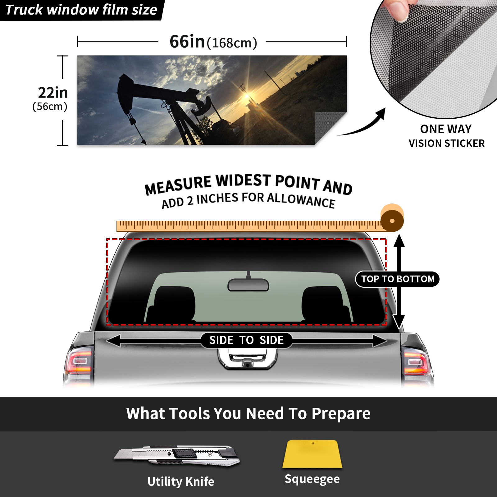 <p><strong>Truck Rear Window Graphics Decals Pickup Trucks Back Window Film Stickers 66" x 22" Perforated Vinyl Wrap Stickers Decorations for Car Rear Window</strong></p><p><strong><br /></strong></p><p><strong>Features :</strong></p><p>- Size of the rear window decals for trucks is 66x22 Inches (168x56cm).</p><p>- High quality perforated vinyl window film, one way vision sticker.</p><p>- Perforated is see through from the inside but not from outside.</p><p>- Clear printing, waterproof and durable.</p><p>- The car back window graphics stickers fits most truck and makes your vehicle more beautiful.&nbsp;</p><p><br /></p><p><strong>【Installation Instructions】</strong></p><p><strong>1. CLEAN SURFACE -</strong> Clean the rear window thoroughly and make sure the surface clean.</p><p><strong>2. STICK THE DECALS -</strong> Tear off the paper on the back and stick the decal on the window.</p><p><strong>3. SCRAPE OFF AIR BUBBLES -</strong> Use a squeegee or other card to scrape off the excess air bubbles.</p><p><strong>4. TRIM THE EXCESS -</strong> Use a knife to cut off the excess stickers of the window, finally complete.</p><p><br /></p><p>1. Please measure the size before purchasing, back window graphics decal for truck can be cut to your desired size.</p><p>2.The graphics stickers for truck back window is a great gift for yourself also can as a birthday / halloween / christmas gift for your friends and family.</p>
