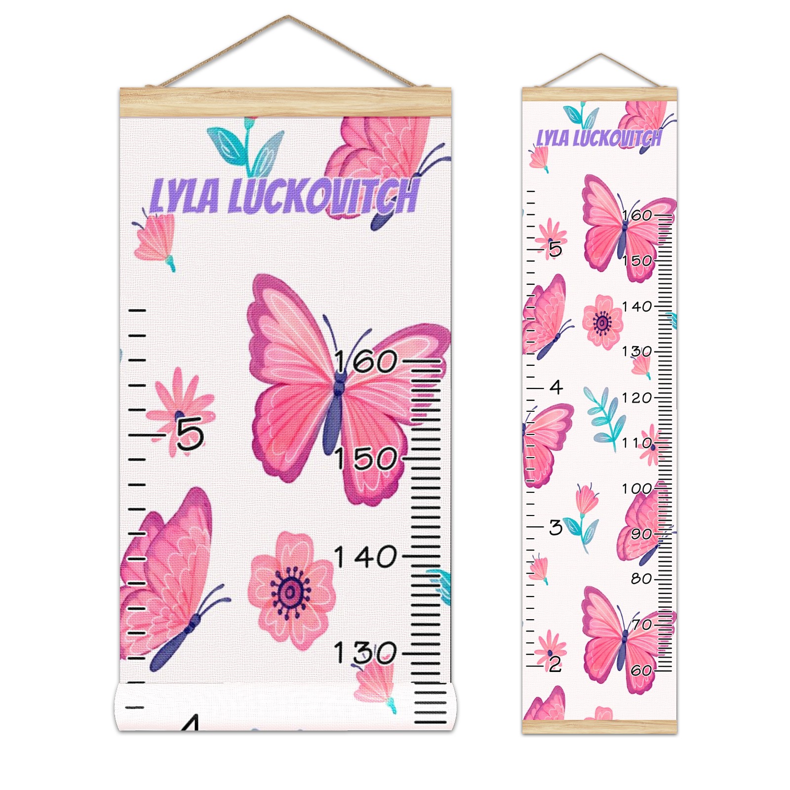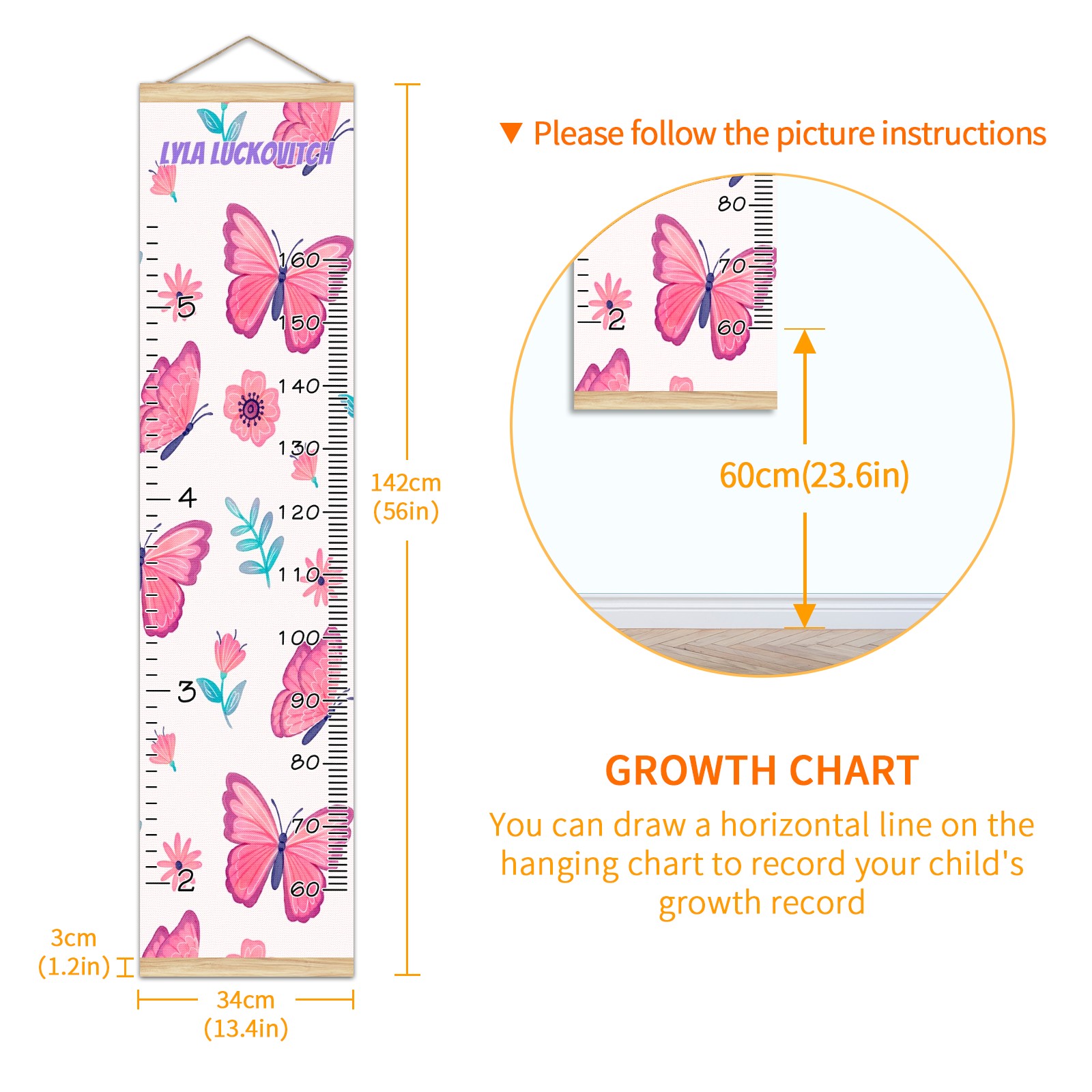 Personalized Kids Name Growth Chart Ruler for Wall Wood Frame Canvas Height Measure Chart 13.4x56 in Hanging Growth Chart Pink Butterfly & Flower1.20 Boys Girls Room Decor