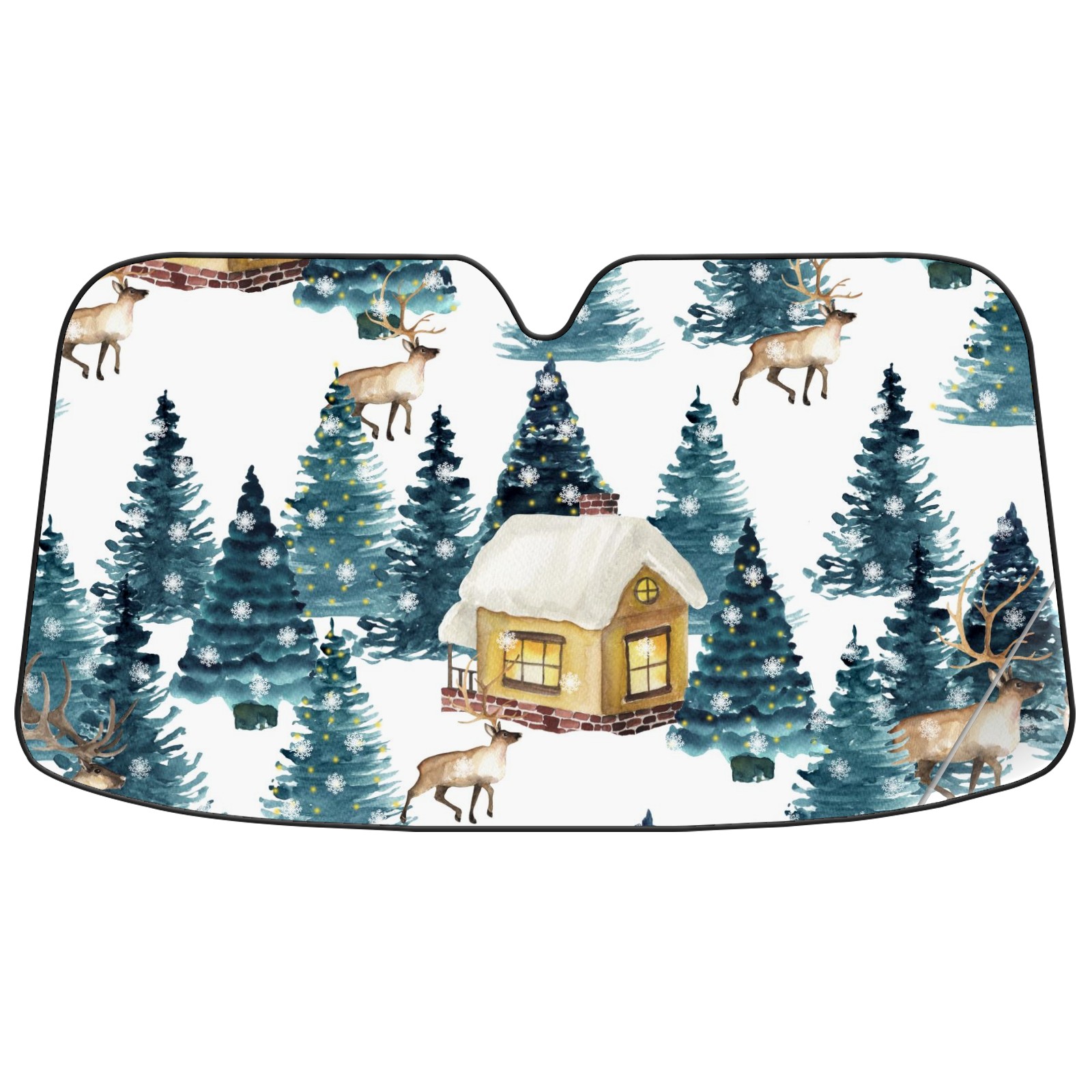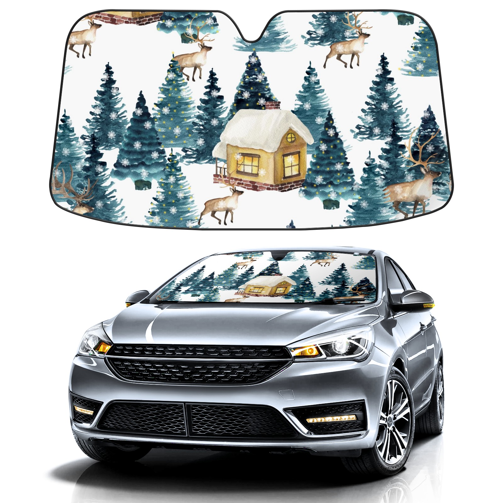 Car Windshield Sun Shade for Front Window-Moose Elk Reindeer Green Pine In Snowy Night Foldable Sun Visor Cover Sunshade for Car Windshield-Car Heat Shield Sunshade Protector-Car Privacy Sun Blocker