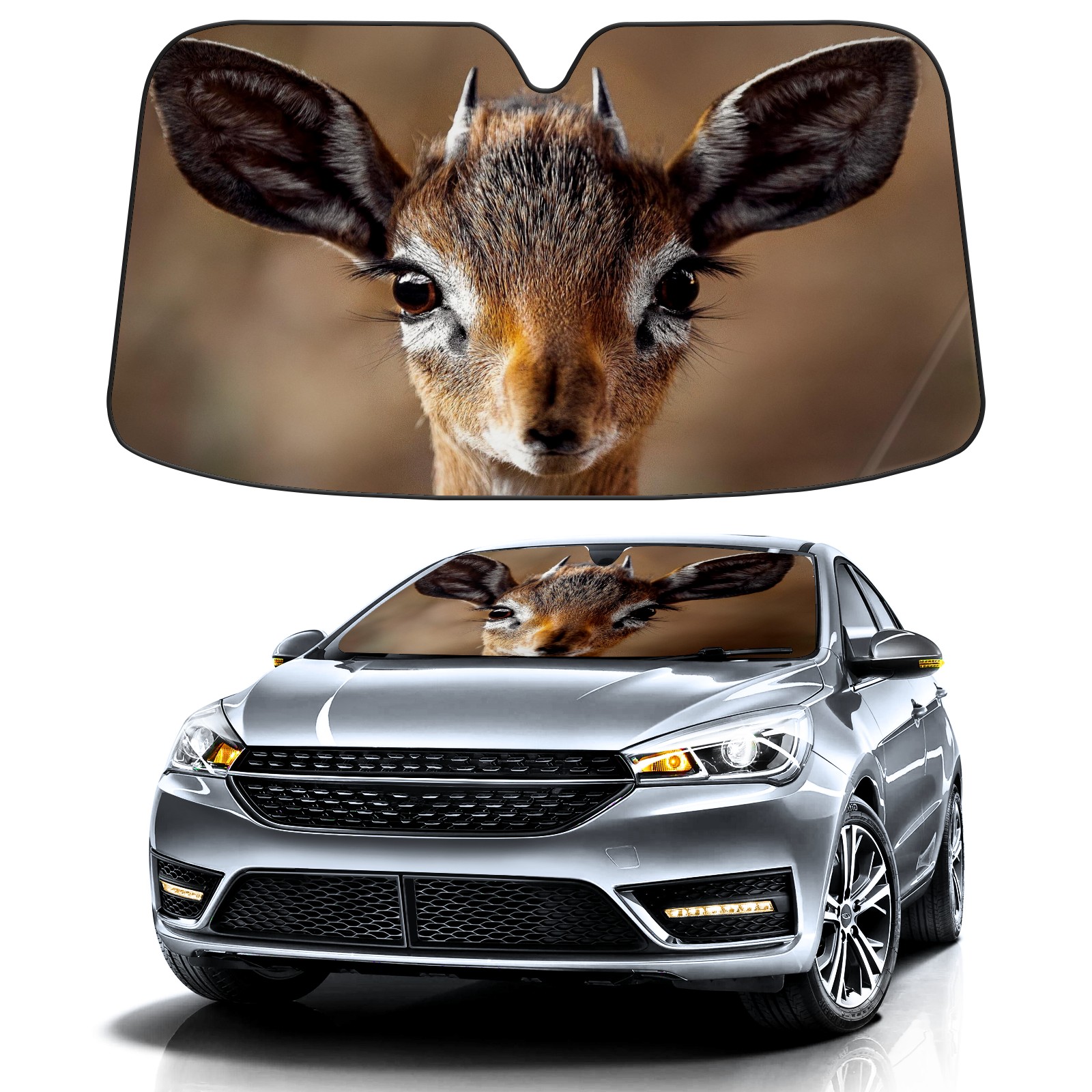 Car Windshield Sun Shade for Front Window-Cute Big Eyed Sika Deer Foldable Sun Visor Cover Sunshade for Car Windshield-Car Heat Shield Sunshade Protector-Car Privacy Sun Blocker