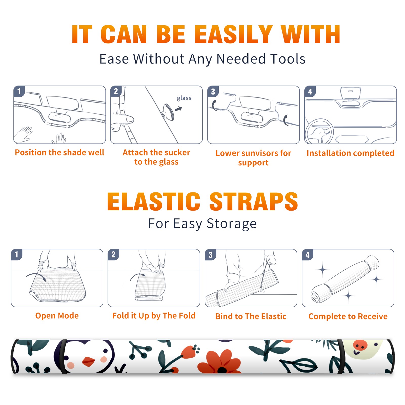 • <b>Foldable Premium Car Windshield Sunshade is your great solution to reduce your car’s interior temperature dramatically!This is definitely a must-have item for your summer travel! </b> <br> ●<b>Size: 55"L x 30"W </b> <br> ●<b>Blocking Uv Rays & Heat Insulation</b><br> Our vehicle sunshade provides effective UV, sun, and summer heat protection .Maintains dashboards by preventing fading and cracking <br> ●<b>Easy-To-Store Folding Design Makes Storage Convenient</b> <br> Car sunshades comes with removable suction cups and elastic bands that you can install or remove easily and quickly. In a matter of seconds you can install your purchased windshield visor. And the detachable suction cups on the automotive's sun visor leave no marks on the windows when removed. When not in use, the front windshield can be conveniently and effectively placed on the door pocket or the dashboard, which is beautiful and does not occupy the interior space.<br> <br> <b>Stay cool and protected this summer with our fun and functional car windshield sun shade!Perfectly crafted to fit most vehicles, this premium quality sun blocker is your go-to automotive accessory. it's time to say goodbye to scorching hot seats and hello to comfort on every drive!</b>