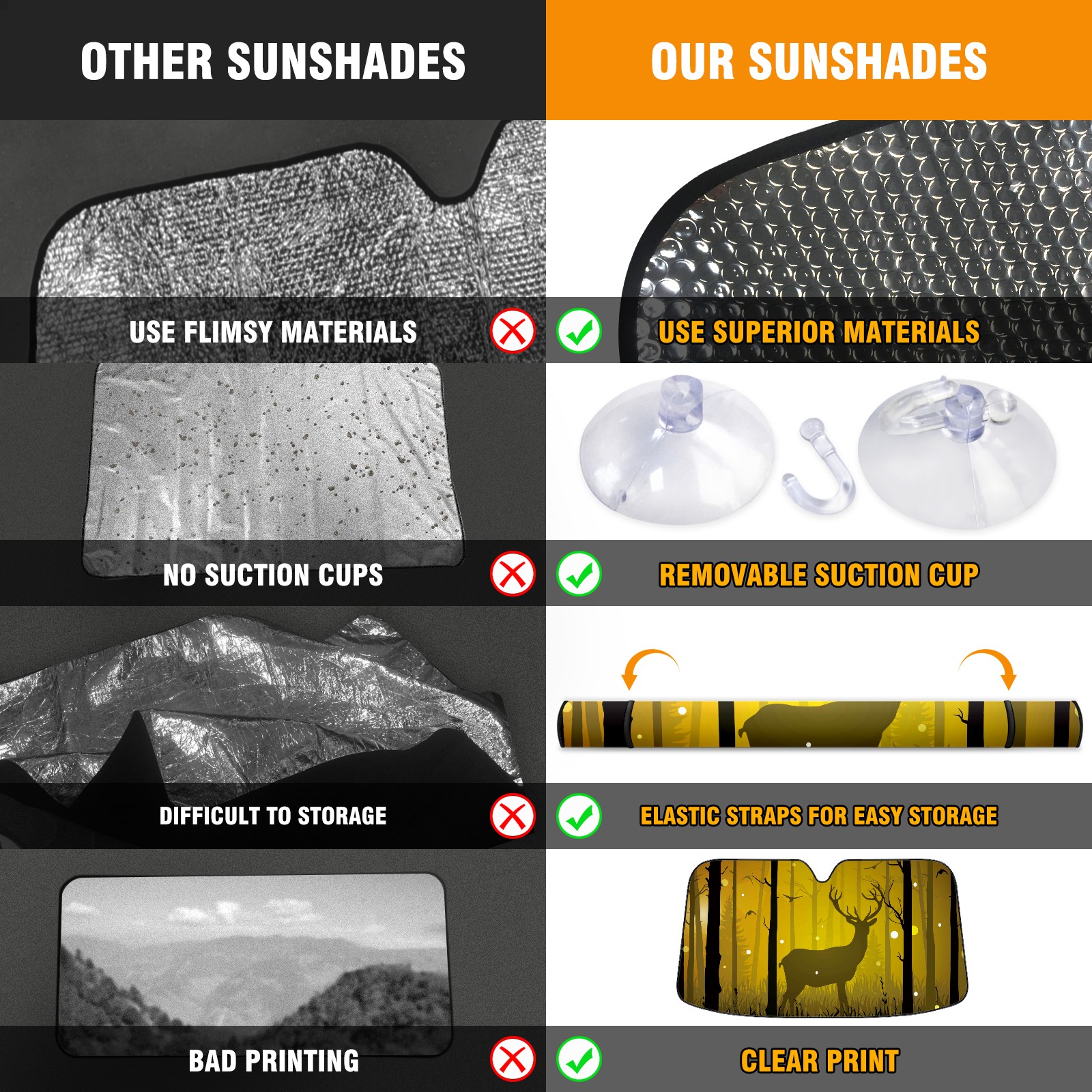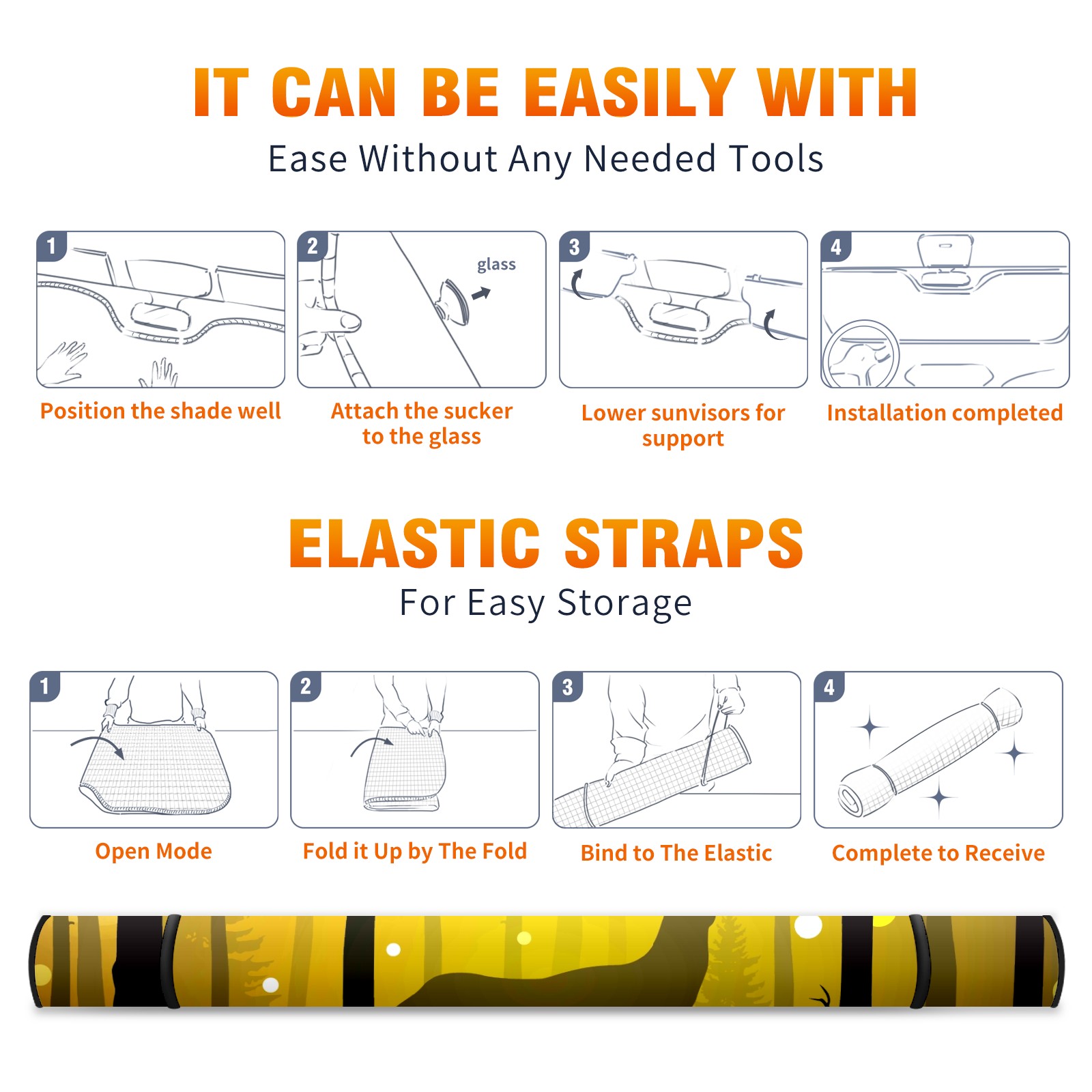 <b>Foldable Premium Car Windshield Sunshade is your great solution to reduce your car’s interior temperature dramatically!This is definitely a must-have item for your summer travel! </b> <br> ●<b>Size: 55"L x 30"W </b> <br> ●<b>Blocking Uv Rays & Heat Insulation</b><br> Our vehicle sunshade provides effective UV, sun, and summer heat protection .Maintains dashboards by preventing fading and cracking <br> ●<b>Easy-To-Store Folding Design Makes Storage Convenient</b> <br> Car sunshades comes with removable suction cups and elastic bands that you can install or remove easily and quickly. In a matter of seconds you can install your purchased windshield visor. And the detachable suction cups on the automotive's sun visor leave no marks on the windows when removed. When not in use, the front windshield can be conveniently and effectively placed on the door pocket or the dashboard, which is beautiful and does not occupy the interior space.<br> <br> <b>Stay cool and protected this summer with our fun and functional car windshield sun shade!Perfectly crafted to fit most vehicles, this premium quality sun blocker is your go-to automotive accessory. it's time to say goodbye to scorching hot seats and hello to comfort on every drive!</b>