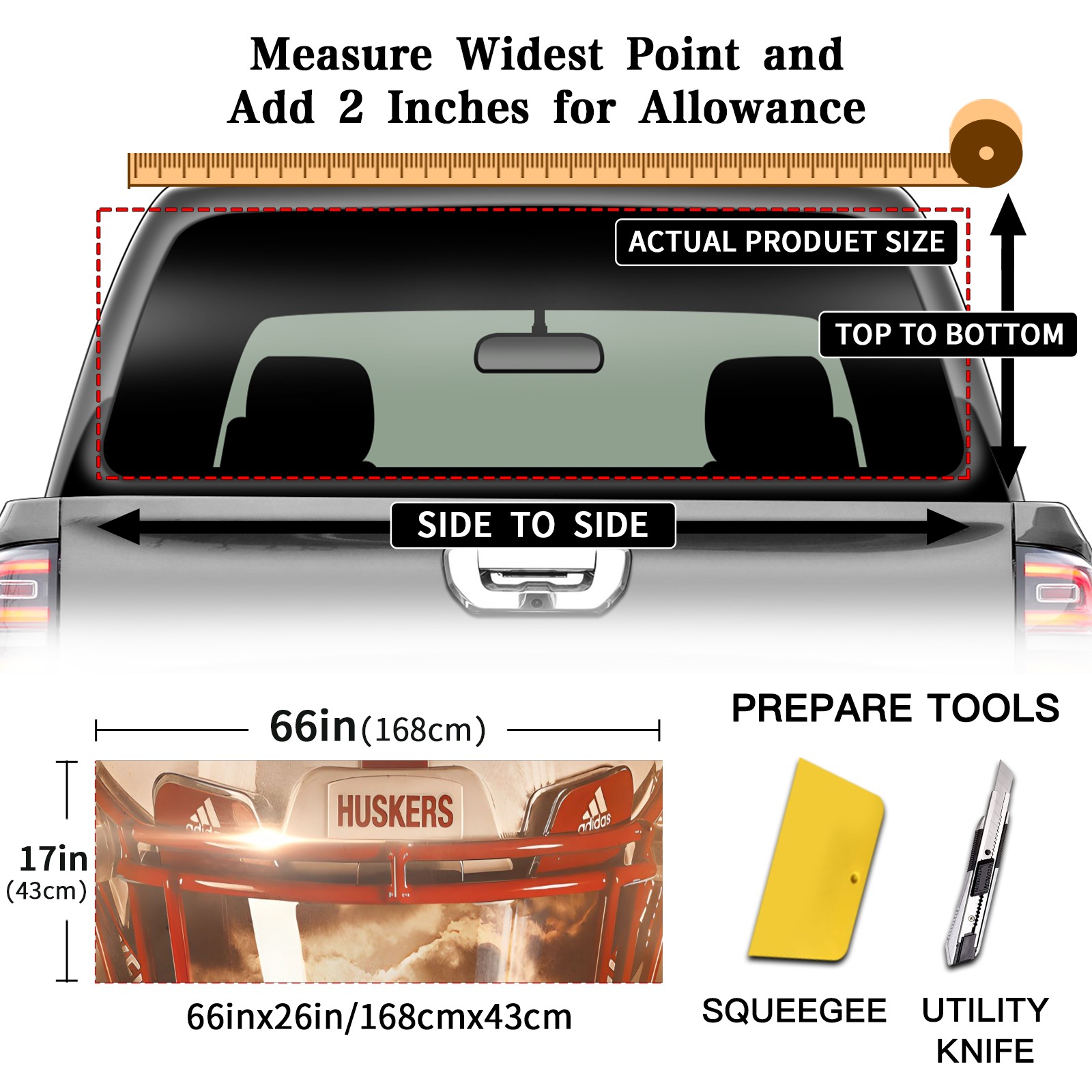 <p><strong>Truck Rear Window Graphics Decals Pickup Trucks Back Window Film Stickers 66" x 22" Perforated Vinyl Wrap Stickers Decorations for Car Rear Window</strong></p><p><strong><br /></strong></p><p><strong>Features :</strong></p><p>- Size of the rear window decals for trucks is 66x22 Inches (168x56cm).</p><p>- High quality perforated vinyl window film, one way vision sticker.</p><p>- Perforated is see through from the inside but not from outside.</p><p>- Clear printing, waterproof and durable.</p><p>- The car back window graphics stickers fits most truck and makes your vehicle more beautiful.&nbsp;</p><p><br /></p><p><strong>【Installation Instructions】</strong></p><p><strong>1. CLEAN SURFACE -</strong> Clean the rear window thoroughly and make sure the surface clean.</p><p><strong>2. STICK THE DECALS -</strong> Tear off the paper on the back and stick the decal on the window.</p><p><strong>3. SCRAPE OFF AIR BUBBLES -</strong> Use a squeegee or other card to scrape off the excess air bubbles.</p><p><strong>4. TRIM THE EXCESS -</strong> Use a knife to cut off the excess stickers of the window, finally complete.</p><p><br /></p><p>1. Please measure the size before purchasing, back window graphics decal for truck can be cut to your desired size.</p><p>2.The graphics stickers for truck back window is a great gift for yourself also can as a birthday / halloween / christmas gift for your friends and family.</p>
