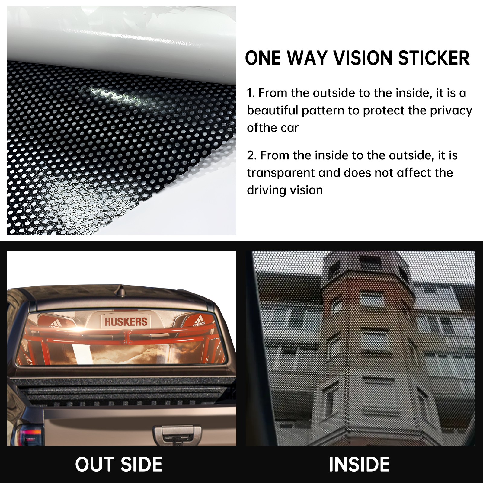 • <p><strong>Truck Rear Window Graphics Decals Pickup Trucks Back Window Film Stickers 66" x 22" Perforated Vinyl Wrap Stickers Decorations for Car Rear Window</strong></p><p><strong><br /></strong></p><p><strong>Features :</strong></p><p>- Size of the rear window decals for trucks is 66x22 Inches (168x56cm).</p><p>- High quality perforated vinyl window film, one way vision sticker.</p><p>- Perforated is see through from the inside but not from outside.</p><p>- Clear printing, waterproof and durable.</p><p>- The car back window graphics stickers fits most truck and makes your vehicle more beautiful.&nbsp;</p><p><br /></p><p><strong>【Installation Instructions】</strong></p><p><strong>1. CLEAN SURFACE -</strong> Clean the rear window thoroughly and make sure the surface clean.</p><p><strong>2. STICK THE DECALS -</strong> Tear off the paper on the back and stick the decal on the window.</p><p><strong>3. SCRAPE OFF AIR BUBBLES -</strong> Use a squeegee or other card to scrape off the excess air bubbles.</p><p><strong>4. TRIM THE EXCESS -</strong> Use a knife to cut off the excess stickers of the window, finally complete.</p><p><br /></p><p>1. Please measure the size before purchasing, back window graphics decal for truck can be cut to your desired size.</p><p>2.The graphics stickers for truck back window is a great gift for yourself also can as a birthday / halloween / christmas gift for your friends and family.</p>